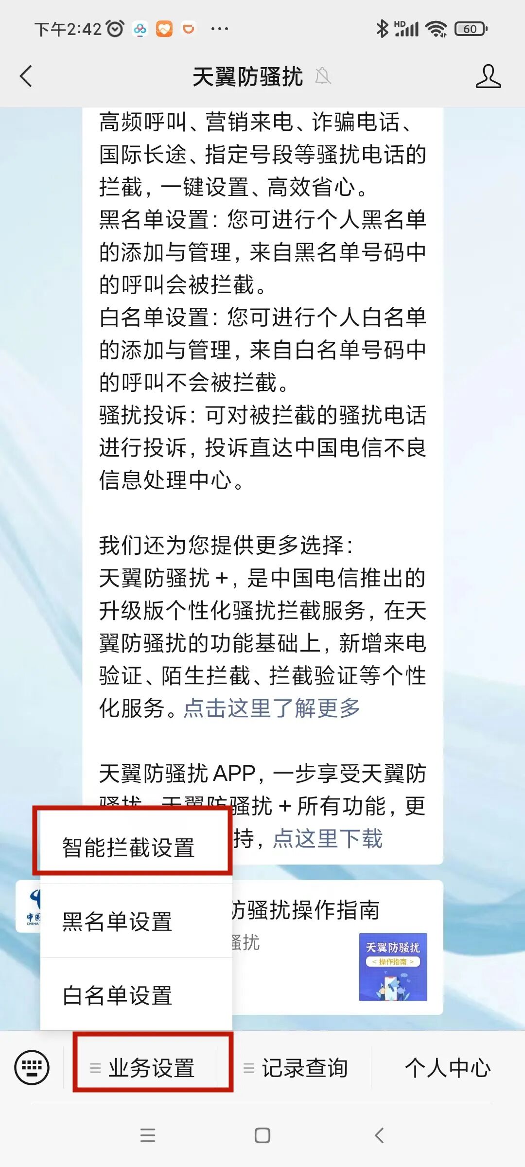 2. 点击下方“业务设置”功能,选择“智能拦截设置”。