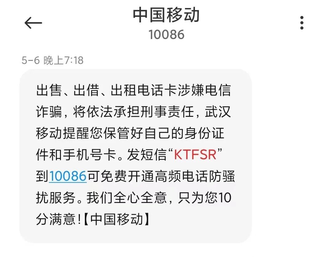 1. 中国移动用户编写短信“KTFSR”发送至10086,按短信提示可免费开通“高频骚扰电话拦截”业务。
