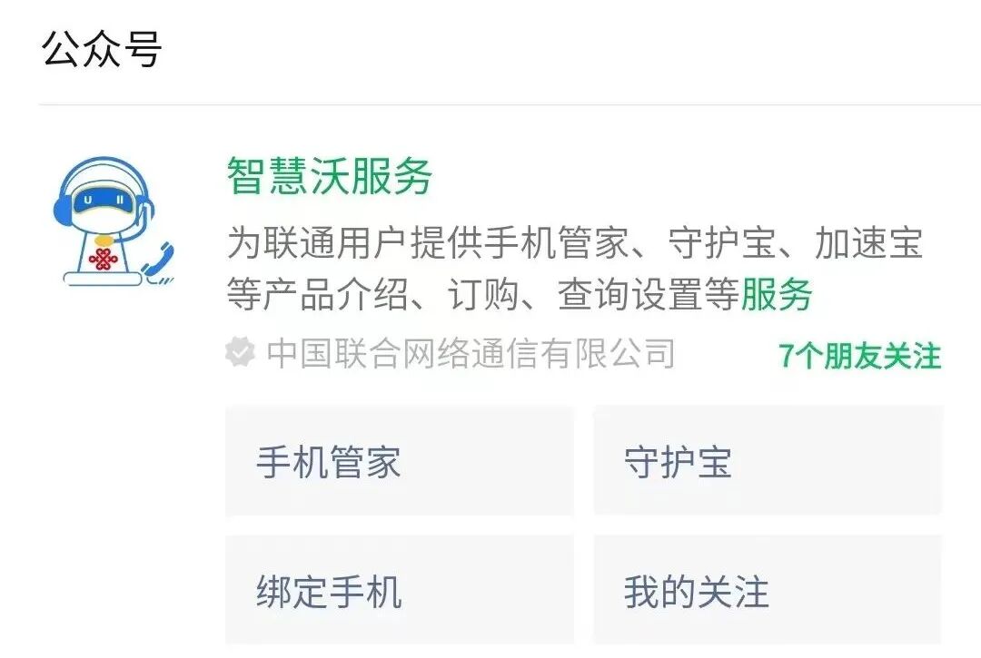 1.中国联通用户打开手机微信搜索并关注公众号“智慧沃服务”。