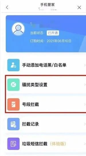 3.开通“号码拦截”服务,选择开启“国际电话”的拦截功能。如果想拦截别的类型的骚扰电话,可开启对应号段的拦截功能。