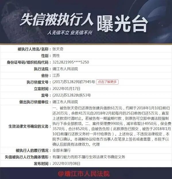 张天奇(四)被执行人失信行为的具体情形;