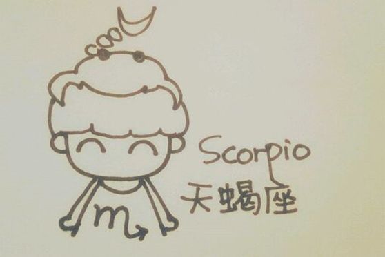 天蝎座(10月24日-11月22日):图片上的小男孩头顶蝎子,衣服上画着天蝎座标志,天蝎座是十二星座中智商最高的星座,心思缜密,观察力强,对复杂的事物都能通过观察洞悉全局。
