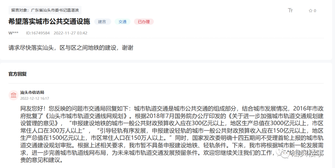 日前,有网友在问政平台提议完善汕头公共交通建设,在区与区之间修建地铁。城市轨道交通是城市公共交通的组成部分,结合城市发展情况,2016年市政府批复了《汕头市城市轨道交通线网规划》。根据2018年7月国务院办公厅印发的《关于进一步加强城市轨道交通规划建设管理的意见》,“申报建设地铁的城市一般公共财政预算收入应在300亿元以上,地区生产总值在3000亿元以上,市区常住人口在300万人以上”,“引导轻轨有序发展,申报建设轻轨的城市一般公共财政预算收入应在150亿元以上,地区生产总值在1500亿元以上,市区常住人口在150万人以上。”同时,国家发改委明确十四五期间不受理首轮上报的城市轨道交通建设规划审批。根据上述相关要求,汕头市暂不具备申报建设地铁、轻轨条件。下来,汕头将根据城市新一轮发展需求,进一步完善城市轨道线网布局,为未来城市轨道交通发展预留条件。虽说汕头新建“地铁”、“轻轨”的梦想在短时间内已无法实现,但连接潮汕三市中心城区的粤东城际铁路已经是实打实的开工建设中了。
