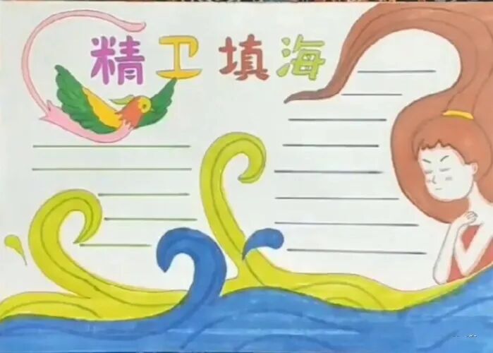“精卫填海”是中国上古神话传说,故事讲述了炎帝神农之女——女娃溺死于东海,死后化为精卫鸟,日夜衔石填海的故事。故事刻画了英勇顽强的精卫形象,表达了古代劳动人民探索自然、征服自然、治理水患的强烈愿望和不畏艰苦的奋斗精神。