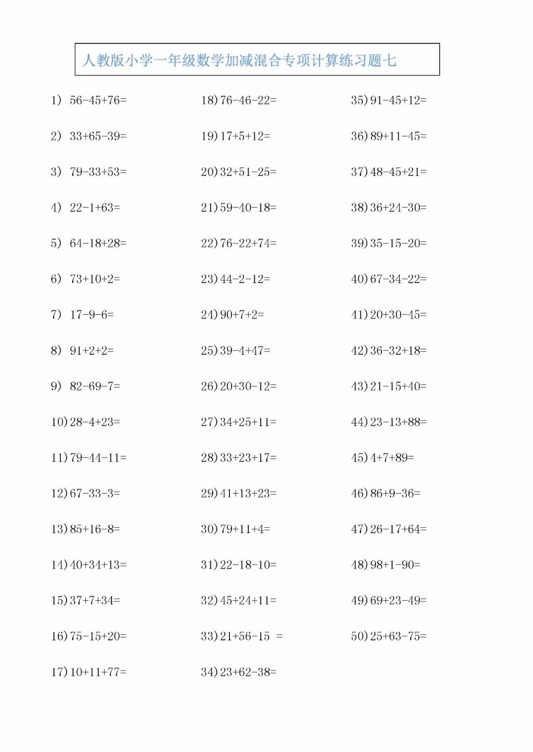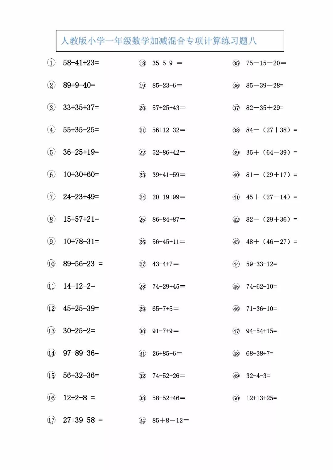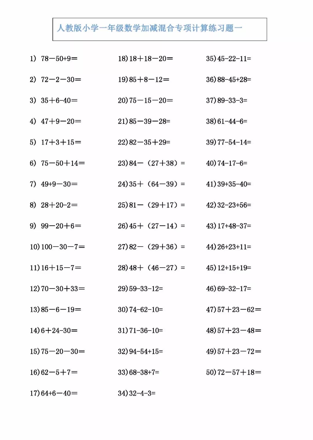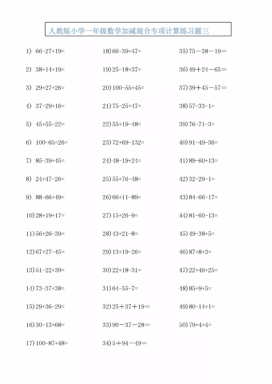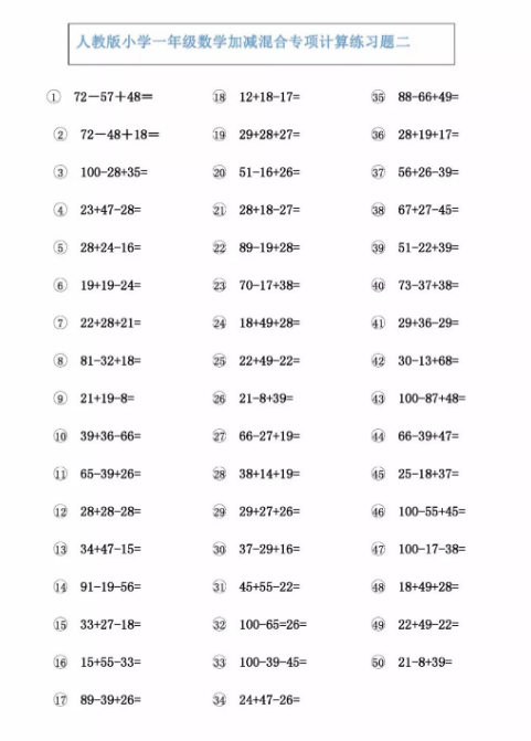王老师今天整理了一年级数学下册100以内加减法速算口诀+练习题,家长们可以打印让孩子做一做,提高计算能力必练! 手指计算口诀 1手指定位口诀 我有一双手,代表九十九;左手定十位,九十我会数; 右手定个位,从一数到九;加减很方便,计算不用愁。 2手指定数口诀 食指伸开“l”,中指伸开“2”; 无名指为“3”,小指伸开“4”; 四指一握伸拇指,拇指是“5”要记住; 再伸食指到小指,“6”“7”“8”“9”排成数。 3右手出指练习口诀 一马当先,二虎相争,三言两语,四海为家,五谷丰登, 六畜兴旺,七上八下,八仙过海,九牛一毛,十万火急。 一言九鼎,二龙戏珠,三足鼎立,四面楚歌,五谷丰登, (注:念到“十万火急”或“十全十美”时,右手握拳,左手出“1”,代表进位。) 4左手出指练习口诀 一百以内的加减法一十,二十,三十,四十;五十, 六十,七十,八十,九十,一百。 (注:念到“一百”时,双手击掌,然后紧握双拳在胸前。) 5双手出数练习 15、23、46、99、58、73、61 …… (注:根据各年龄段幼儿认知水平,选择出数的大小。) 6加法练习 注意:在做加法练习时,比如“3+5”,右手先出“3”,“+5”的过程是:嘴里念“加1”,出小拇指;嘴里念“加2”,四指一提伸大拇指(注意在出指的过程中大拇指只代表“1”,只有在定数的时候,大拇指才当成“5”);嘴里念“加3”,出食指;嘴里念“加4”,出中指;嘴里念“加5”,出无名指。此时开始定数,右手手指只有小拇指未打开,结果即为“8”。 10以内加法口诀表 1+ 1= 2 1+ 2= 3 2+ 2= 4 1+ 3= 4 2+ 3= 5 3+ 3= 6 1+ 4= 5 2+ 4= 6 3+ 4= 7 4+ 4= 8 1+ 5= 6 2+ 5= 7 3+ 5= 8 4+ 5= 9 5+ 5=10 1+ 6= 7 2+ 6= 8 3+ 6= 9 4+ 6=10 5+ 6=11 6+ 6=12 1+ 7= 8 2+ 7= 9 3+ 7=10 4+ 7=11 5+ 7=12 6+ 7=13 7+ 7=14 1+ 8= 9 2+ 8=10 3+ 8=11 4+ 8=12 5+ 8=13 6+ 8=14 7+ 8=15 8+ 8=16 1+ 9=10 2+ 9=11 3+ 9=12 4+ 9=13 5+ 9=14 6+ 9=15 7+ 9=16 8+ 9=17 9+ 9=18 9+10=19 10+10=20 20以内加法口诀表 1+11=12 2+11=13 3+11=14 4+11=15 5+11=16 6+11=17 7+11=18 8+11=19 9+11=20 1+12=13 2+12=14 3+12=15 4+12=16 5+12=17 6+12=18 7+12=19 8+12=20 1+13=14 2+13=15 3+13=16 4+13=17 5+13=18 6+13=19 7+13=20 1+14=15 2+14=16 3+14=17 4+14=18 5+14=19 6+14=20 1+15=16 2+15=17 3+15=18 4+15=19 5+15=20 1+16=17 2+16=18 3+16=19 4+16=20 1+17=18 2+17=19 3+17=20 1+18=19 2+18=20 1+19=20 30以内加法口诀表 1+21=22 2+21=23 3+21=24 4+21=25 5+21=26 6+21=27 7+21=28 8+21=29 9+21=30 1+22=23 2+22=24 3+22=25 4+22=26 5+22=27 6+22=28 7+22=29 8+22=30 1+23=24 2+23=25 3+23=26 4+23=27 5+23=28 6+23=29 7+23=30 1+24=25 2+24=26 3+24=27 4+24=28 5+24=29 6+24=30 1+25=26 2+25=27 3+25=28 4+25=29 5+25=30 1+26=27 2+26=28 3+26=29 4+26=30 1+27=28 2+27=29 3+27=30 1+28=29 2+28=30 1+29=30 40以内加法口诀表 1+31=32 2+31=33 3+31=34 4+31=35 5+31=36 6+31=37 7+31=38 8+31=39 9+31=40 1+32=33 2+32=34 3+32=35 4+32=36 5+32=37 6+32=38 7+32=39 8+32=40 1+33=34 2+33=35 3+33=36 4+33=37 5+33=38 6+33=39 7+33=40 1+34=35 2+34=36 3+34=37 4+34=38 5+34=39 6+34=40 1+35=36 2+35=37 3+35=38 4+35=39 5+35=40 1+36=37 2+36=28 3+36=39 4+36=40 1+37=38 2+37=39 3+37=40 1+38=39 2+38=40 1+39=40 50以内加法口诀表 1+41=42 2+41=43 3+41=44 4+41=45 5+41=46 6+41=47 7+41=48 8+41=49 9+41=50 1+42=43 2+42=44 3+42=45 4+42=46 5+42=47 6+42=48 7+42=49 8+42=50 1+43=44 2+43=45 3+43=46 4+43=47 5+43=48 6+43=49 7+43=50 1+44=45 2+44=46 3+44=47 4+44=48 5+44=49 6+44=50 1+45=46 2+45=47 3+45=48 4+45=49 5+45=50 1+46=47 2+46=48 3+46=49 4+46=50 1+47=48 2+47=49 3+47=50 1+48=49 2+48=50 1+49=50 60以内加法口诀表 1+51=52 2+51=53 3+51=54 4+51=55 5+51=56 6+51=57 7+51=58 8+51=59 9+51=60 1+52=53 2+52=54 3+52=55 4+52=56 5+52=57 6+52=58 7+52=59 8+52=60 1+53=54 2+53=55 3+53=56 4+53=57 5+53=58 6+53=59 7+53=60 1+54=55 2+54=56 3+54=57 4+54=58 5+54=59 6+54=60 1+55=56 2+55=57 3+55=58 4+55=59 5+55=60 1+56=57 2+56=58 3+56=59 4+56=60 1+57=58 2+57=59 3+57=60 1+58=59 2+58=60 1+59=60 70以内加法口诀表 1+61=62 2+61=63 3+61=64 4+61=65 5+61=66 6+61=67 7+61=68 8+61=69 9+61=70 1+62=63 2+62=64 3+62=65 4+62=66 5+62=67 6+62=68 7+62=69 8+62=70 1+63=64 2+63=65 3+63=66 4+63=67 5+63=68 6+63=69 7+63=70 1+64=65 2+64=66 3+64=67 4+64=68 5+64=69 6+64=70 1+65=66 2+65=67 3+65=68 4+65=69 5+65=70 1+66=67 2+66=68 3+66=69 4+66=70 1+67=68 2+67=69 3+67=70 1+68=69 2+68=70 1+69=70 80以内加法口诀表 1+71=72 2+71=73 3+71=74 4+71=75 5+71=76 6+71=77 7+71=78 8+71=79 9+71=80 1+72=73 2+72=74 3+72=75 4+72=76 5+72=77 6+72=78 7+72=79 8+72=80 1+73=74 2+73=75 3+73=76 4+73=77 5+73=78 6+73=79 7+73=80 1+74=75 2+74=76 3+74=77 4+74=78 5+74=79 6+74=80 1+75=76 2+75=77 3+75=78 4+75=79 5+75=80 1+76=77 2+76=78 3+76=79 4+76=80 1+77=78 2+77=79 3+77=80 1+78=79 2+78=80 1+79=80 90以内加法口诀表 1+81=82 2+81=83 3+81=84 4+81=85 5+81=86 6+81=87 7+81=88 8+81=89 9+81=90 1+82=83 2+82=84 3+82=85 4+82=86 5+82=87 6+82=88 7+82=89 8+82=90 1+83=84 2+83=85 3+83=86 4+83=87 5+83=88 6+83=89 7+83=90 1+84=85 2+84=86 3+84=87 4+84=88 5+84=89 6+84=90 1+85=86 2+85=87 3+85=88 4+85=89 5+85=90 1+86=87 2+86=88 3+86=89 4+86=90 1+87=88 2+87=89 3+87=90 1+88=89 2+88=90 1+89=90 100以内加法口诀表 1+91=92 2+91=93 3+91=94 4+91=95 5+91=96 6+91=97 7+91=98 8+91=99 9+91=100 1+92=93 2+92=94 3+92=95 4+92=96 5+92=97 6+92=98 7+92=99 8+92=100 1+93=94 2+93=95 3+93=96 4+93=97 5+93=98 6+93=99 7+93=100 1+94=95 2+94=96 3+94=97 4+94=98 5+94=99 6+94=100 1+95=96 2+95=97 3+95=98 4+95=99 5+95=100 1+96=97 2+96=98 3+96=99 4+96=100 1+97=98 2+97=99 3+97=100 1+98=99 2+98=100 1+99=100 练习题