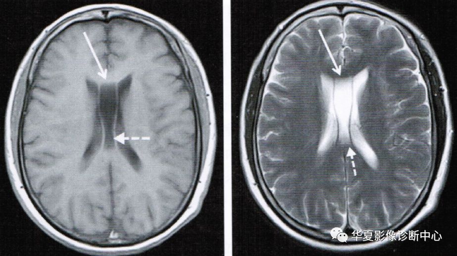 上图为第五脑室(实箭头)、第六脑室(虚箭头)
