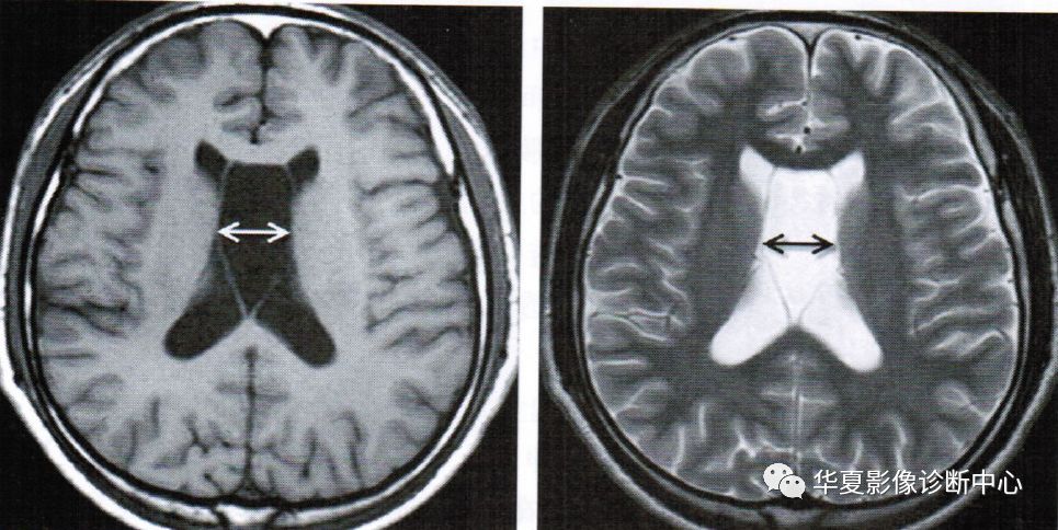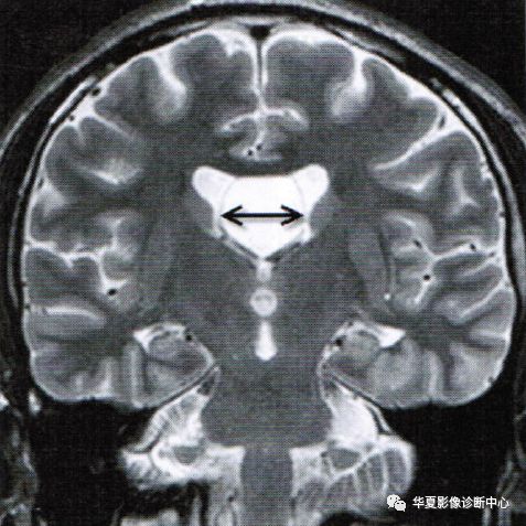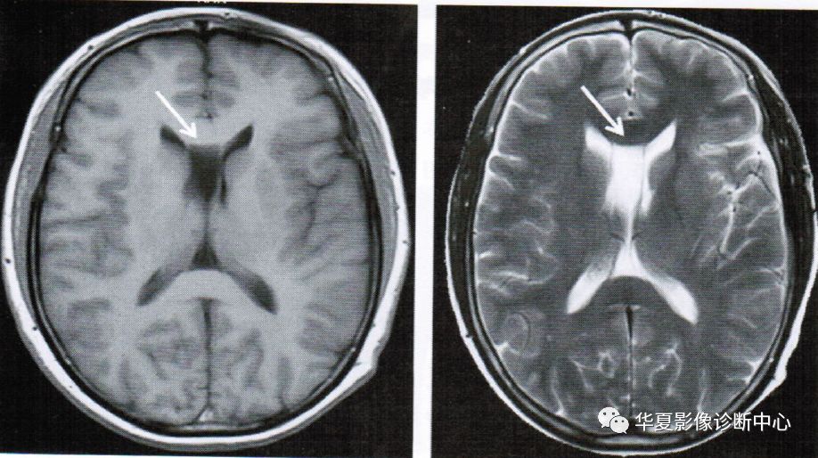 透明隔间腔出现在第三脑室上部层面,位于侧脑室额角之间,呈条带状、三角形、类梯形脑脊液密度,边界清楚,两侧壁多平行向后直抵侧脑室室间孔,两侧壁之间宽度最少要>1mm且<10mm