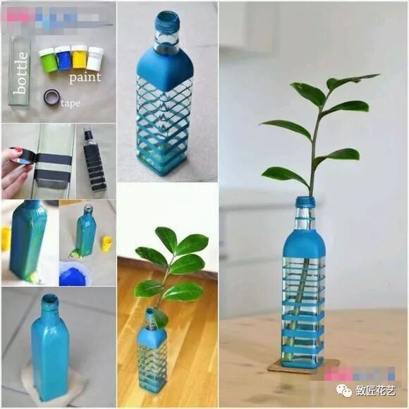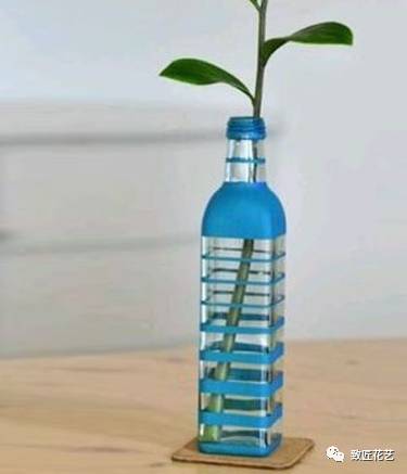 把胶带如图方式粘在塑料瓶上,然后涂上染料,等染料干后再撕下胶带,一个简约时尚的花瓶就制作完成了。