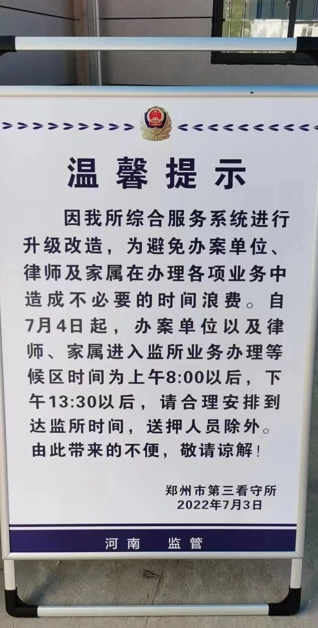 【温馨提示】因因我所综合服务系统进行升级改造,为避免办案单位、律师及家属在办理各项业务中造成不必要的时间浪费。自7月4日起,办案单位以及律师、家属进入监所业务办理等候区时间为上午8:00以后,下午13:30以后,请合理安排到达监所时间,送押人员除外。由此带来的不便,敬请谅解!郑州市第三看守所2022年7月3日