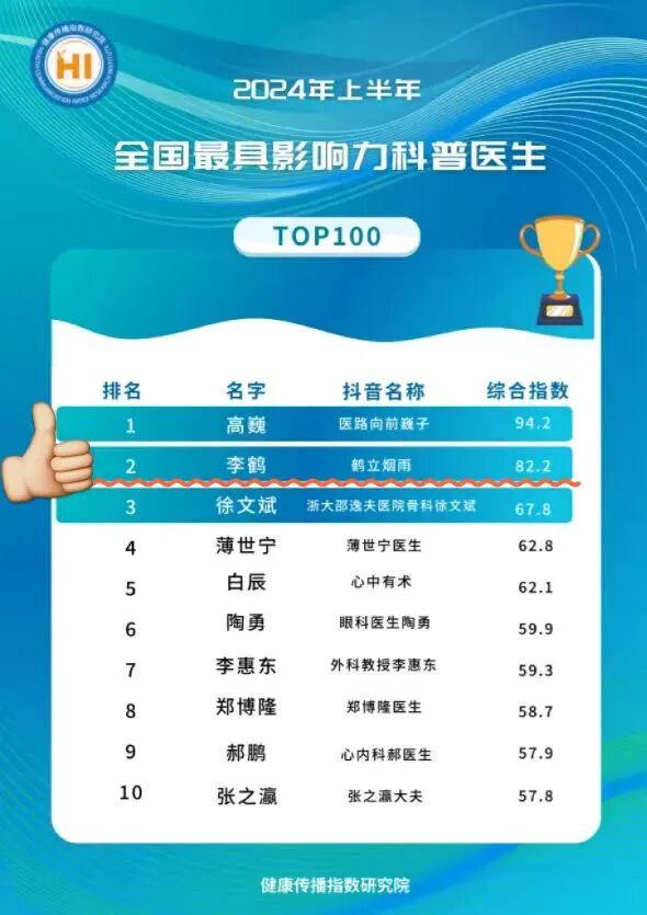 近日,国家卫生健康委党组书记、主任雷海潮在接受新华社记者采访时提出,要鼓励医务人员积极参与健康宣教,让更多的健康知识“飞入寻常百姓家”,让公众掌握更多健康技能,努力控制主要健康影响因素和危害人类健康的重大疾病。医生在健康科普工作者的重要性被提升到一个新的高度。“最具影响力健康科普医生TOP100榜单”正是在这样的大背景下推出的。