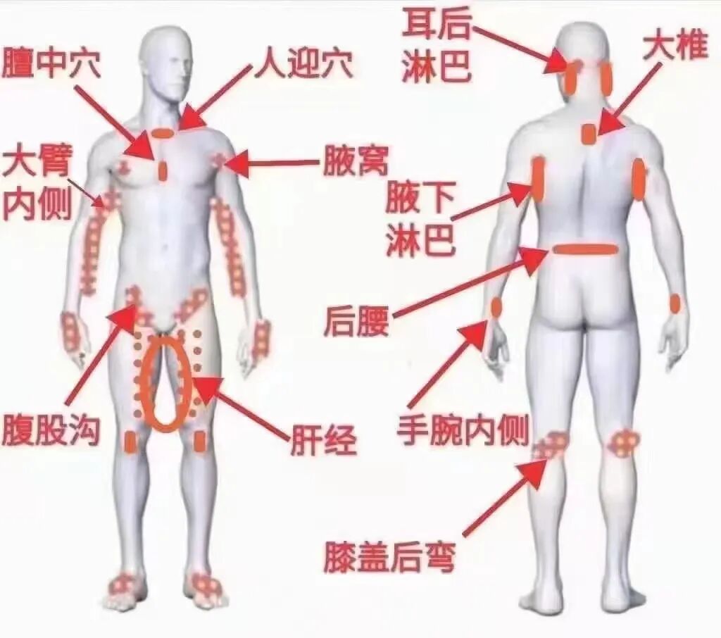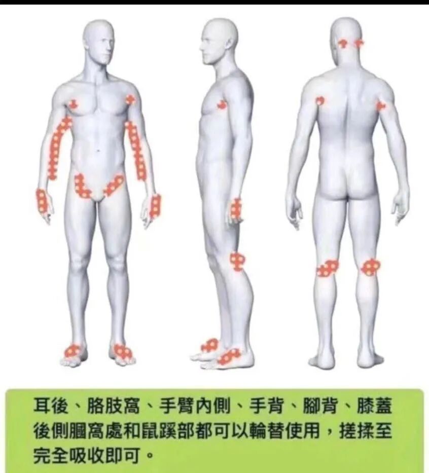 ?还可以涂抹在耳后、颈部、腋下、手背、腹股沟处、膝盖后窝处、脚踝、脚背处等。
