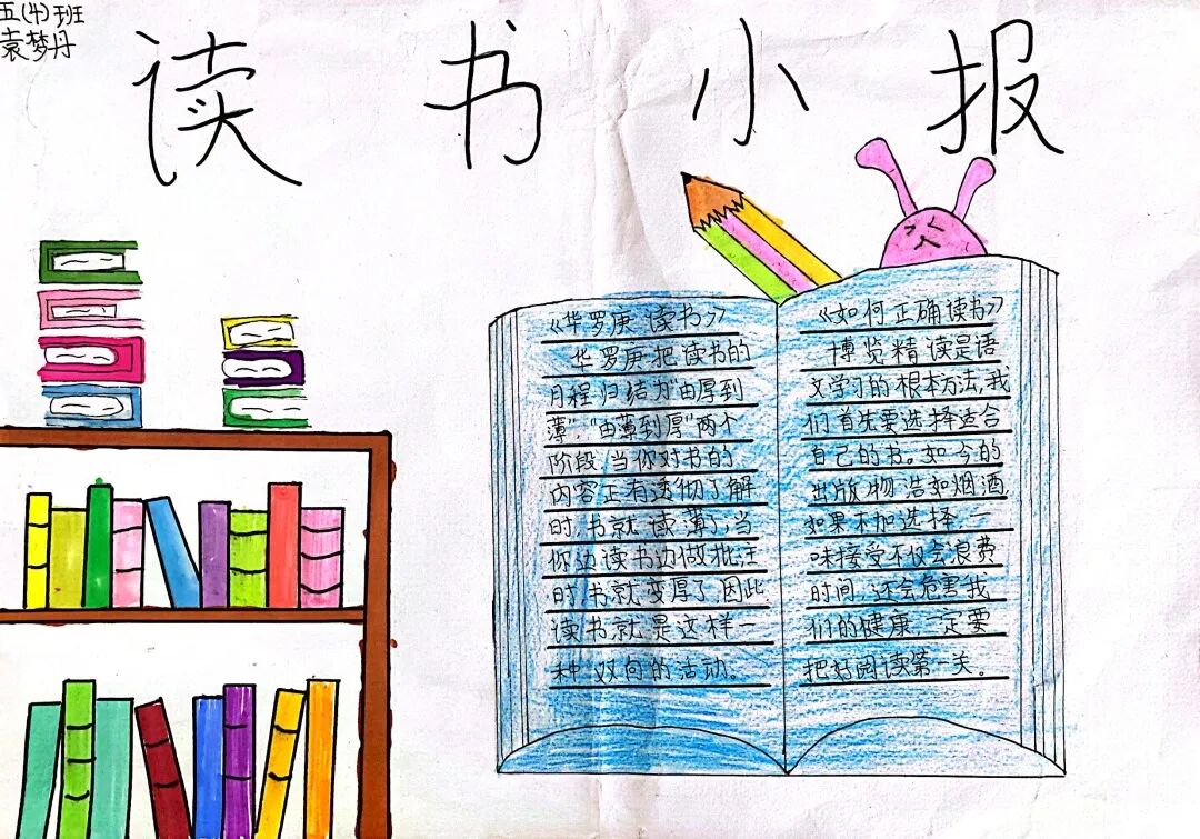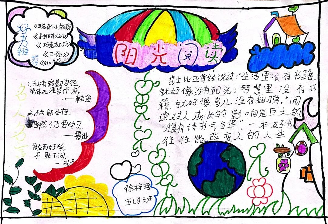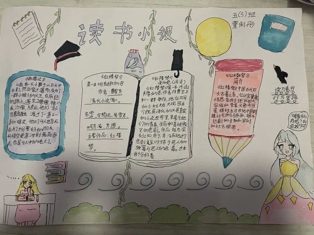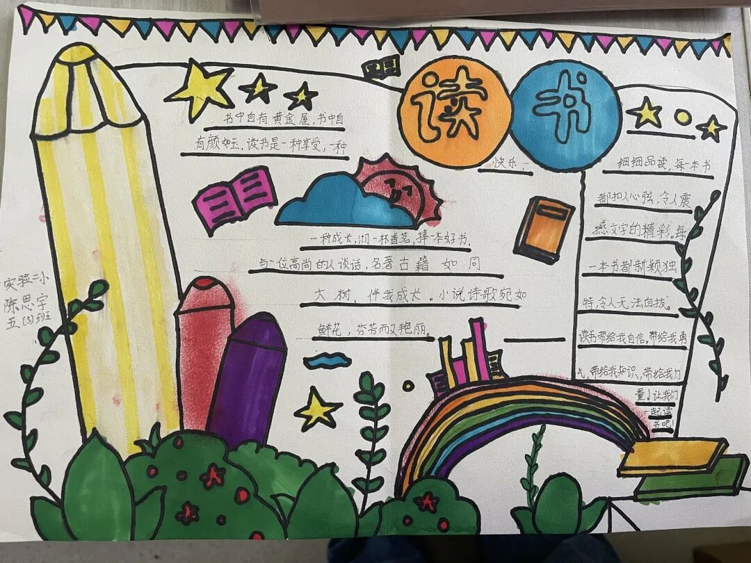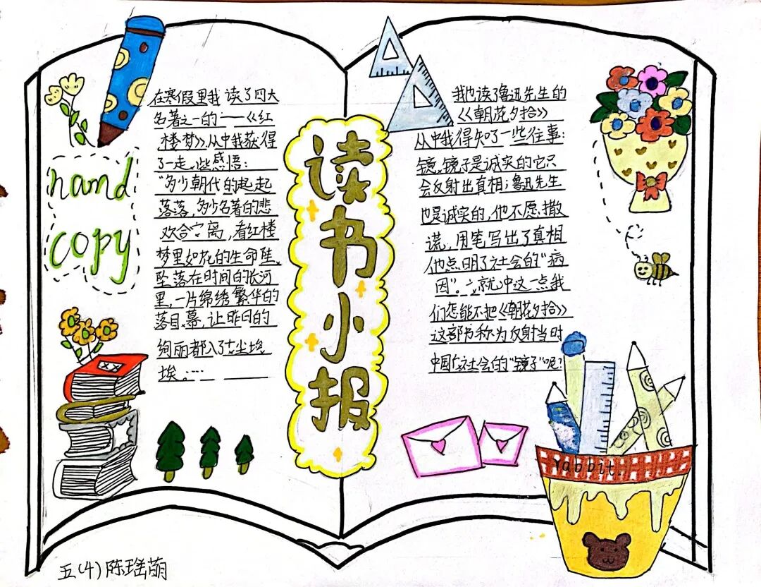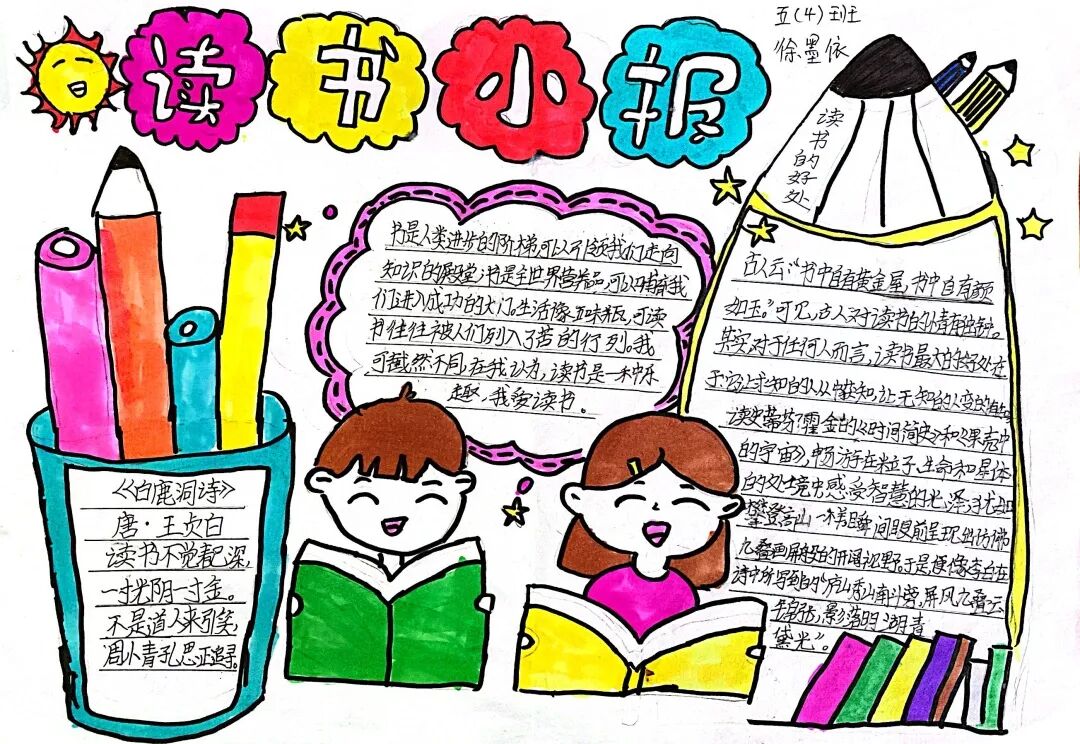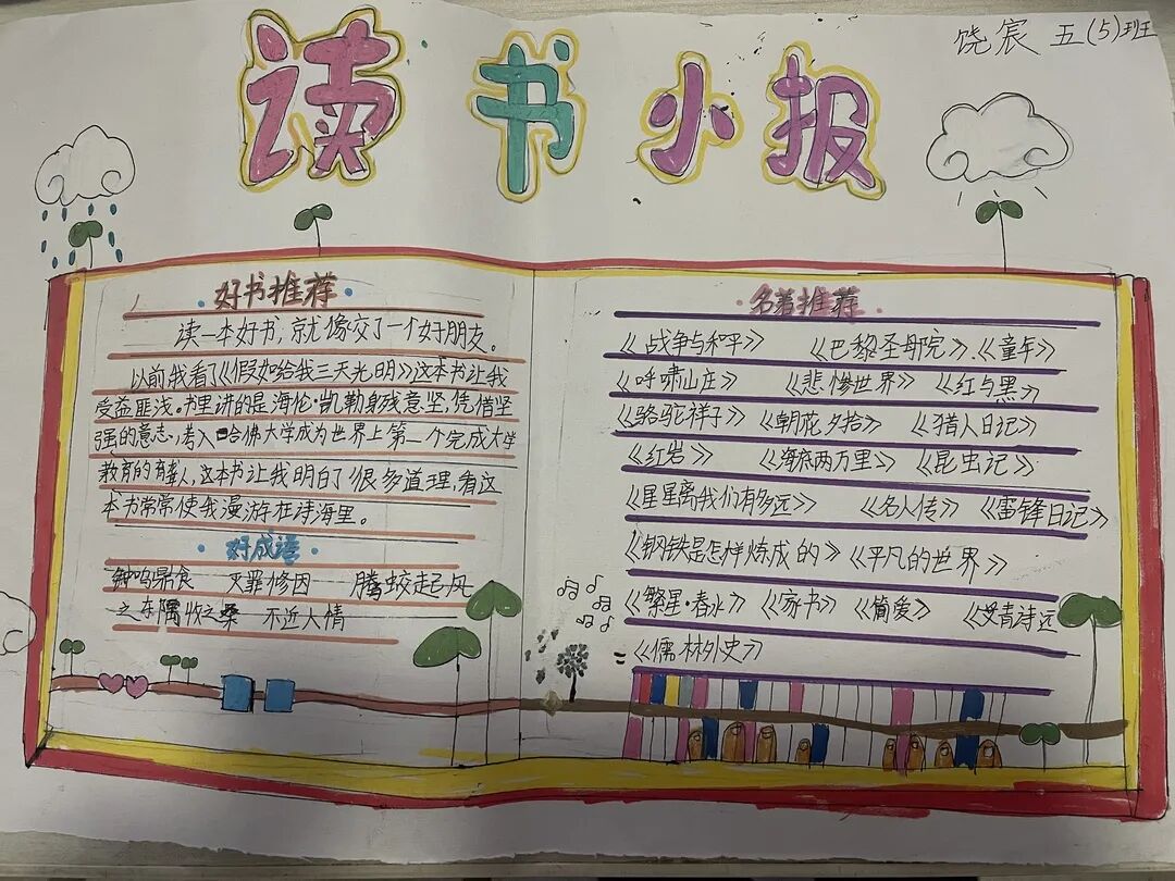 五年级读书手抄报 陶行知说过:“活的人才教育不是灌输知识,而是将开发文化宝库的钥匙,尽我们知道的交给学生。” 春遇见冬,有了岁月;假期遇见阅读,平添了一些意境;人遇见书籍,有了心灵世界。在这个冬天,孩子们找到了被人生偷藏起来的糖果,亦找到了一片属于自己独一无二的风景。阅尽祖国的波澜壮阔,读过作家笔下一个个灵动的文字,是给自己最好的礼物。 寒假静悄悄的进入尾声,新学期吹响了战斗的号角。 实验二小五年级学生纷纷展示假期阅读成果,这是一个书香四溢的假期,也是一个硕果累累的假期。在师生共同努力下,各班级遴选出了优秀作品。 从綦雅晗同学色彩斑斓的读书小报可以直观的感受到假期阅读的快乐。正所谓“读书不要贪多,而是要多加思索”。《列那狐的故事》她读出了自己的见解:做人要诚实守信,要把聪明用在正道上。 舒婉茹同学的读书小报非常符合魔幻文学系列小说《哈利波特》的形象,黑白色的城堡、色彩鲜明的标志。读过这本书,就像打开了新世界的大门,巫师世界的魔法让孩子们拥有爱与勇气的能力。 《列那狐的故事》在张烯怡同学笔下,构图有了童话般的意境,狐狸的造型非常生动形象。作品展示了两个关于列那狐的小故事,让我们感受到了列那狐的智慧。 一笔一划的文字配上精美的图片排版,不禁让人感叹鲁晗玥同学对待作品的别出心裁。认真的小朋友在假期不仅阅读了《巴黎圣母院》、《鲁滨逊漂流记》、《山羊不吃天堂草》,还积累了文中好句,想必寒假收货颇多呢! 看见胡钰琪同学的读书小报,一定能猜出她是一个充满爱和想象力的孩子。可爱的手绘动物、栩栩如生的花朵、隽秀的字迹,构成了小女孩阅读的童话天堂。她不仅寒假读完了两本书,还给新学期制定了再读两本书的目标,真是太棒啦! “孙悟空”带我们去西天取了一回真经——冯晨希同学以独特的视角,笔下生出一个小孙悟空,带领我们见识了《西游记》中唐三藏师徒一行人去西天取经的行动轨迹。 胡恩婕同学以排比句开头,表达了自己对读书的热爱。唯有知识偷不走,相信爱读书的小朋友平时一定读了很多有意义的书籍,不然笔下的文字怎么读起来那么富有感情呢! 玉户临风迎兔入,高楼揽月接春来。胡婧沂同学将手抄报绘出了浓浓的年味。她寒假读了一本有意义的书:《生命的秘密——从草履虫到达尔文》,这本书讲述了生命的演变是多么的神奇与漫长。我们要尊重生命、尊重自然、尊重科学。 李双双同学发自内心的给我们介绍了“人为什么要读书?”是的,书籍是良师益友,它能让人有不断向上的力量,让我们站在巨人的肩膀上,让我们有做出选择的能力。 明亮的背景色,鲜艳的小太阳,闪耀的星星,李思远同学的手绘报仿佛把人带入粉红乐园。却又清晰的列出“博观而约取,厚积而薄发”等醒目名言。 所谓小报就是交流,囊括中外读书名言、好书推荐,用极简的方式告诉大人、小孩子阅读的意义。徐梓琦同学绘画的景物色泽饱满,很棒! 四大名著之一《红楼梦》,道尽人生的悲欢离合,繁华过后终究是红楼梦一场。《朝花夕拾》收录了鲁迅童年和青年的故事,早晨的花儿等到傍晚摘,幼年的事等到晚年回想。陈瑶萌同学以简短的语言,涵盖了对两部文学作品的感悟,令人心生敬佩! 正如程清芸同学读书小报所写:“鸟欲高飞先振翅,人求上进先读书”。她的作品思路清晰,直截了当的列出读书名言、读书的好处、好书推荐。让人直观的感受到小朋友对快乐阅读含义的深刻理解。 “书中自有黄金屋,书中自有颜如玉。”徐墨依同学一定在书中找到了自己“黄金屋”,不仅阅览诗句,还在史蒂芬·霍金的文学作品中探索宇宙物理的奥秘。 摆放有序的书籍,绛红色的书柜,仿佛带人进入了浩如烟海的图书馆。袁梦丹同学介绍了阅读的方法:选择适合自己的书。阅读高质量的书籍有助于孩子的成长进步,多读书、读好书。 看,是哪位小朋友这么认真呢!谢梓涵同学用彩红线条勾勒出了五年级上学期的语文知识点导图,让我们一同回忆起在校园上课的美好时光。将“旧书不厌百回读,熟读深思子自知”体现的淋漓尽致。 一首脍炙人口的《劝学》,瞬间把记忆拉回儿时的课堂,“黑发不知勤学早,白首方悔读书迟”。南雨欣同学的作品绘画出了小动物可爱的造型,画面很清新,富有童话世界色彩。 一支酷似擎天之柱的笔,撑起了阅读的天堂。陈思宇同学发挥想象力,纸笔立于天地之间,在阅读的世界里,连太阳和星星都成了点缀。 胡曼芸同学的作品给人一种深海探险寻宝的氛围感,流畅的线条、粗细变化的海浪,很生动的表达了知识的海洋应该有的模样。大胆单纯的画面构成,微妙丰富的层次变化,整幅画面看起来非常舒适。 饶宸同学的作品繁简结合,简洁明亮的线条、饱含知识的书籍推荐,使得画面很和谐。让大家一眼就收获到了这么多中外名著呢! 董俐彤小朋友作品中的物体造型非常有趣,线条和涂色都很棒。她寒假阅读了四大名著中的《红楼梦》和《西游记》,并写出了读《红楼梦》的感想,真是个认真的好孩子! 我读书,我快乐!张凌烽同学以有趣的图画、灵动的文字描绘出了一幅让人感觉到快乐阅读意义的读书小报。“莫等闲、白了少年头,空悲切。”这句诗词,让人感触良多,年少时一定要珍惜时间不断进步,不要年老时后悔。 《三国演义》反映