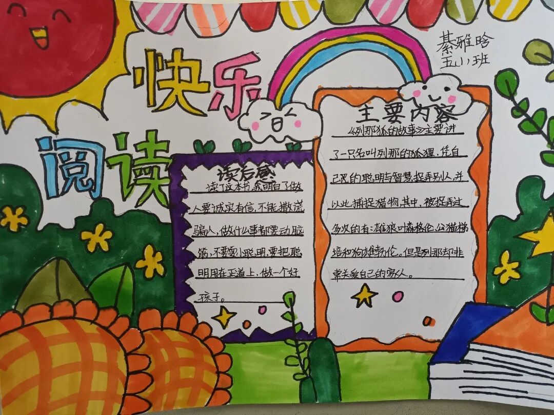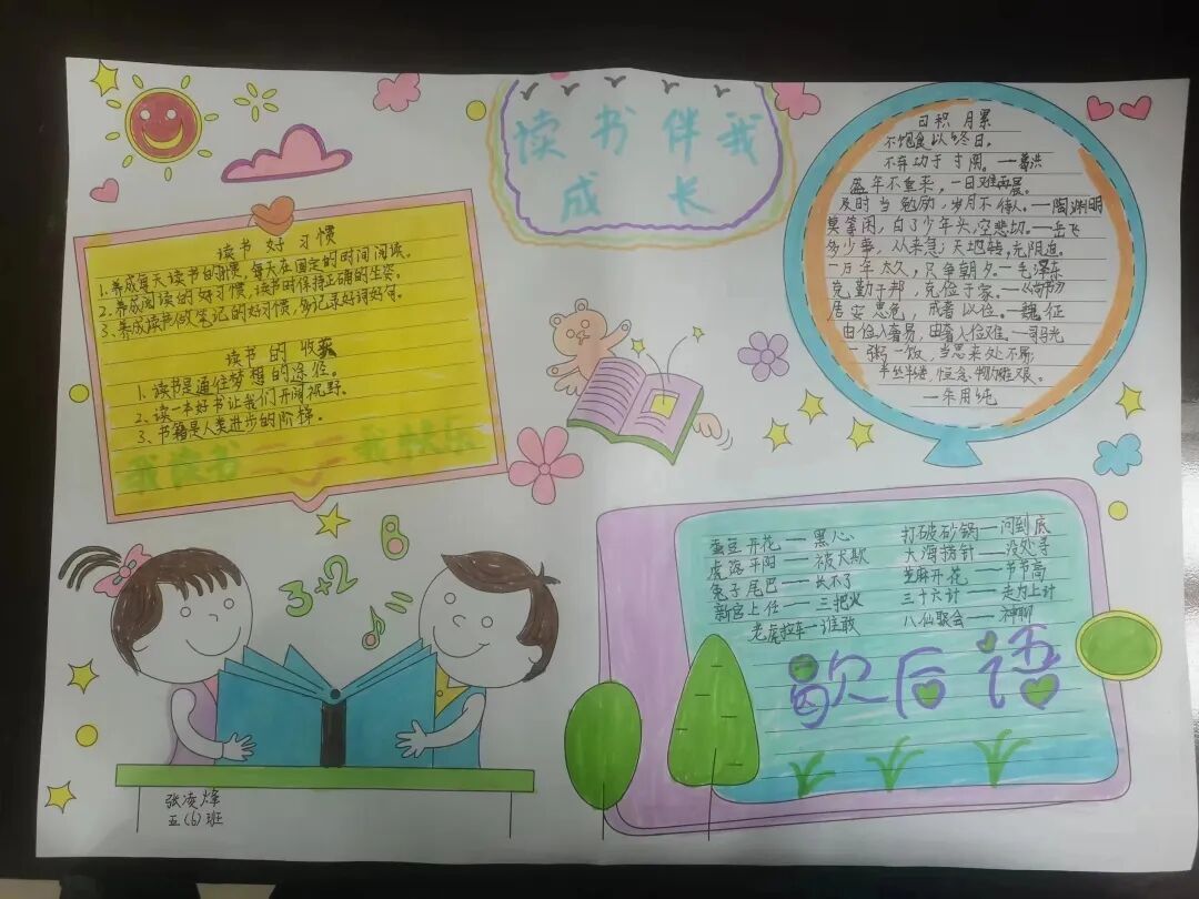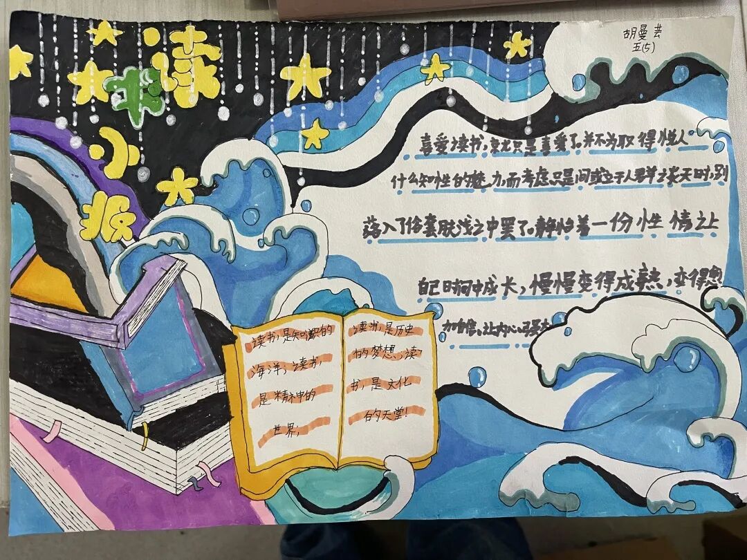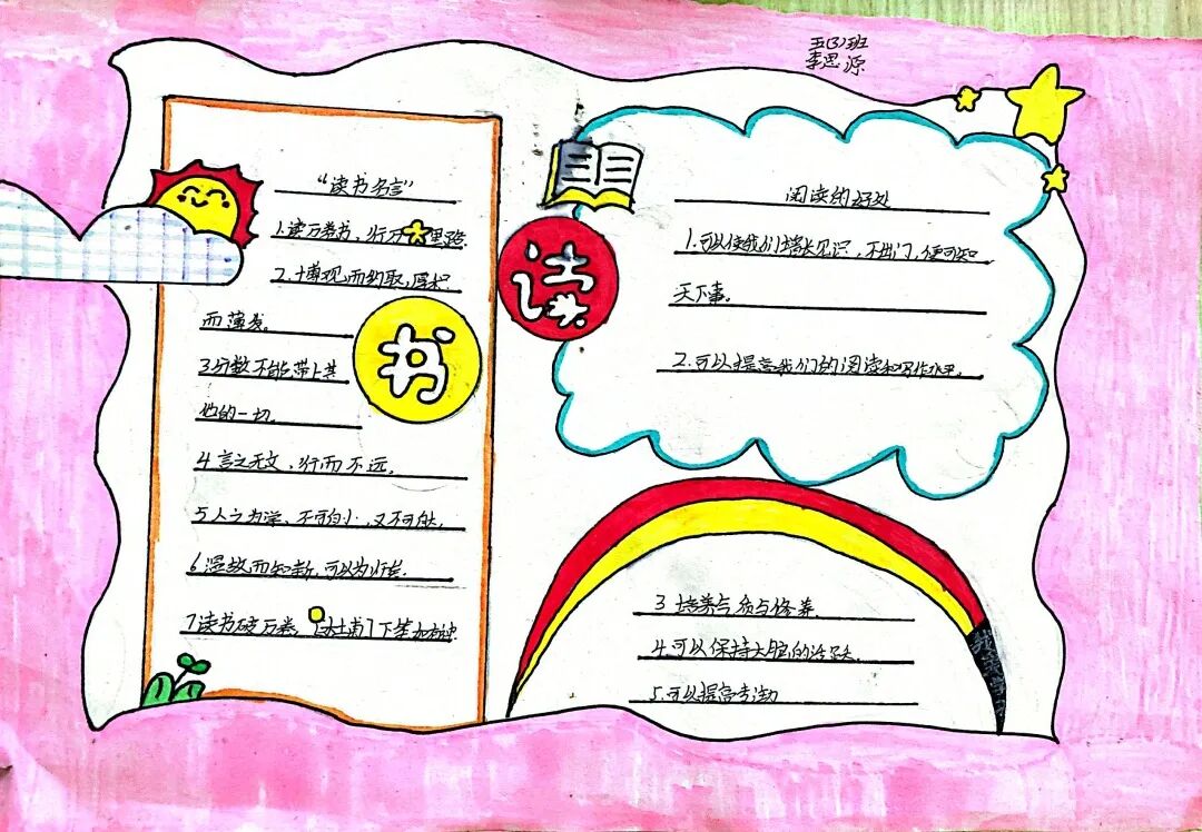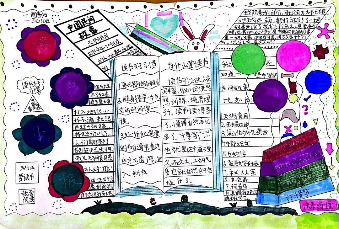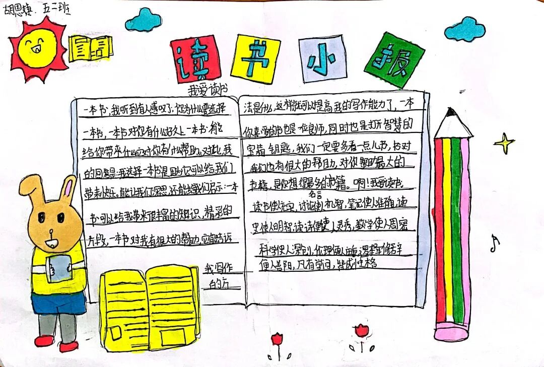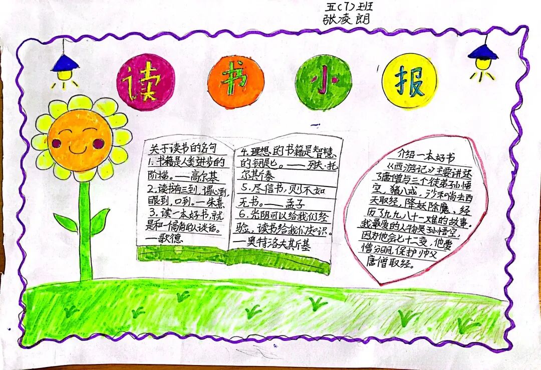 五年级读书手抄报 陶行知说过:“活的人才教育不是灌输知识,而是将开发文化宝库的钥匙,尽我们知道的交给学生。” 春遇见冬,有了岁月;假期遇见阅读,平添了一些意境;人遇见书籍,有了心灵世界。在这个冬天,孩子们找到了被人生偷藏起来的糖果,亦找到了一片属于自己独一无二的风景。阅尽祖国的波澜壮阔,读过作家笔下一个个灵动的文字,是给自己最好的礼物。 寒假静悄悄的进入尾声,新学期吹响了战斗的号角。 实验二小五年级学生纷纷展示假期阅读成果,这是一个书香四溢的假期,也是一个硕果累累的假期。在师生共同努力下,各班级遴选出了优秀作品。 从綦雅晗同学色彩斑斓的读书小报可以直观的感受到假期阅读的快乐。正所谓“读书不要贪多,而是要多加思索”。《列那狐的故事》她读出了自己的见解:做人要诚实守信,要把聪明用在正道上。 舒婉茹同学的读书小报非常符合魔幻文学系列小说《哈利波特》的形象,黑白色的城堡、色彩鲜明的标志。读过这本书,就像打开了新世界的大门,巫师世界的魔法让孩子们拥有爱与勇气的能力。 《列那狐的故事》在张烯怡同学笔下,构图有了童话般的意境,狐狸的造型非常生动形象。作品展示了两个关于列那狐的小故事,让我们感受到了列那狐的智慧。 一笔一划的文字配上精美的图片排版,不禁让人感叹鲁晗玥同学对待作品的别出心裁。认真的小朋友在假期不仅阅读了《巴黎圣母院》、《鲁滨逊漂流记》、《山羊不吃天堂草》,还积累了文中好句,想必寒假收货颇多呢! 看见胡钰琪同学的读书小报,一定能猜出她是一个充满爱和想象力的孩子。可爱的手绘动物、栩栩如生的花朵、隽秀的字迹,构成了小女孩阅读的童话天堂。她不仅寒假读完了两本书,还给新学期制定了再读两本书的目标,真是太棒啦! “孙悟空”带我们去西天取了一回真经——冯晨希同学以独特的视角,笔下生出一个小孙悟空,带领我们见识了《西游记》中唐三藏师徒一行人去西天取经的行动轨迹。 胡恩婕同学以排比句开头,表达了自己对读书的热爱。唯有知识偷不走,相信爱读书的小朋友平时一定读了很多有意义的书籍,不然笔下的文字怎么读起来那么富有感情呢! 玉户临风迎兔入,高楼揽月接春来。胡婧沂同学将手抄报绘出了浓浓的年味。她寒假读了一本有意义的书:《生命的秘密——从草履虫到达尔文》,这本书讲述了生命的演变是多么的神奇与漫长。我们要尊重生命、尊重自然、尊重科学。 李双双同学发自内心的给我们介绍了“人为什么要读书?”是的,书籍是良师益友,它能让人有不断向上的力量,让我们站在巨人的肩膀上,让我们有做出选择的能力。 明亮的背景色,鲜艳的小太阳,闪耀的星星,李思远同学的手绘报仿佛把人带入粉红乐园。却又清晰的列出“博观而约取,厚积而薄发”等醒目名言。 所谓小报就是交流,囊括中外读书名言、好书推荐,用极简的方式告诉大人、小孩子阅读的意义。徐梓琦同学绘画的景物色泽饱满,很棒! 四大名著之一《红楼梦》,道尽人生的悲欢离合,繁华过后终究是红楼梦一场。《朝花夕拾》收录了鲁迅童年和青年的故事,早晨的花儿等到傍晚摘,幼年的事等到晚年回想。陈瑶萌同学以简短的语言,涵盖了对两部文学作品的感悟,令人心生敬佩! 正如程清芸同学读书小报所写:“鸟欲高飞先振翅,人求上进先读书”。她的作品思路清晰,直截了当的列出读书名言、读书的好处、好书推荐。让人直观的感受到小朋友对快乐阅读含义的深刻理解。 “书中自有黄金屋,书中自有颜如玉。”徐墨依同学一定在书中找到了自己“黄金屋”,不仅阅览诗句,还在史蒂芬·霍金的文学作品中探索宇宙物理的奥秘。 摆放有序的书籍,绛红色的书柜,仿佛带人进入了浩如烟海的图书馆。袁梦丹同学介绍了阅读的方法:选择适合自己的书。阅读高质量的书籍有助于孩子的成长进步,多读书、读好书。 看,是哪位小朋友这么认真呢!谢梓涵同学用彩红线条勾勒出了五年级上学期的语文知识点导图,让我们一同回忆起在校园上课的美好时光。将“旧书不厌百回读,熟读深思子自知”体现的淋漓尽致。 一首脍炙人口的《劝学》,瞬间把记忆拉回儿时的课堂,“黑发不知勤学早,白首方悔读书迟”。南雨欣同学的作品绘画出了小动物可爱的造型,画面很清新,富有童话世界色彩。 一支酷似擎天之柱的笔,撑起了阅读的天堂。陈思宇同学发挥想象力,纸笔立于天地之间,在阅读的世界里,连太阳和星星都成了点缀。 胡曼芸同学的作品给人一种深海探险寻宝的氛围感,流畅的线条、粗细变化的海浪,很生动的表达了知识的海洋应该有的模样。大胆单纯的画面构成,微妙丰富的层次变化,整幅画面看起来非常舒适。 饶宸同学的作品繁简结合,简洁明亮的线条、饱含知识的书籍推荐,使得画面很和谐。让大家一眼就收获到了这么多中外名著呢! 董俐彤小朋友作品中的物体造型非常有趣,线条和涂色都很棒。她寒假阅读了四大名著中的《红楼梦》和《西游记》,并写出了读《红楼梦》的感想,真是个认真的好孩子! 我读书,我快乐!张凌烽同学以有趣的图画、灵动的文字描绘出了一幅让人感觉到快乐阅读意义的读书小报。“莫等闲、白了少年头,空悲切。”这句诗词,让人感触良多,年少时一定要珍惜时间不断进步,不要年老时后悔。 《三国演义》反映