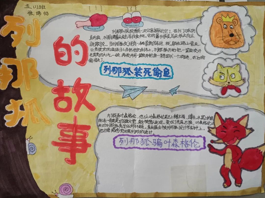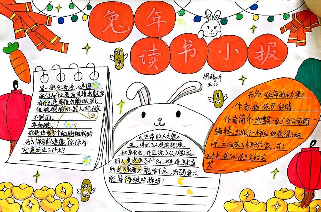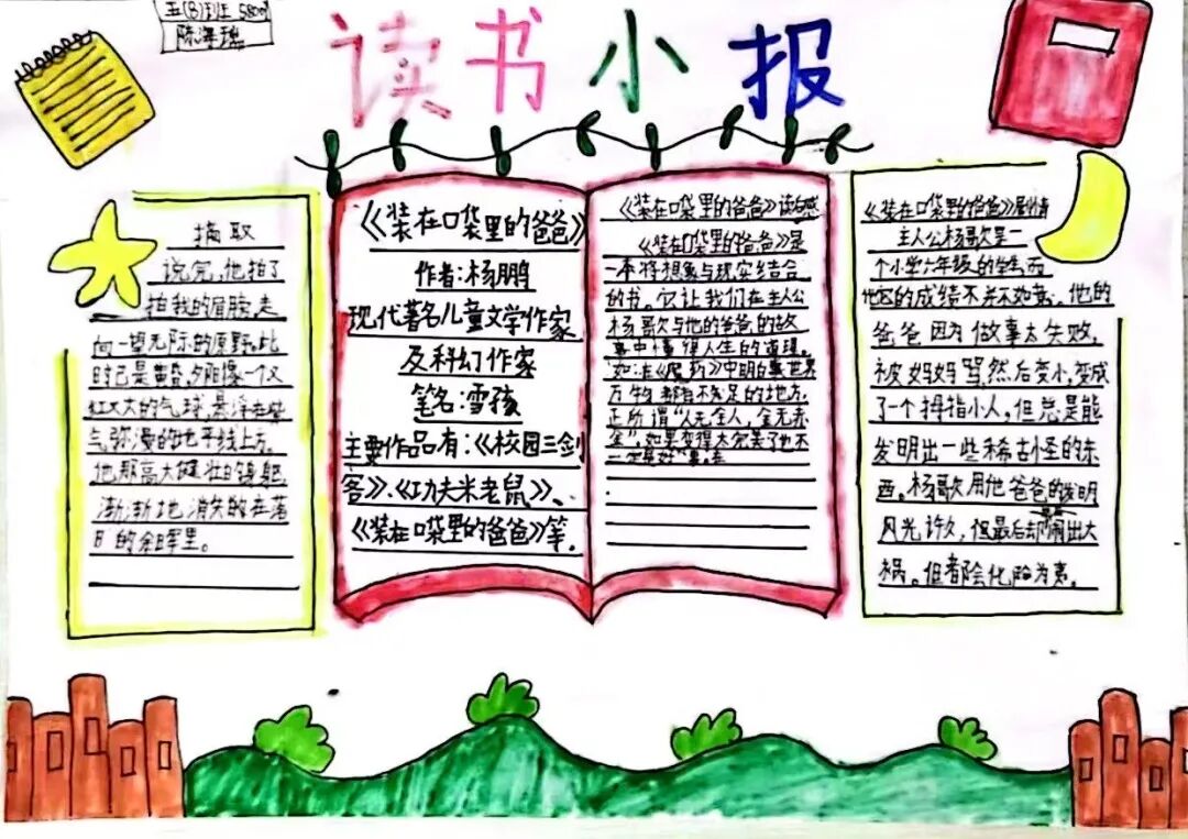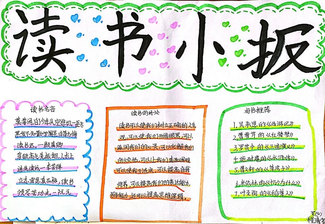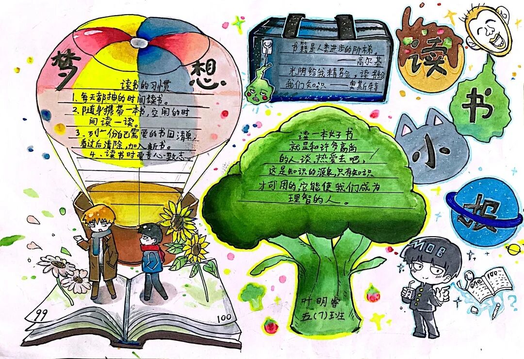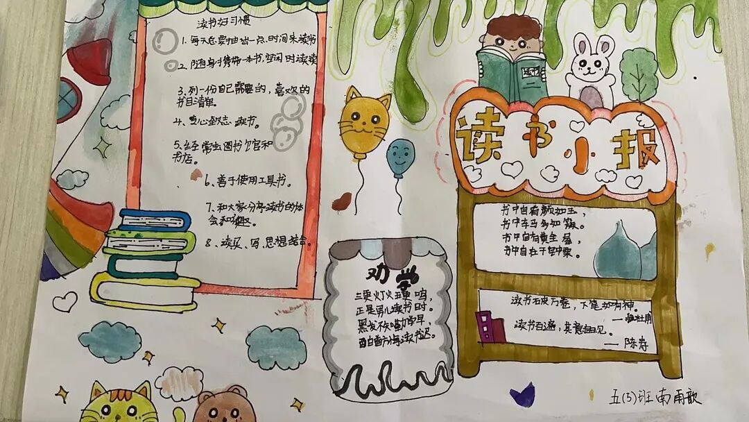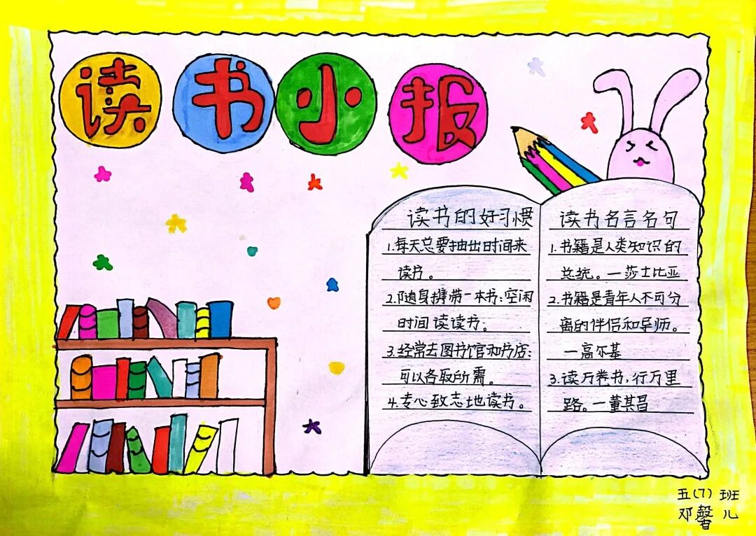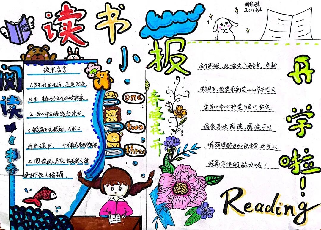 五年级读书手抄报 陶行知说过:“活的人才教育不是灌输知识,而是将开发文化宝库的钥匙,尽我们知道的交给学生。” 春遇见冬,有了岁月;假期遇见阅读,平添了一些意境;人遇见书籍,有了心灵世界。在这个冬天,孩子们找到了被人生偷藏起来的糖果,亦找到了一片属于自己独一无二的风景。阅尽祖国的波澜壮阔,读过作家笔下一个个灵动的文字,是给自己最好的礼物。 寒假静悄悄的进入尾声,新学期吹响了战斗的号角。 实验二小五年级学生纷纷展示假期阅读成果,这是一个书香四溢的假期,也是一个硕果累累的假期。在师生共同努力下,各班级遴选出了优秀作品。 从綦雅晗同学色彩斑斓的读书小报可以直观的感受到假期阅读的快乐。正所谓“读书不要贪多,而是要多加思索”。《列那狐的故事》她读出了自己的见解:做人要诚实守信,要把聪明用在正道上。 舒婉茹同学的读书小报非常符合魔幻文学系列小说《哈利波特》的形象,黑白色的城堡、色彩鲜明的标志。读过这本书,就像打开了新世界的大门,巫师世界的魔法让孩子们拥有爱与勇气的能力。 《列那狐的故事》在张烯怡同学笔下,构图有了童话般的意境,狐狸的造型非常生动形象。作品展示了两个关于列那狐的小故事,让我们感受到了列那狐的智慧。 一笔一划的文字配上精美的图片排版,不禁让人感叹鲁晗玥同学对待作品的别出心裁。认真的小朋友在假期不仅阅读了《巴黎圣母院》、《鲁滨逊漂流记》、《山羊不吃天堂草》,还积累了文中好句,想必寒假收货颇多呢! 看见胡钰琪同学的读书小报,一定能猜出她是一个充满爱和想象力的孩子。可爱的手绘动物、栩栩如生的花朵、隽秀的字迹,构成了小女孩阅读的童话天堂。她不仅寒假读完了两本书,还给新学期制定了再读两本书的目标,真是太棒啦! “孙悟空”带我们去西天取了一回真经——冯晨希同学以独特的视角,笔下生出一个小孙悟空,带领我们见识了《西游记》中唐三藏师徒一行人去西天取经的行动轨迹。 胡恩婕同学以排比句开头,表达了自己对读书的热爱。唯有知识偷不走,相信爱读书的小朋友平时一定读了很多有意义的书籍,不然笔下的文字怎么读起来那么富有感情呢! 玉户临风迎兔入,高楼揽月接春来。胡婧沂同学将手抄报绘出了浓浓的年味。她寒假读了一本有意义的书:《生命的秘密——从草履虫到达尔文》,这本书讲述了生命的演变是多么的神奇与漫长。我们要尊重生命、尊重自然、尊重科学。 李双双同学发自内心的给我们介绍了“人为什么要读书?”是的,书籍是良师益友,它能让人有不断向上的力量,让我们站在巨人的肩膀上,让我们有做出选择的能力。 明亮的背景色,鲜艳的小太阳,闪耀的星星,李思远同学的手绘报仿佛把人带入粉红乐园。却又清晰的列出“博观而约取,厚积而薄发”等醒目名言。 所谓小报就是交流,囊括中外读书名言、好书推荐,用极简的方式告诉大人、小孩子阅读的意义。徐梓琦同学绘画的景物色泽饱满,很棒! 四大名著之一《红楼梦》,道尽人生的悲欢离合,繁华过后终究是红楼梦一场。《朝花夕拾》收录了鲁迅童年和青年的故事,早晨的花儿等到傍晚摘,幼年的事等到晚年回想。陈瑶萌同学以简短的语言,涵盖了对两部文学作品的感悟,令人心生敬佩! 正如程清芸同学读书小报所写:“鸟欲高飞先振翅,人求上进先读书”。她的作品思路清晰,直截了当的列出读书名言、读书的好处、好书推荐。让人直观的感受到小朋友对快乐阅读含义的深刻理解。 “书中自有黄金屋,书中自有颜如玉。”徐墨依同学一定在书中找到了自己“黄金屋”,不仅阅览诗句,还在史蒂芬·霍金的文学作品中探索宇宙物理的奥秘。 摆放有序的书籍,绛红色的书柜,仿佛带人进入了浩如烟海的图书馆。袁梦丹同学介绍了阅读的方法:选择适合自己的书。阅读高质量的书籍有助于孩子的成长进步,多读书、读好书。 看,是哪位小朋友这么认真呢!谢梓涵同学用彩红线条勾勒出了五年级上学期的语文知识点导图,让我们一同回忆起在校园上课的美好时光。将“旧书不厌百回读,熟读深思子自知”体现的淋漓尽致。 一首脍炙人口的《劝学》,瞬间把记忆拉回儿时的课堂,“黑发不知勤学早,白首方悔读书迟”。南雨欣同学的作品绘画出了小动物可爱的造型,画面很清新,富有童话世界色彩。 一支酷似擎天之柱的笔,撑起了阅读的天堂。陈思宇同学发挥想象力,纸笔立于天地之间,在阅读的世界里,连太阳和星星都成了点缀。 胡曼芸同学的作品给人一种深海探险寻宝的氛围感,流畅的线条、粗细变化的海浪,很生动的表达了知识的海洋应该有的模样。大胆单纯的画面构成,微妙丰富的层次变化,整幅画面看起来非常舒适。 饶宸同学的作品繁简结合,简洁明亮的线条、饱含知识的书籍推荐,使得画面很和谐。让大家一眼就收获到了这么多中外名著呢! 董俐彤小朋友作品中的物体造型非常有趣,线条和涂色都很棒。她寒假阅读了四大名著中的《红楼梦》和《西游记》,并写出了读《红楼梦》的感想,真是个认真的好孩子! 我读书,我快乐!张凌烽同学以有趣的图画、灵动的文字描绘出了一幅让人感觉到快乐阅读意义的读书小报。“莫等闲、白了少年头,空悲切。”这句诗词,让人感触良多,年少时一定要珍惜时间不断进步,不要年老时后悔。 《三国演义》反映