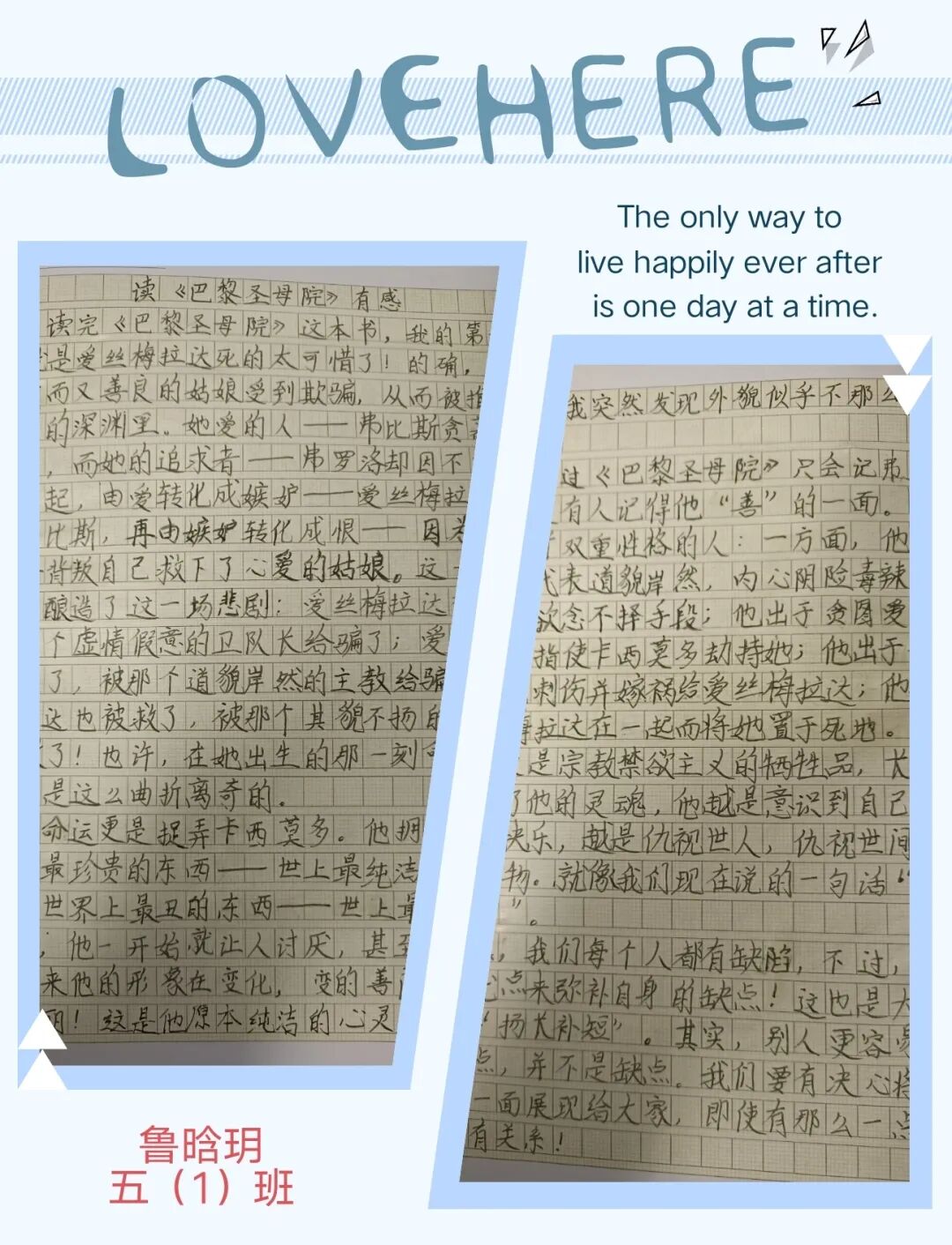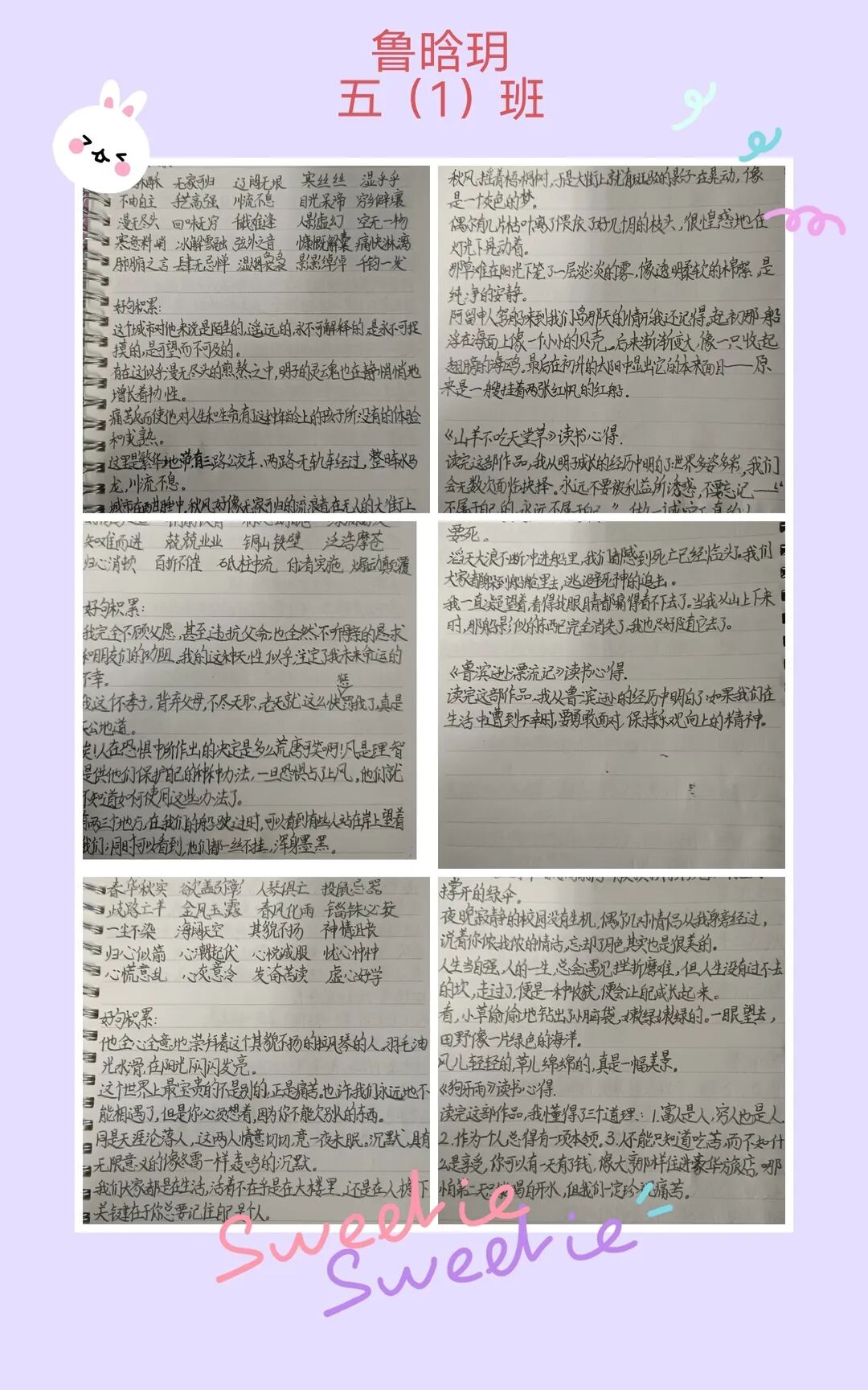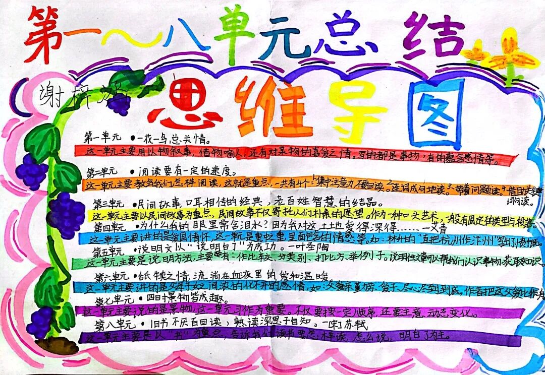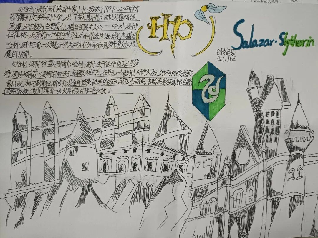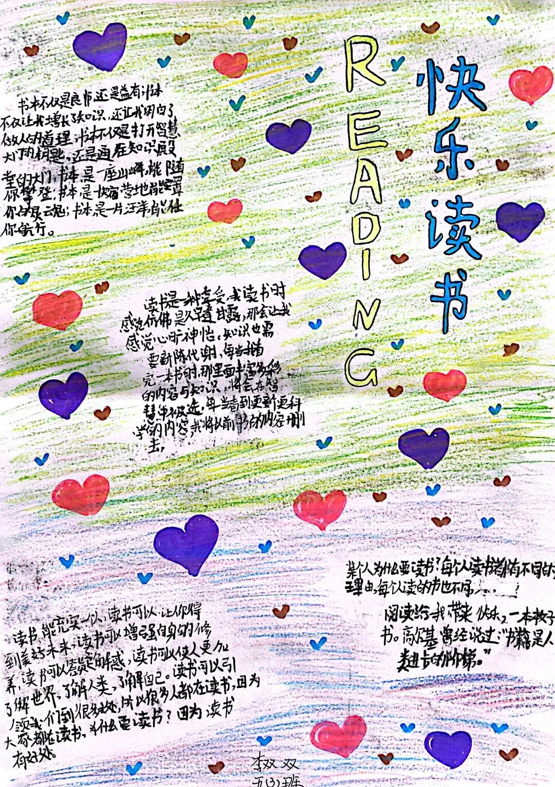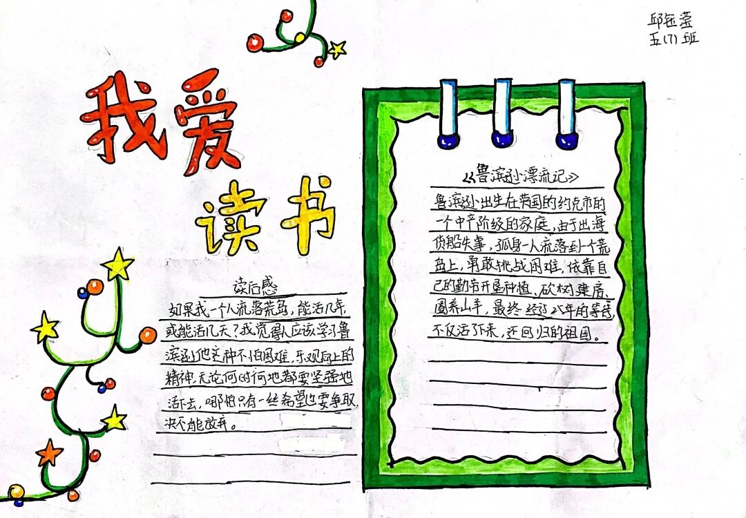 五年级读书手抄报 陶行知说过:“活的人才教育不是灌输知识,而是将开发文化宝库的钥匙,尽我们知道的交给学生。” 春遇见冬,有了岁月;假期遇见阅读,平添了一些意境;人遇见书籍,有了心灵世界。在这个冬天,孩子们找到了被人生偷藏起来的糖果,亦找到了一片属于自己独一无二的风景。阅尽祖国的波澜壮阔,读过作家笔下一个个灵动的文字,是给自己最好的礼物。 寒假静悄悄的进入尾声,新学期吹响了战斗的号角。 实验二小五年级学生纷纷展示假期阅读成果,这是一个书香四溢的假期,也是一个硕果累累的假期。在师生共同努力下,各班级遴选出了优秀作品。 从綦雅晗同学色彩斑斓的读书小报可以直观的感受到假期阅读的快乐。正所谓“读书不要贪多,而是要多加思索”。《列那狐的故事》她读出了自己的见解:做人要诚实守信,要把聪明用在正道上。 舒婉茹同学的读书小报非常符合魔幻文学系列小说《哈利波特》的形象,黑白色的城堡、色彩鲜明的标志。读过这本书,就像打开了新世界的大门,巫师世界的魔法让孩子们拥有爱与勇气的能力。 《列那狐的故事》在张烯怡同学笔下,构图有了童话般的意境,狐狸的造型非常生动形象。作品展示了两个关于列那狐的小故事,让我们感受到了列那狐的智慧。 一笔一划的文字配上精美的图片排版,不禁让人感叹鲁晗玥同学对待作品的别出心裁。认真的小朋友在假期不仅阅读了《巴黎圣母院》、《鲁滨逊漂流记》、《山羊不吃天堂草》,还积累了文中好句,想必寒假收货颇多呢! 看见胡钰琪同学的读书小报,一定能猜出她是一个充满爱和想象力的孩子。可爱的手绘动物、栩栩如生的花朵、隽秀的字迹,构成了小女孩阅读的童话天堂。她不仅寒假读完了两本书,还给新学期制定了再读两本书的目标,真是太棒啦! “孙悟空”带我们去西天取了一回真经——冯晨希同学以独特的视角,笔下生出一个小孙悟空,带领我们见识了《西游记》中唐三藏师徒一行人去西天取经的行动轨迹。 胡恩婕同学以排比句开头,表达了自己对读书的热爱。唯有知识偷不走,相信爱读书的小朋友平时一定读了很多有意义的书籍,不然笔下的文字怎么读起来那么富有感情呢! 玉户临风迎兔入,高楼揽月接春来。胡婧沂同学将手抄报绘出了浓浓的年味。她寒假读了一本有意义的书:《生命的秘密——从草履虫到达尔文》,这本书讲述了生命的演变是多么的神奇与漫长。我们要尊重生命、尊重自然、尊重科学。 李双双同学发自内心的给我们介绍了“人为什么要读书?”是的,书籍是良师益友,它能让人有不断向上的力量,让我们站在巨人的肩膀上,让我们有做出选择的能力。 明亮的背景色,鲜艳的小太阳,闪耀的星星,李思远同学的手绘报仿佛把人带入粉红乐园。却又清晰的列出“博观而约取,厚积而薄发”等醒目名言。 所谓小报就是交流,囊括中外读书名言、好书推荐,用极简的方式告诉大人、小孩子阅读的意义。徐梓琦同学绘画的景物色泽饱满,很棒! 四大名著之一《红楼梦》,道尽人生的悲欢离合,繁华过后终究是红楼梦一场。《朝花夕拾》收录了鲁迅童年和青年的故事,早晨的花儿等到傍晚摘,幼年的事等到晚年回想。陈瑶萌同学以简短的语言,涵盖了对两部文学作品的感悟,令人心生敬佩! 正如程清芸同学读书小报所写:“鸟欲高飞先振翅,人求上进先读书”。她的作品思路清晰,直截了当的列出读书名言、读书的好处、好书推荐。让人直观的感受到小朋友对快乐阅读含义的深刻理解。 “书中自有黄金屋,书中自有颜如玉。”徐墨依同学一定在书中找到了自己“黄金屋”,不仅阅览诗句,还在史蒂芬·霍金的文学作品中探索宇宙物理的奥秘。 摆放有序的书籍,绛红色的书柜,仿佛带人进入了浩如烟海的图书馆。袁梦丹同学介绍了阅读的方法:选择适合自己的书。阅读高质量的书籍有助于孩子的成长进步,多读书、读好书。 看,是哪位小朋友这么认真呢!谢梓涵同学用彩红线条勾勒出了五年级上学期的语文知识点导图,让我们一同回忆起在校园上课的美好时光。将“旧书不厌百回读,熟读深思子自知”体现的淋漓尽致。 一首脍炙人口的《劝学》,瞬间把记忆拉回儿时的课堂,“黑发不知勤学早,白首方悔读书迟”。南雨欣同学的作品绘画出了小动物可爱的造型,画面很清新,富有童话世界色彩。 一支酷似擎天之柱的笔,撑起了阅读的天堂。陈思宇同学发挥想象力,纸笔立于天地之间,在阅读的世界里,连太阳和星星都成了点缀。 胡曼芸同学的作品给人一种深海探险寻宝的氛围感,流畅的线条、粗细变化的海浪,很生动的表达了知识的海洋应该有的模样。大胆单纯的画面构成,微妙丰富的层次变化,整幅画面看起来非常舒适。 饶宸同学的作品繁简结合,简洁明亮的线条、饱含知识的书籍推荐,使得画面很和谐。让大家一眼就收获到了这么多中外名著呢! 董俐彤小朋友作品中的物体造型非常有趣,线条和涂色都很棒。她寒假阅读了四大名著中的《红楼梦》和《西游记》,并写出了读《红楼梦》的感想,真是个认真的好孩子! 我读书,我快乐!张凌烽同学以有趣的图画、灵动的文字描绘出了一幅让人感觉到快乐阅读意义的读书小报。“莫等闲、白了少年头,空悲切。”这句诗词,让人感触良多,年少时一定要珍惜时间不断进步,不要年老时后悔。 《三国演义》反映