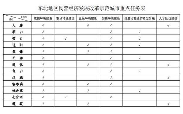 《通知》称,国家发展改革委、工业和信息化部、全国工商联、国家开发银行四部门确定大连市等13个城市为东北地区民营经济发展改革示范城市,包括: