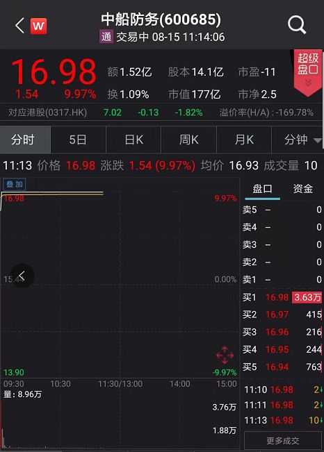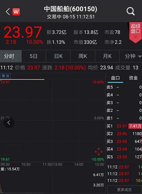 中国船舶、中船防务于8月15日复牌交易,早间开盘后两只股票迅速涨停,分别报23.97元/股、16.98元/股。