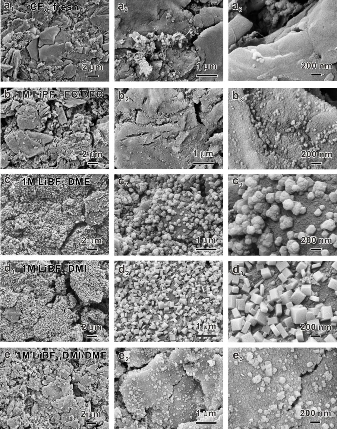 图7.(a1- a3)新鲜制备的CFx正极的SEM图像;在(b1- b3)1 M LiPF6,EC/DEC;(c1- c3)1 M LiBF4,DME;(d1 - d3)1 M LiBF4,DMI;和(e1- e3)1 M LiBF4,DMI/DME电解液中完全放电后的CFx正极的SEM图像。