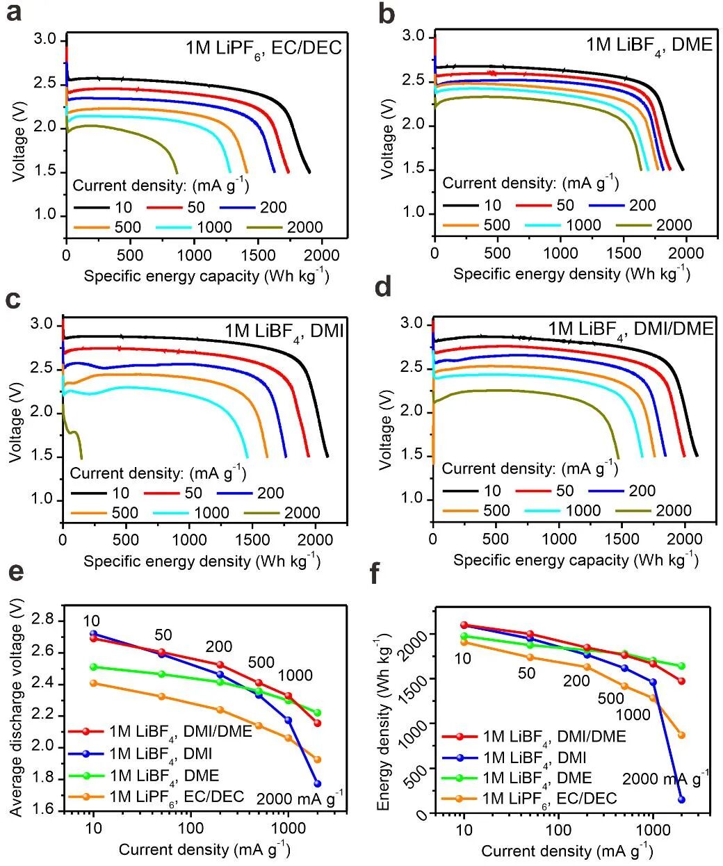图3. Li||CFx电池在不同电解液中的电化学性能:(a - d)Li||CFx电池在(a)1 M LiPF6,EC/DEC;(b)1 M LiBF4,DME;(c)1 M LiBF4,DMI;和(d)1 M LiBF4,DMI/DME电解液中的放电能量;(e - f)Li||CFx电池在上述四种电解液中的(e)平均放电电压和(f)放电能量密度与施加电流的关系图。