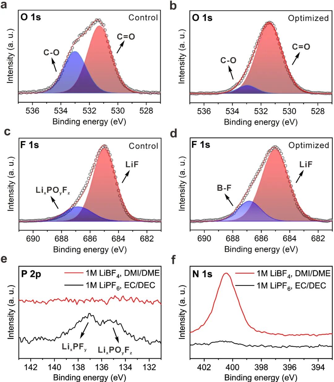 图6. 在(a,c)基准电解液(1 M LiPF6,EC/DEC)和(b,d)优化后的电解液(1 M LiBF4,DMI/DME)中完全放电后的CFx正极的XPS 高分辨谱图;(a,b)O 1s 谱图;(c,d)F 1s谱图;(e - f)在不同电解液中完全放电后的CFx正极的(e)P 2p 谱图(f)N 1s 谱图。