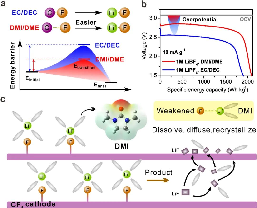 图8. (a)C-F键断裂所需的能垒示意图;(b)Li||CFx电池在不同电解液中放电的过电势与放电电压的关系;(c)以DMI/DME为共溶剂的电解液在Li||CFx电池中的放电及作用机理示意图。