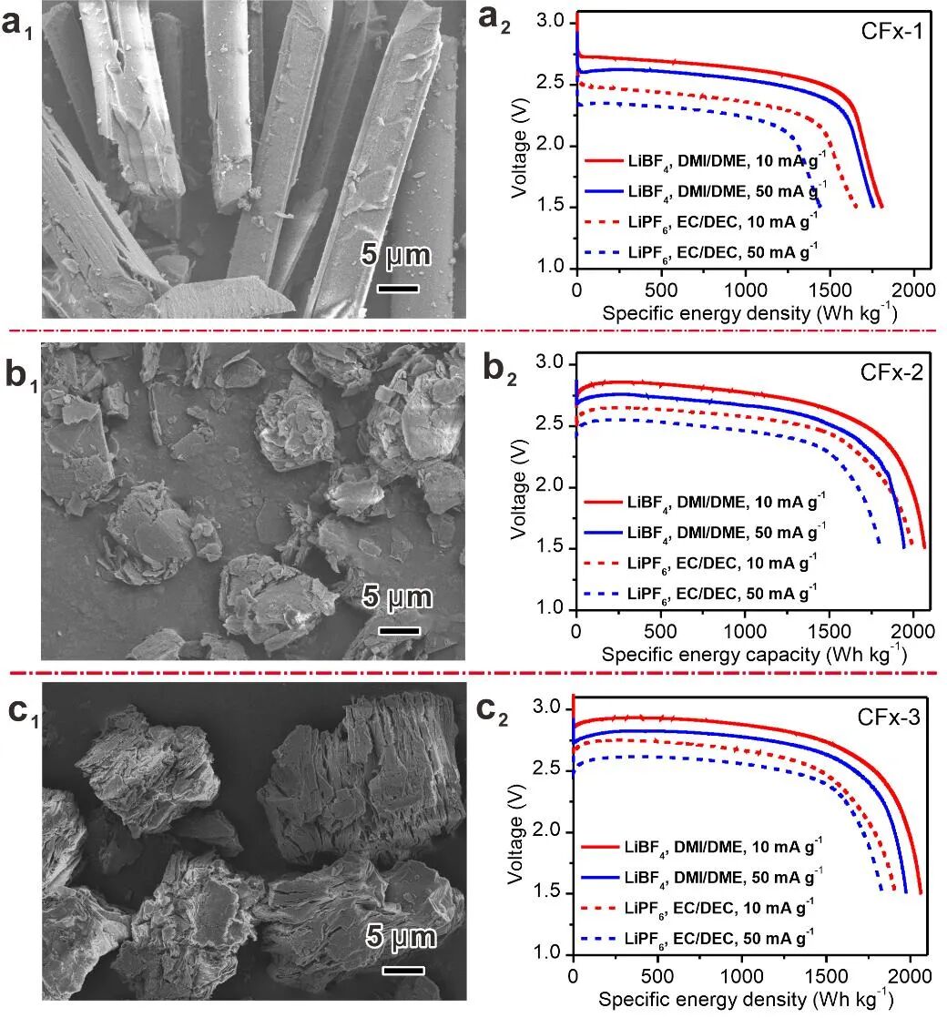 图9. (a1-c1)由不同种类前驱体合成的CFx材料的SEM图像;(a2-c2)不同种类的CFx材料在基准电解液(1 M LiPF6,EC/DEC)和优化后的电解液(1 M LiBF4,DMI/DME)中测试的电池放电性能。