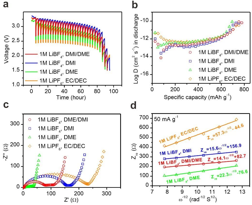 );(c)Li||CFx电池在不同种类电解液中放电后的阻抗测试 dmi溶剂;(d)基于在低频段的阻抗测试数据的线性拟合结果。