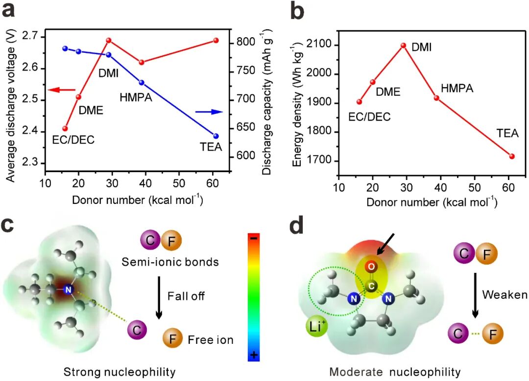 图2.(a,b)DN值对Li||CFx电池平均放电电压、放电容量和放电能量的影响;(c)强亲核试剂对CFx材料的脱氟机制示意图;(d)具有温和亲核性的溶剂(DMI)对CFx材料的作用机制。