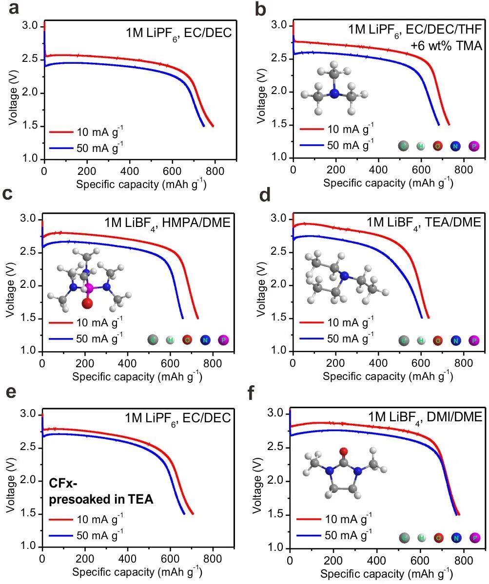 图1. 使用不同种类电解液的Li||CFx电池的放电性能对比:(a)1 M LiPF6,EC/DEC;(b)1 M LiPF6,EC/DEC/THF (添加6 wt% TMA);(c)1 M LiBF4,HMPA/DME;(d)1 M LiBF4TEA/DME;(e)1 M LiPF6,EC/DEC;(f)1 M LiBF4,DMI/DME。其中,在图1e中,CFx电极预先浸泡在TEA溶液中进行预处理。