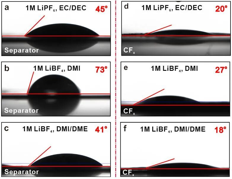 图4.(a - c)不同种类电解液在隔膜上的接触角;(d - f)不同种类电解液在CFx正极上的接触角。