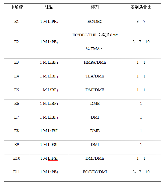表1. 文中研究的电解液配方。其中,EC为碳酸乙烯酯,DEC为碳酸二乙酯,THF为四氢呋喃,TMA为三甲胺,HMPA为六甲基磷酸三铵,TEA为三乙胺。电解液E1为文中所用的基准电解液,E2 ~ E5用于研究高DN值电解液共溶剂和添加剂对Li||CFx一次电池的影响,E6和E7用于研究单一组分溶剂的影响;E8 ~ E11用于研究锂盐种类对电池放电性能的影响,E5为最优的电解液配方。