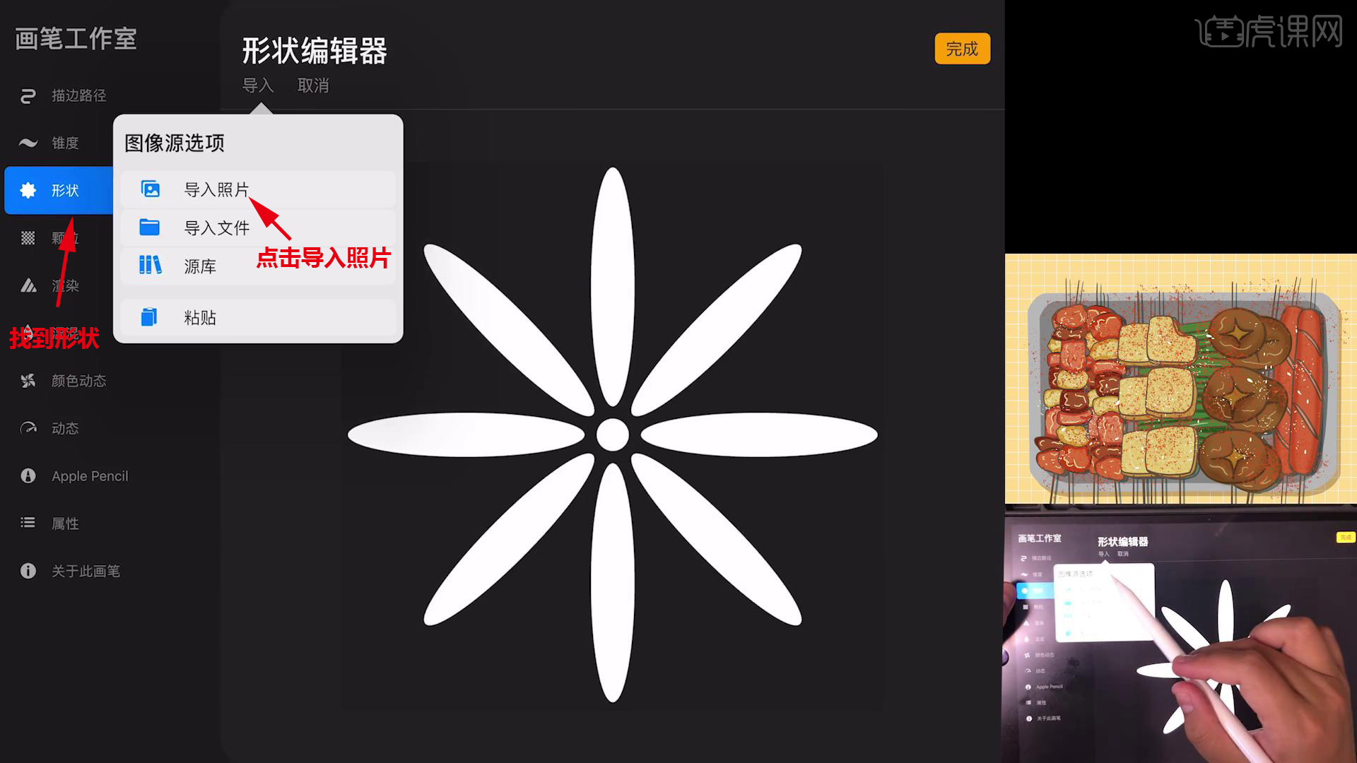 14.做芝麻笔刷,新建画布,填充黑色,用【工作室笔】,【白色】画芝麻,只保留一个图层,导出【jpg】格式,选择笔刷,点击复制,找到【形状】,点击【编辑】,点击【导入照片】,调整芝麻。
