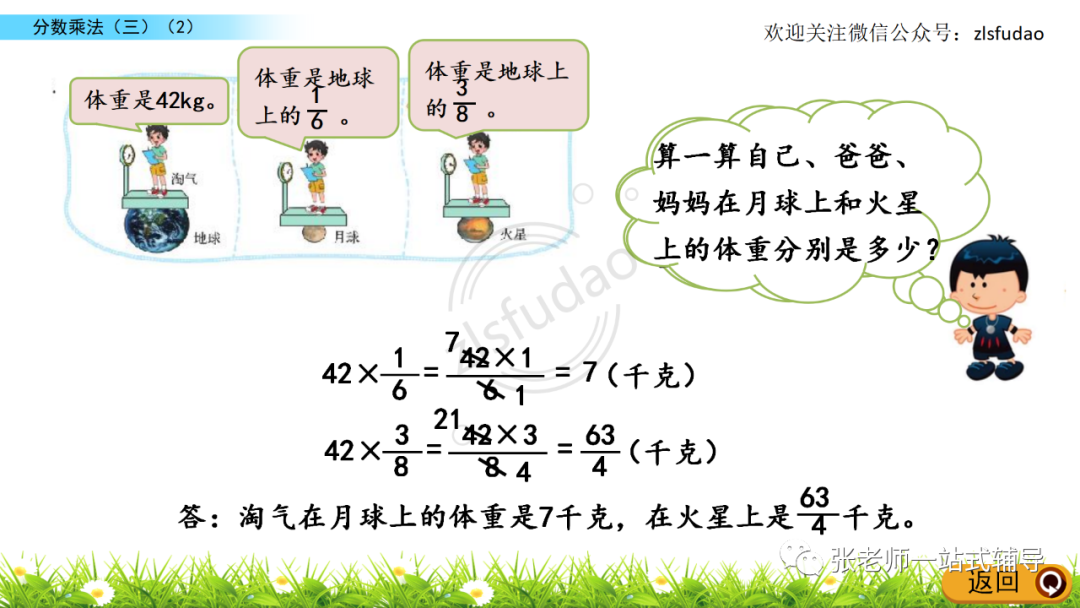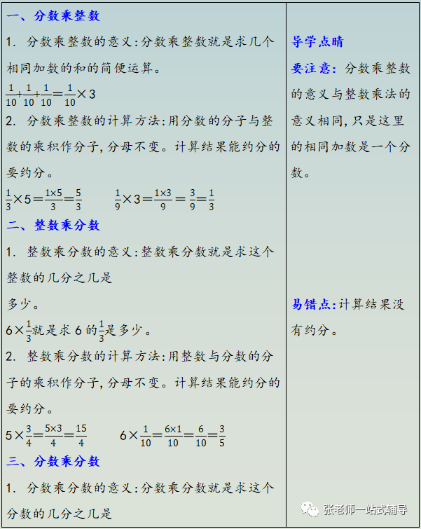 2、分数乘整数的计算方法:分母不变,分子和整数相乘的积作分子。能约分的要约成最简分数。