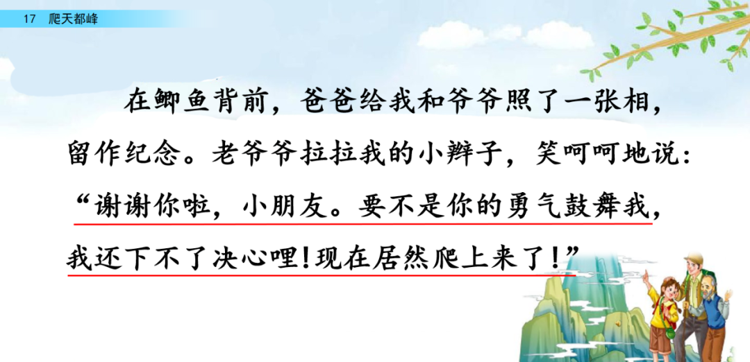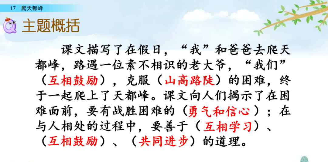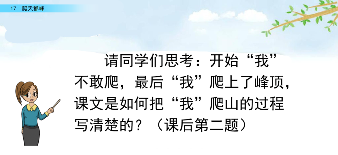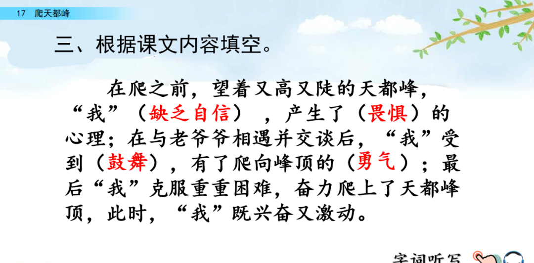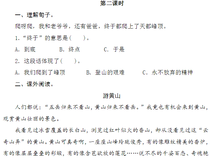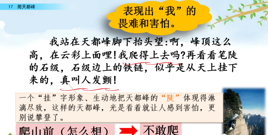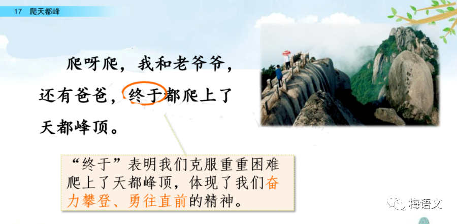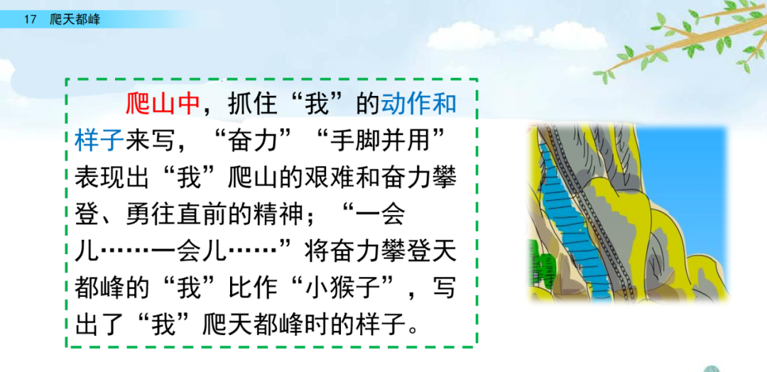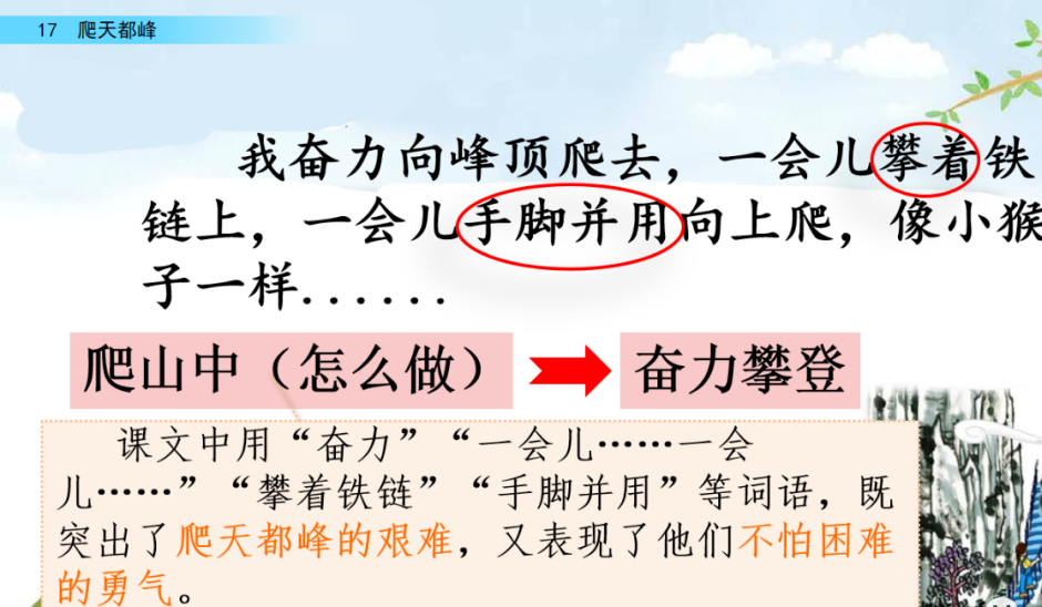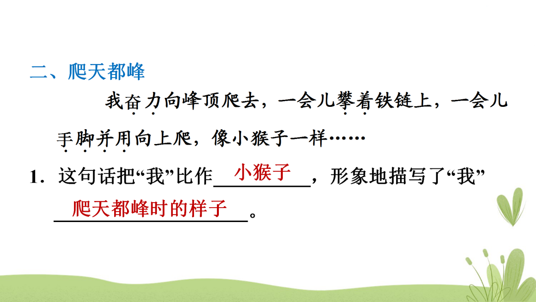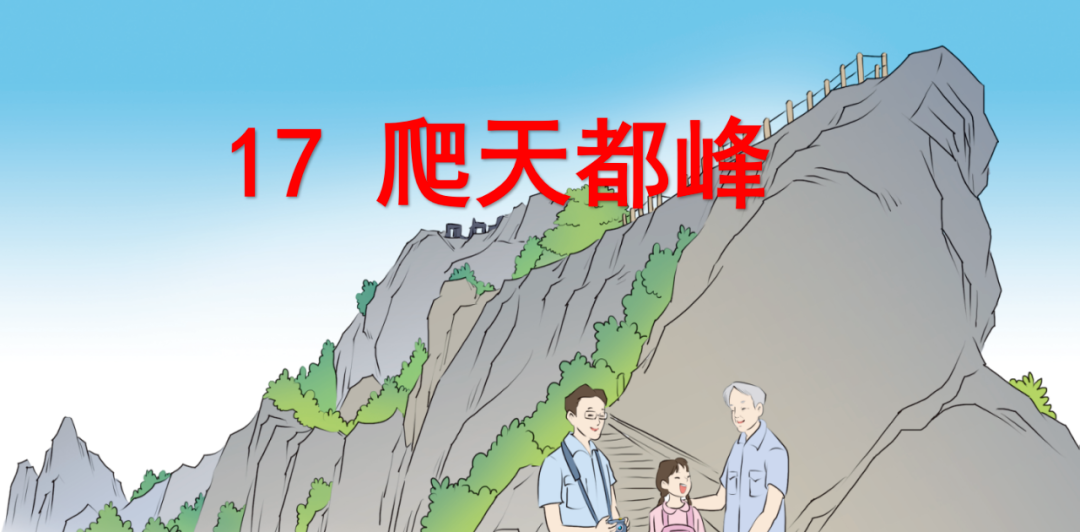 大家好!为了帮助孩子们学好统编版语文新教材,小编继续推出全新栏目——“统编版教材同步课文微课堂(上册)”(包括知识要点、课文朗读、课件解读、视频教学和同步练习)。欢迎大家分享+收藏哦~ 04 爬天都峰 课文朗读 微课视频 01 微课视频一 02 微课视频二 03 生字微课视频 课文知识点 1.会认“级、链”5个生字,认识多音字“相”,会写“哩、级”10个生字。正确读写“假日、抬头、云彩、石级”等词语。 2.有感情地分角色朗读课文,把握课文的主要内容,体会“我”和老爷爷是如何互相鼓励、坚定信心、战胜困难的。 3.体会作者是怎样把爬天都峰这件事写清楚的。 二、教材分析 这是一篇精读课文。课文讲的是在假日里,“我”和爸爸去爬天都峰,遇上一位素不相识的老大爷,“我们”互相鼓励,克服山高路陡的困难,终于一起爬上了天都峰。课文向人们揭示了在困难面前,要有战胜困难的勇气和信心;在与人相处的过程中,要善于互相学习,互相鼓励,共同进步的道理。 三、我会写组词 级:jí(石级、高级、初级) 链:liàn(铁链、表链、锁链) 颤:chàn(发颤、颤动、颤抖) 攀:pān(攀登、攀岩、攀爬) 猴:hóu(猴子、耍猴、猴急) 鲫:jì(鲫鱼、石鲫、花鲫鱼) 念:niàn(纪念、惦念、想念) 辫:biàn(辫子、小辫儿、草帽辫儿) 呵:hē(呵护、呵气、呵斥) 相:xiàng(相片、相机、相貌) 五、多音字 都:dū(首都)dōu(都是) 发:fà (白发)fā(发现) 相:xiàng(照相)xiāng(互相) 六、近义词 似乎一一好像 发颤一一发抖 鼓舞一一鼓励 居然一一竟然 汲取一一吸取 七、反义词 仰一一俯 笔陡一一平坦 鼓舞一一打击 奋力——松懈 抬头——低头 八、理解词语 笔陡:笔直陡峭。 白发苍苍:头发灰白,形容人苍老。 奋力:充分鼓起劲来。 终于:表示经过较长过程最后出现某种情况(多用于希望达到的结果)。 鼓舞:使振作起来,增强信心或勇气。 居然:表示出乎意料;竟然。造句:没想到我居然考了全班第一名。 汲取:吸取。造句:我们互相汲取力量,最终完成了艰巨的任务。 九、句子解析 1.再看看笔陡的石级,石级边上的铁链,似乎是从天上挂下来的,真叫人发颤! 一个“挂”字形象、生动地把天都峰的“陡”体现得淋漓尽致,这样的天都峰,光是看着就让人感到害怕,更别说攀登了。 2.我奋力向峰顶爬去,一会儿攀着铁链上,一会儿手脚并用向上爬,像小猴子一样…… 课文中用“奋力”“一会儿……一会儿……”“攀着铁链”“手脚并用”等词语,既突出了爬天都峰的艰难,又表现了他们不怕困难的勇气。 3.爬呀爬,我和老爷爷,还有爸爸,终于都爬上了天都峰顶。 “终于”表明我们克服重重困难爬上了天都峰顶,体现了我们奋力攀登、勇往直前的精神。 4.爸爸听了,笑着说:“你们这一老一小真有意思,都会从别人身上汲取力量!” 懂得了困难面前,要有战胜困难的勇气和信心;在与人相处的过程中,要善于互相学习、互相鼓励、共同进步的道理。 十、问题归纳 1.读课文,想一想课文写了什么? 本文写了“我”和爸爸在假日里去爬天都峰时遇到一位素不相识的老爷爷,“我”和老爷爷互相鼓励,克服山高路陡的困难,终于一起爬上天都峰的事。 天都峰视频 2.在爬天都峰的过程中,“我”的心理发生了怎样的变化? 在爬之前,望着又高又陡的天都峰,“我”缺乏自信,产生了畏惧的心理;在与老爷爷相遇并交谈后,“我”受到鼓舞,有了爬向峰顶的勇气;最后“我”克服重重困难,奋力爬上了天都峰顶,此时,“我”既兴奋又激动 3.老爷爷为什么要谢“我”?“我”为什么又要谢老爷爷? 说明有了“我”和“老爷爷”的互相鼓励,才使我们有了爬天都峰的勇气和决心,使“我”和“老爷爷”爬上了天都峰。 九、课文分段 第一段(第1自然段):写暑假里爸爸带“我”爬天都峰。 第二段(第2自然段):写天都峰的高和陡。 第三段(第3-7自然段):写“我”在一位老爷爷的带动下,爬上了天都峰。 第四段(第8-10自然段):写爬上天都峰后,“我”和老爷爷互相道谢。 十一、课文主题 本文写了在假日里,“我”和爸爸去爬天都峰,路遇一位素不相识的老爷爷,“我们”互相鼓励,克服困难,终于一起爬上了天都峰顶的事。本文向人们揭示了在困难面前,要有战胜困难的勇气和信心;在与人相处的过程中,要相互学习,相互鼓励,共同进步的道理。 十二、教材课后习题 1.这篇课文写了一件什么事,是按照什么顺序写的? 写了作者爬天都峰的事。 按照爬山前——爬山时——爬山后来写的。 2.“我”开始不敢爬,最后爬上去了。课文是怎么把“我”爬山的过程写清楚的? 爬山前,作者用了夸张的修辞手法写出了山的“高”和“陡”,运用了心理描写,写出了“我”的胆怯,“我”和老爷爷互相鼓励,运用了语言描写。爬山时,抓住“我”的动作和样子来写,“奋力”“手脚并用”表现出“我”爬山的艰难和奋力攀登、勇往直前的精神;“一会儿……一会儿……”将奋力攀登天都峰的“我”比作“小猴子”,写出了“我”爬天都峰时的样子。爬山后,运用了语言描写,写出了“我”和老爷爷互相感谢。 同步课件 同步练习 01 同步练习一 参考答案 02 同步练习二 END