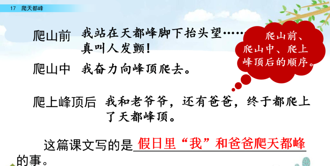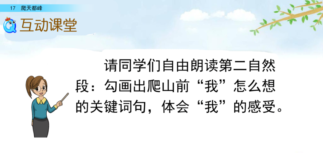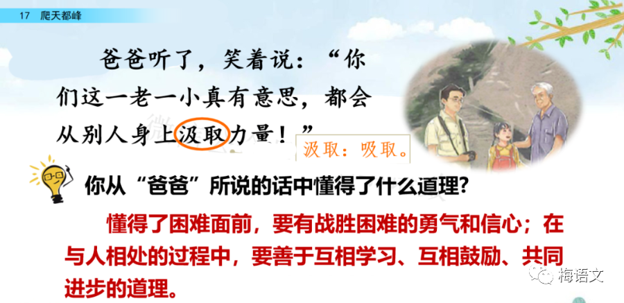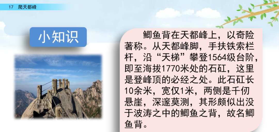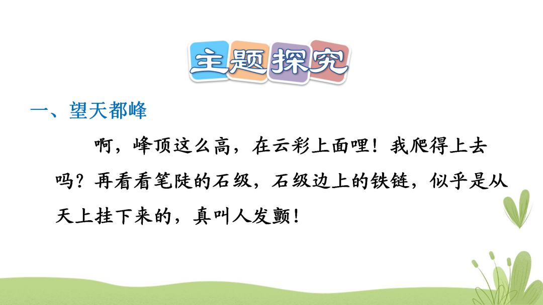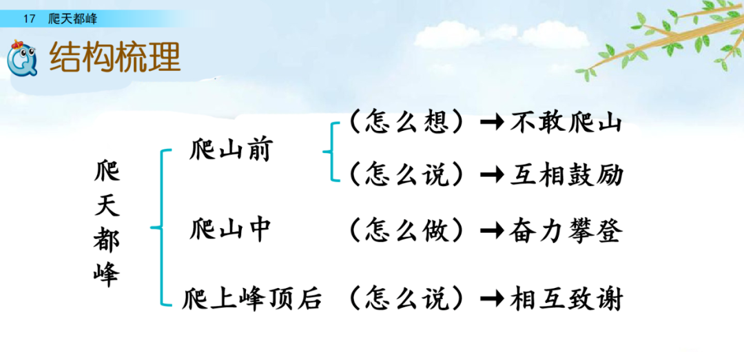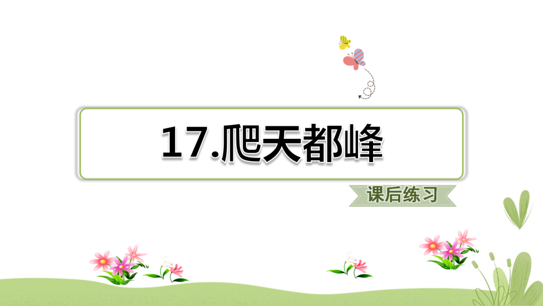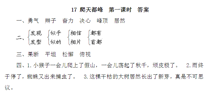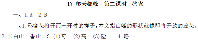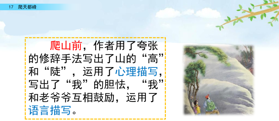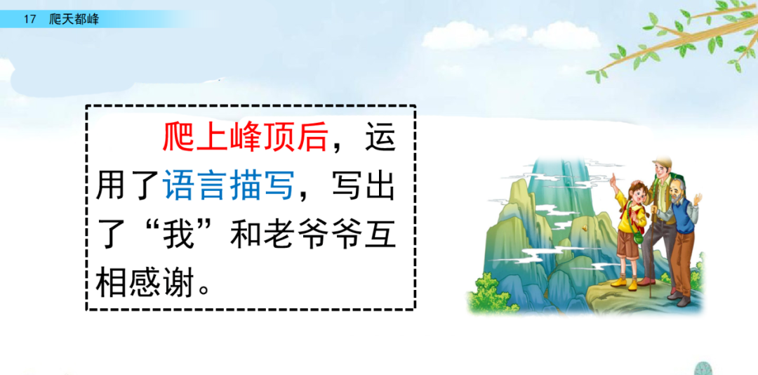 大家好!为了帮助孩子们学好统编版语文新教材,小编继续推出全新栏目——“统编版教材同步课文微课堂(上册)”(包括知识要点、课文朗读、课件解读、视频教学和同步练习)。欢迎大家分享+收藏哦~ 04 爬天都峰 课文朗读 微课视频 01 微课视频一 02 微课视频二 03 生字微课视频 课文知识点 1.会认“级、链”5个生字,认识多音字“相”,会写“哩、级”10个生字。正确读写“假日、抬头、云彩、石级”等词语。 2.有感情地分角色朗读课文,把握课文的主要内容,体会“我”和老爷爷是如何互相鼓励、坚定信心、战胜困难的。 3.体会作者是怎样把爬天都峰这件事写清楚的。 二、教材分析 这是一篇精读课文。课文讲的是在假日里,“我”和爸爸去爬天都峰,遇上一位素不相识的老大爷,“我们”互相鼓励,克服山高路陡的困难,终于一起爬上了天都峰。课文向人们揭示了在困难面前,要有战胜困难的勇气和信心;在与人相处的过程中,要善于互相学习,互相鼓励,共同进步的道理。 三、我会写组词 级:jí(石级、高级、初级) 链:liàn(铁链、表链、锁链) 颤:chàn(发颤、颤动、颤抖) 攀:pān(攀登、攀岩、攀爬) 猴:hóu(猴子、耍猴、猴急) 鲫:jì(鲫鱼、石鲫、花鲫鱼) 念:niàn(纪念、惦念、想念) 辫:biàn(辫子、小辫儿、草帽辫儿) 呵:hē(呵护、呵气、呵斥) 相:xiàng(相片、相机、相貌) 五、多音字 都:dū(首都)dōu(都是) 发:fà (白发)fā(发现) 相:xiàng(照相)xiāng(互相) 六、近义词 似乎一一好像 发颤一一发抖 鼓舞一一鼓励 居然一一竟然 汲取一一吸取 七、反义词 仰一一俯 笔陡一一平坦 鼓舞一一打击 奋力——松懈 抬头——低头 八、理解词语 笔陡:笔直陡峭。 白发苍苍:头发灰白,形容人苍老。 奋力:充分鼓起劲来。 终于:表示经过较长过程最后出现某种情况(多用于希望达到的结果)。 鼓舞:使振作起来,增强信心或勇气。 居然:表示出乎意料;竟然。造句:没想到我居然考了全班第一名。 汲取:吸取。造句:我们互相汲取力量,最终完成了艰巨的任务。 九、句子解析 1.再看看笔陡的石级,石级边上的铁链,似乎是从天上挂下来的,真叫人发颤! 一个“挂”字形象、生动地把天都峰的“陡”体现得淋漓尽致,这样的天都峰,光是看着就让人感到害怕,更别说攀登了。 2.我奋力向峰顶爬去,一会儿攀着铁链上,一会儿手脚并用向上爬,像小猴子一样…… 课文中用“奋力”“一会儿……一会儿……”“攀着铁链”“手脚并用”等词语,既突出了爬天都峰的艰难,又表现了他们不怕困难的勇气。 3.爬呀爬,我和老爷爷,还有爸爸,终于都爬上了天都峰顶。 “终于”表明我们克服重重困难爬上了天都峰顶,体现了我们奋力攀登、勇往直前的精神。 4.爸爸听了,笑着说:“你们这一老一小真有意思,都会从别人身上汲取力量!” 懂得了困难面前,要有战胜困难的勇气和信心;在与人相处的过程中,要善于互相学习、互相鼓励、共同进步的道理。 十、问题归纳 1.读课文,想一想课文写了什么? 本文写了“我”和爸爸在假日里去爬天都峰时遇到一位素不相识的老爷爷,“我”和老爷爷互相鼓励,克服山高路陡的困难,终于一起爬上天都峰的事。 天都峰视频 2.在爬天都峰的过程中,“我”的心理发生了怎样的变化? 在爬之前,望着又高又陡的天都峰,“我”缺乏自信,产生了畏惧的心理;在与老爷爷相遇并交谈后,“我”受到鼓舞,有了爬向峰顶的勇气;最后“我”克服重重困难,奋力爬上了天都峰顶,此时,“我”既兴奋又激动 3.老爷爷为什么要谢“我”?“我”为什么又要谢老爷爷? 说明有了“我”和“老爷爷”的互相鼓励,才使我们有了爬天都峰的勇气和决心,使“我”和“老爷爷”爬上了天都峰。 九、课文分段 第一段(第1自然段):写暑假里爸爸带“我”爬天都峰。 第二段(第2自然段):写天都峰的高和陡。 第三段(第3-7自然段):写“我”在一位老爷爷的带动下,爬上了天都峰。 第四段(第8-10自然段):写爬上天都峰后,“我”和老爷爷互相道谢。 十一、课文主题 本文写了在假日里,“我”和爸爸去爬天都峰,路遇一位素不相识的老爷爷,“我们”互相鼓励,克服困难,终于一起爬上了天都峰顶的事。本文向人们揭示了在困难面前,要有战胜困难的勇气和信心;在与人相处的过程中,要相互学习,相互鼓励,共同进步的道理。 十二、教材课后习题 1.这篇课文写了一件什么事,是按照什么顺序写的? 写了作者爬天都峰的事。 按照爬山前——爬山时——爬山后来写的。 2.“我”开始不敢爬,最后爬上去了。课文是怎么把“我”爬山的过程写清楚的? 爬山前,作者用了夸张的修辞手法写出了山的“高”和“陡”,运用了心理描写,写出了“我”的胆怯,“我”和老爷爷互相鼓励,运用了语言描写。爬山时,抓住“我”的动作和样子来写,“奋力”“手脚并用”表现出“我”爬山的艰难和奋力攀登、勇往直前的精神;“一会儿……一会儿……”将奋力攀登天都峰的“我”比作“小猴子”,写出了“我”爬天都峰时的样子。爬山后,运用了语言描写,写出了“我”和老爷爷互相感谢。 同步课件 同步练习 01 同步练习一 参考答案 02 同步练习二 END