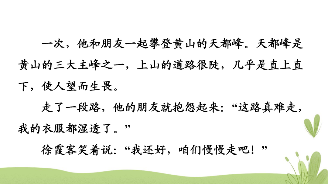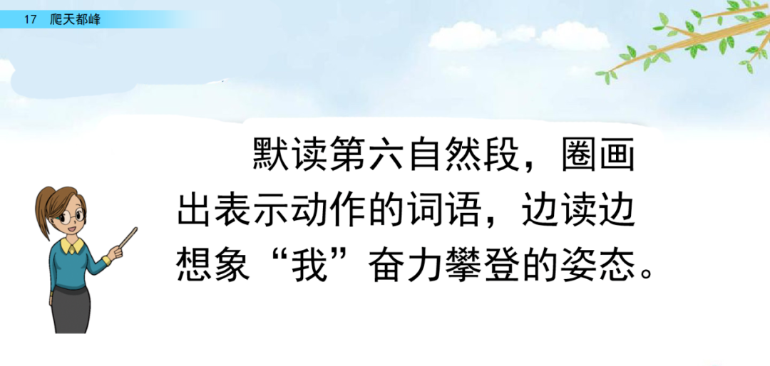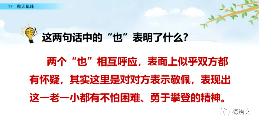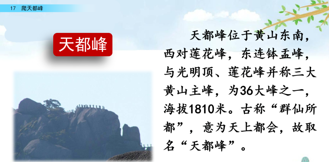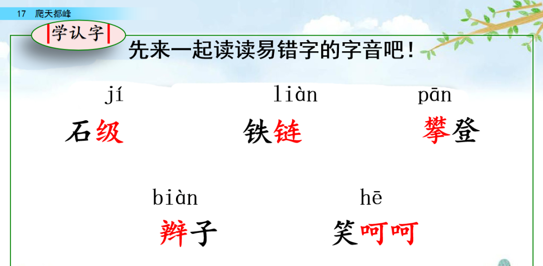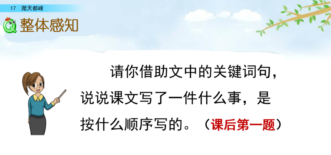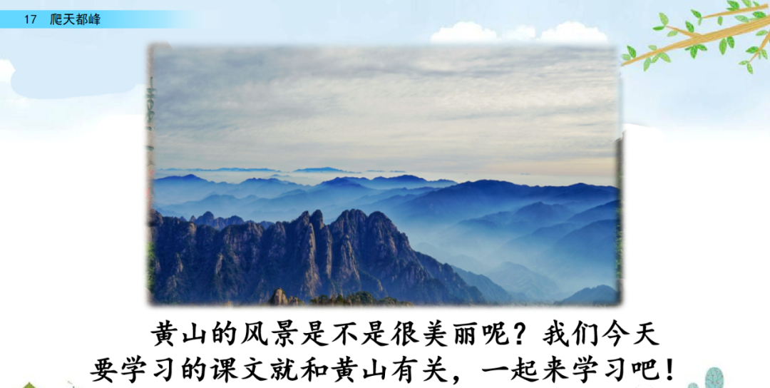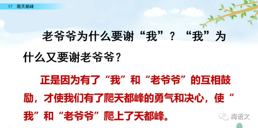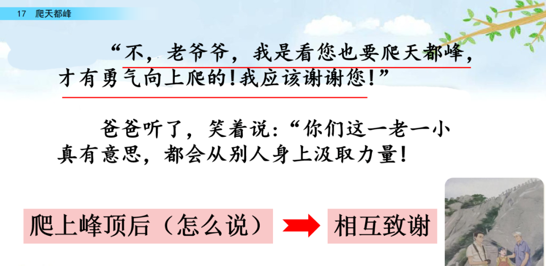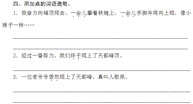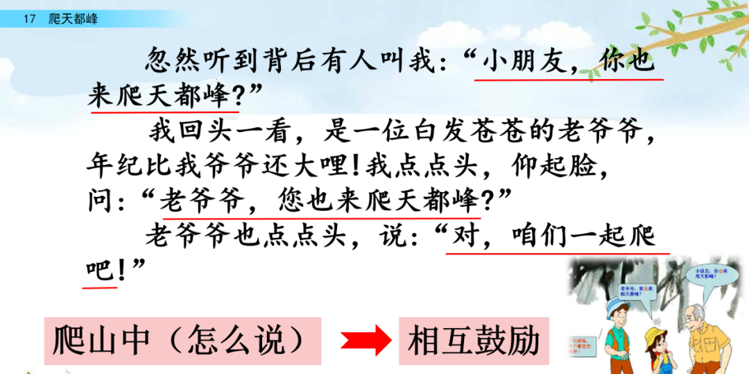 大家好!为了帮助孩子们学好统编版语文新教材,小编继续推出全新栏目——“统编版教材同步课文微课堂(上册)”(包括知识要点、课文朗读、课件解读、视频教学和同步练习)。欢迎大家分享+收藏哦~ 04 爬天都峰 课文朗读 微课视频 01 微课视频一 02 微课视频二 03 生字微课视频 课文知识点 1.会认“级、链”5个生字,认识多音字“相”,会写“哩、级”10个生字。正确读写“假日、抬头、云彩、石级”等词语。 2.有感情地分角色朗读课文,把握课文的主要内容,体会“我”和老爷爷是如何互相鼓励、坚定信心、战胜困难的。 3.体会作者是怎样把爬天都峰这件事写清楚的。 二、教材分析 这是一篇精读课文。课文讲的是在假日里,“我”和爸爸去爬天都峰,遇上一位素不相识的老大爷,“我们”互相鼓励,克服山高路陡的困难,终于一起爬上了天都峰。课文向人们揭示了在困难面前,要有战胜困难的勇气和信心;在与人相处的过程中,要善于互相学习,互相鼓励,共同进步的道理。 三、我会写组词 级:jí(石级、高级、初级) 链:liàn(铁链、表链、锁链) 颤:chàn(发颤、颤动、颤抖) 攀:pān(攀登、攀岩、攀爬) 猴:hóu(猴子、耍猴、猴急) 鲫:jì(鲫鱼、石鲫、花鲫鱼) 念:niàn(纪念、惦念、想念) 辫:biàn(辫子、小辫儿、草帽辫儿) 呵:hē(呵护、呵气、呵斥) 相:xiàng(相片、相机、相貌) 五、多音字 都:dū(首都)dōu(都是) 发:fà (白发)fā(发现) 相:xiàng(照相)xiāng(互相) 六、近义词 似乎一一好像 发颤一一发抖 鼓舞一一鼓励 居然一一竟然 汲取一一吸取 七、反义词 仰一一俯 笔陡一一平坦 鼓舞一一打击 奋力——松懈 抬头——低头 八、理解词语 笔陡:笔直陡峭。 白发苍苍:头发灰白,形容人苍老。 奋力:充分鼓起劲来。 终于:表示经过较长过程最后出现某种情况(多用于希望达到的结果)。 鼓舞:使振作起来,增强信心或勇气。 居然:表示出乎意料;竟然。造句:没想到我居然考了全班第一名。 汲取:吸取。造句:我们互相汲取力量,最终完成了艰巨的任务。 九、句子解析 1.再看看笔陡的石级,石级边上的铁链,似乎是从天上挂下来的,真叫人发颤! 一个“挂”字形象、生动地把天都峰的“陡”体现得淋漓尽致,这样的天都峰,光是看着就让人感到害怕,更别说攀登了。 2.我奋力向峰顶爬去,一会儿攀着铁链上,一会儿手脚并用向上爬,像小猴子一样…… 课文中用“奋力”“一会儿……一会儿……”“攀着铁链”“手脚并用”等词语,既突出了爬天都峰的艰难,又表现了他们不怕困难的勇气。 3.爬呀爬,我和老爷爷,还有爸爸,终于都爬上了天都峰顶。 “终于”表明我们克服重重困难爬上了天都峰顶,体现了我们奋力攀登、勇往直前的精神。 4.爸爸听了,笑着说:“你们这一老一小真有意思,都会从别人身上汲取力量!” 懂得了困难面前,要有战胜困难的勇气和信心;在与人相处的过程中,要善于互相学习、互相鼓励、共同进步的道理。 十、问题归纳 1.读课文,想一想课文写了什么? 本文写了“我”和爸爸在假日里去爬天都峰时遇到一位素不相识的老爷爷,“我”和老爷爷互相鼓励,克服山高路陡的困难,终于一起爬上天都峰的事。 天都峰视频 2.在爬天都峰的过程中,“我”的心理发生了怎样的变化? 在爬之前,望着又高又陡的天都峰,“我”缺乏自信,产生了畏惧的心理;在与老爷爷相遇并交谈后,“我”受到鼓舞,有了爬向峰顶的勇气;最后“我”克服重重困难,奋力爬上了天都峰顶,此时,“我”既兴奋又激动 3.老爷爷为什么要谢“我”?“我”为什么又要谢老爷爷? 说明有了“我”和“老爷爷”的互相鼓励,才使我们有了爬天都峰的勇气和决心,使“我”和“老爷爷”爬上了天都峰。 九、课文分段 第一段(第1自然段):写暑假里爸爸带“我”爬天都峰。 第二段(第2自然段):写天都峰的高和陡。 第三段(第3-7自然段):写“我”在一位老爷爷的带动下,爬上了天都峰。 第四段(第8-10自然段):写爬上天都峰后,“我”和老爷爷互相道谢。 十一、课文主题 本文写了在假日里,“我”和爸爸去爬天都峰,路遇一位素不相识的老爷爷,“我们”互相鼓励,克服困难,终于一起爬上了天都峰顶的事。本文向人们揭示了在困难面前,要有战胜困难的勇气和信心;在与人相处的过程中,要相互学习,相互鼓励,共同进步的道理。 十二、教材课后习题 1.这篇课文写了一件什么事,是按照什么顺序写的? 写了作者爬天都峰的事。 按照爬山前——爬山时——爬山后来写的。 2.“我”开始不敢爬,最后爬上去了。课文是怎么把“我”爬山的过程写清楚的? 爬山前,作者用了夸张的修辞手法写出了山的“高”和“陡”,运用了心理描写,写出了“我”的胆怯,“我”和老爷爷互相鼓励,运用了语言描写。爬山时,抓住“我”的动作和样子来写,“奋力”“手脚并用”表现出“我”爬山的艰难和奋力攀登、勇往直前的精神;“一会儿……一会儿……”将奋力攀登天都峰的“我”比作“小猴子”,写出了“我”爬天都峰时的样子。爬山后,运用了语言描写,写出了“我”和老爷爷互相感谢。 同步课件 同步练习 01 同步练习一 参考答案 02 同步练习二 END