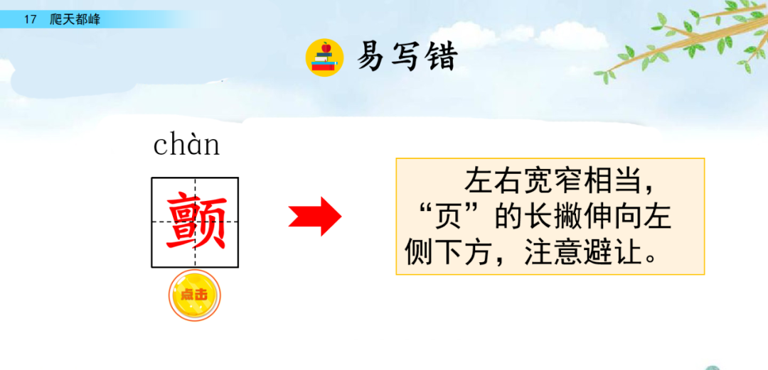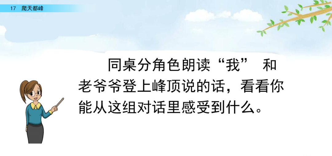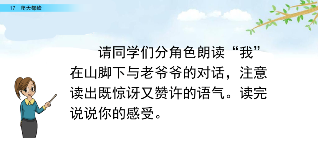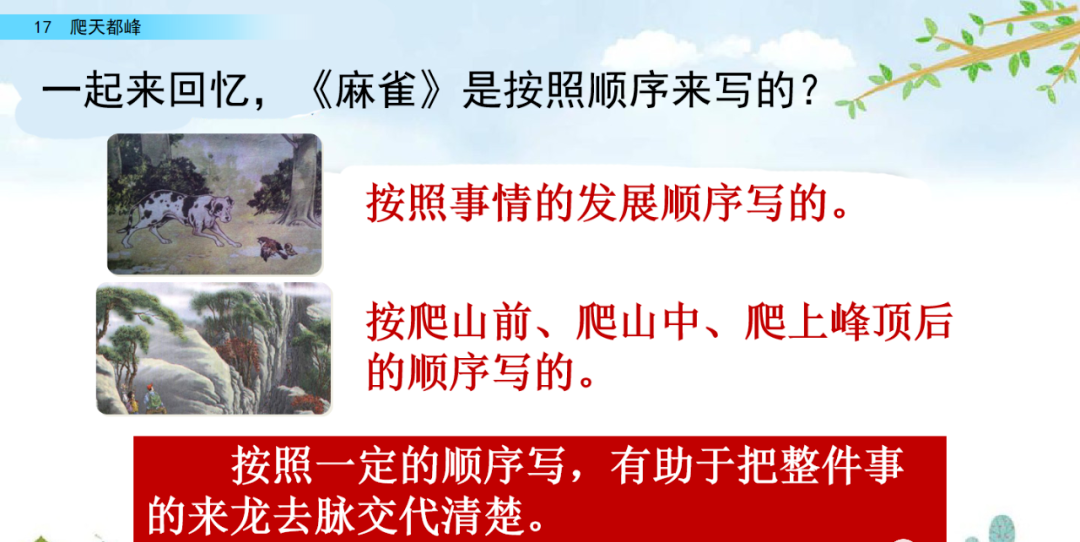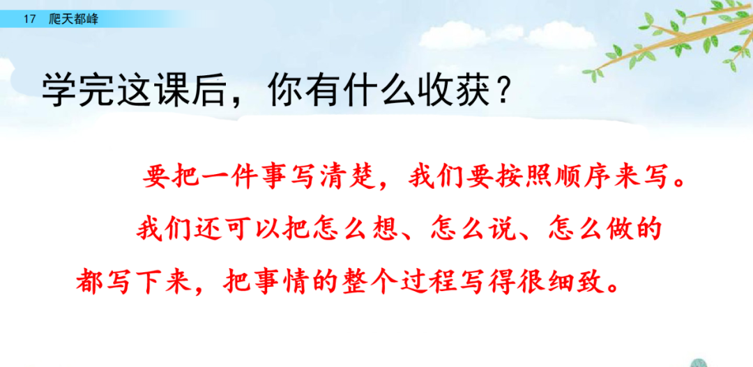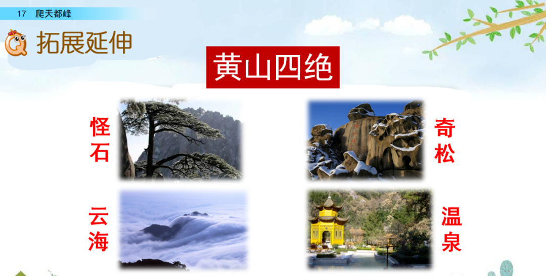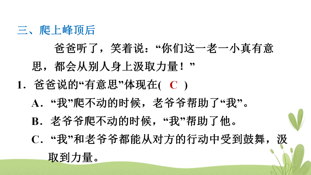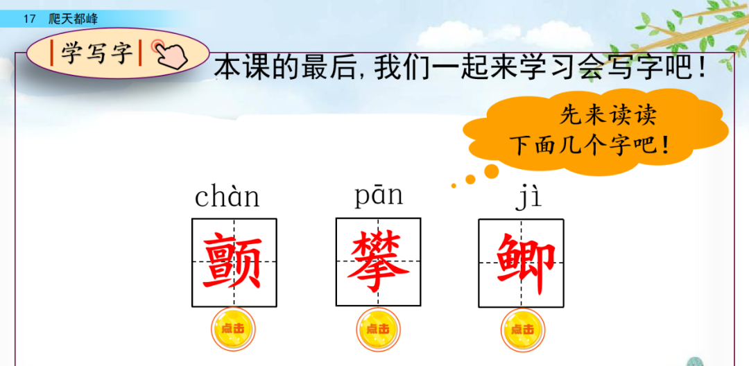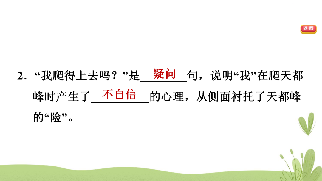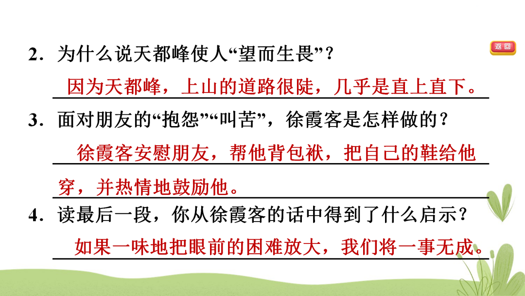 大家好!为了帮助孩子们学好统编版语文新教材,小编继续推出全新栏目——“统编版教材同步课文微课堂(上册)”(包括知识要点、课文朗读、课件解读、视频教学和同步练习)。欢迎大家分享+收藏哦~ 04 爬天都峰 课文朗读 微课视频 01 微课视频一 02 微课视频二 03 生字微课视频 课文知识点 1.会认“级、链”5个生字,认识多音字“相”,会写“哩、级”10个生字。正确读写“假日、抬头、云彩、石级”等词语。 2.有感情地分角色朗读课文,把握课文的主要内容,体会“我”和老爷爷是如何互相鼓励、坚定信心、战胜困难的。 3.体会作者是怎样把爬天都峰这件事写清楚的。 二、教材分析 这是一篇精读课文。课文讲的是在假日里,“我”和爸爸去爬天都峰,遇上一位素不相识的老大爷,“我们”互相鼓励,克服山高路陡的困难,终于一起爬上了天都峰。课文向人们揭示了在困难面前,要有战胜困难的勇气和信心;在与人相处的过程中,要善于互相学习,互相鼓励,共同进步的道理。 三、我会写组词 级:jí(石级、高级、初级) 链:liàn(铁链、表链、锁链) 颤:chàn(发颤、颤动、颤抖) 攀:pān(攀登、攀岩、攀爬) 猴:hóu(猴子、耍猴、猴急) 鲫:jì(鲫鱼、石鲫、花鲫鱼) 念:niàn(纪念、惦念、想念) 辫:biàn(辫子、小辫儿、草帽辫儿) 呵:hē(呵护、呵气、呵斥) 相:xiàng(相片、相机、相貌) 五、多音字 都:dū(首都)dōu(都是) 发:fà (白发)fā(发现) 相:xiàng(照相)xiāng(互相) 六、近义词 似乎一一好像 发颤一一发抖 鼓舞一一鼓励 居然一一竟然 汲取一一吸取 七、反义词 仰一一俯 笔陡一一平坦 鼓舞一一打击 奋力——松懈 抬头——低头 八、理解词语 笔陡:笔直陡峭。 白发苍苍:头发灰白,形容人苍老。 奋力:充分鼓起劲来。 终于:表示经过较长过程最后出现某种情况(多用于希望达到的结果)。 鼓舞:使振作起来,增强信心或勇气。 居然:表示出乎意料;竟然。造句:没想到我居然考了全班第一名。 汲取:吸取。造句:我们互相汲取力量,最终完成了艰巨的任务。 九、句子解析 1.再看看笔陡的石级,石级边上的铁链,似乎是从天上挂下来的,真叫人发颤! 一个“挂”字形象、生动地把天都峰的“陡”体现得淋漓尽致,这样的天都峰,光是看着就让人感到害怕,更别说攀登了。 2.我奋力向峰顶爬去,一会儿攀着铁链上,一会儿手脚并用向上爬,像小猴子一样…… 课文中用“奋力”“一会儿……一会儿……”“攀着铁链”“手脚并用”等词语,既突出了爬天都峰的艰难,又表现了他们不怕困难的勇气。 3.爬呀爬,我和老爷爷,还有爸爸,终于都爬上了天都峰顶。 “终于”表明我们克服重重困难爬上了天都峰顶,体现了我们奋力攀登、勇往直前的精神。 4.爸爸听了,笑着说:“你们这一老一小真有意思,都会从别人身上汲取力量!” 懂得了困难面前,要有战胜困难的勇气和信心;在与人相处的过程中,要善于互相学习、互相鼓励、共同进步的道理。 十、问题归纳 1.读课文,想一想课文写了什么? 本文写了“我”和爸爸在假日里去爬天都峰时遇到一位素不相识的老爷爷,“我”和老爷爷互相鼓励,克服山高路陡的困难,终于一起爬上天都峰的事。 天都峰视频 2.在爬天都峰的过程中,“我”的心理发生了怎样的变化? 在爬之前,望着又高又陡的天都峰,“我”缺乏自信,产生了畏惧的心理;在与老爷爷相遇并交谈后,“我”受到鼓舞,有了爬向峰顶的勇气;最后“我”克服重重困难,奋力爬上了天都峰顶,此时,“我”既兴奋又激动 3.老爷爷为什么要谢“我”?“我”为什么又要谢老爷爷? 说明有了“我”和“老爷爷”的互相鼓励,才使我们有了爬天都峰的勇气和决心,使“我”和“老爷爷”爬上了天都峰。 九、课文分段 第一段(第1自然段):写暑假里爸爸带“我”爬天都峰。 第二段(第2自然段):写天都峰的高和陡。 第三段(第3-7自然段):写“我”在一位老爷爷的带动下,爬上了天都峰。 第四段(第8-10自然段):写爬上天都峰后,“我”和老爷爷互相道谢。 十一、课文主题 本文写了在假日里,“我”和爸爸去爬天都峰,路遇一位素不相识的老爷爷,“我们”互相鼓励,克服困难,终于一起爬上了天都峰顶的事。本文向人们揭示了在困难面前,要有战胜困难的勇气和信心;在与人相处的过程中,要相互学习,相互鼓励,共同进步的道理。 十二、教材课后习题 1.这篇课文写了一件什么事,是按照什么顺序写的? 写了作者爬天都峰的事。 按照爬山前——爬山时——爬山后来写的。 2.“我”开始不敢爬,最后爬上去了。课文是怎么把“我”爬山的过程写清楚的? 爬山前,作者用了夸张的修辞手法写出了山的“高”和“陡”,运用了心理描写,写出了“我”的胆怯,“我”和老爷爷互相鼓励,运用了语言描写。爬山时,抓住“我”的动作和样子来写,“奋力”“手脚并用”表现出“我”爬山的艰难和奋力攀登、勇往直前的精神;“一会儿……一会儿……”将奋力攀登天都峰的“我”比作“小猴子”,写出了“我”爬天都峰时的样子。爬山后,运用了语言描写,写出了“我”和老爷爷互相感谢。 同步课件 同步练习 01 同步练习一 参考答案 02 同步练习二 END