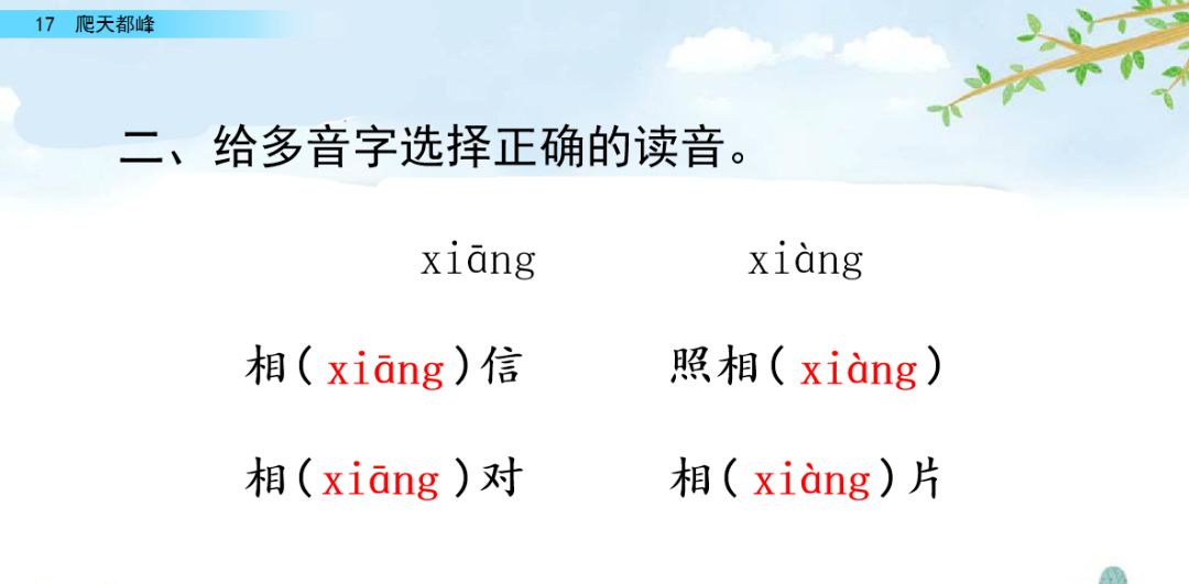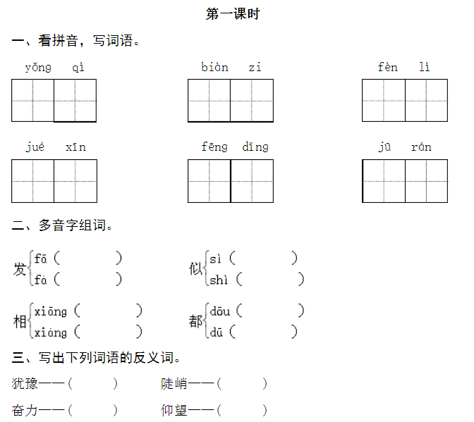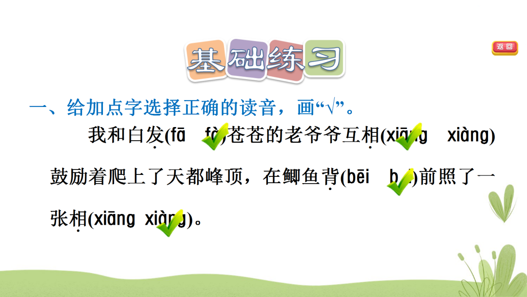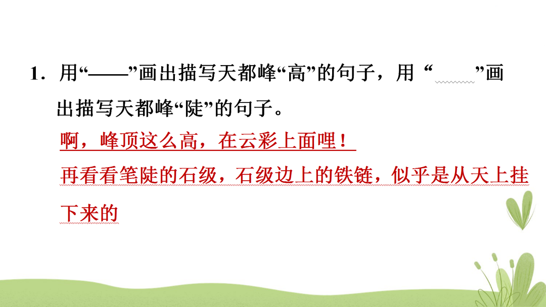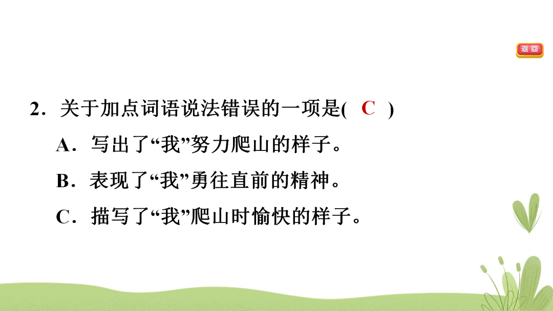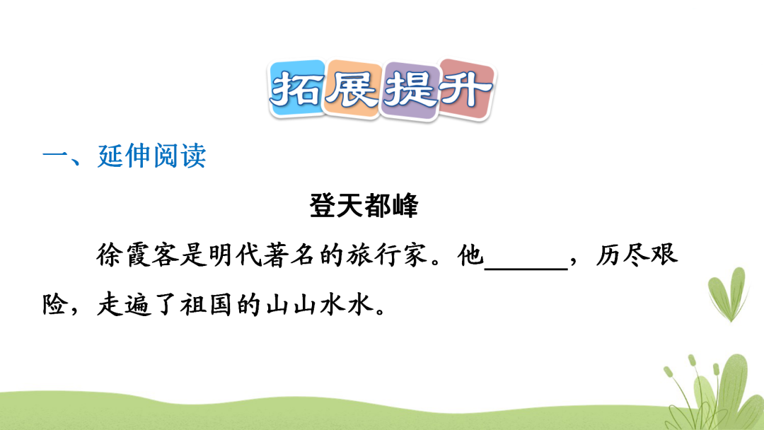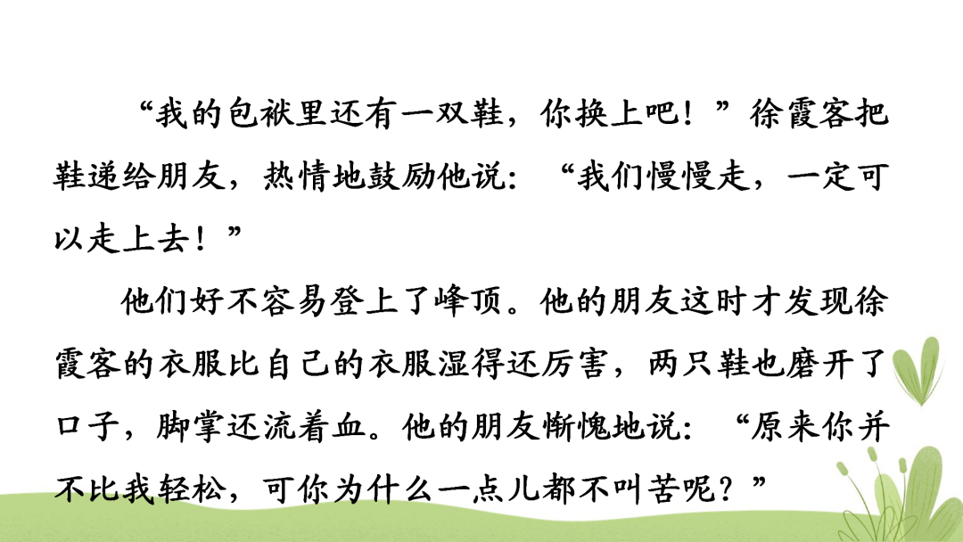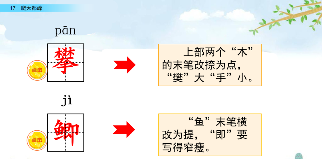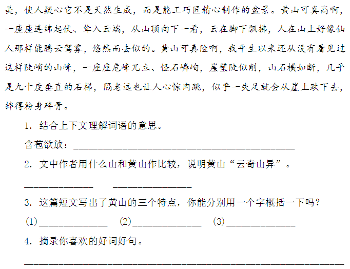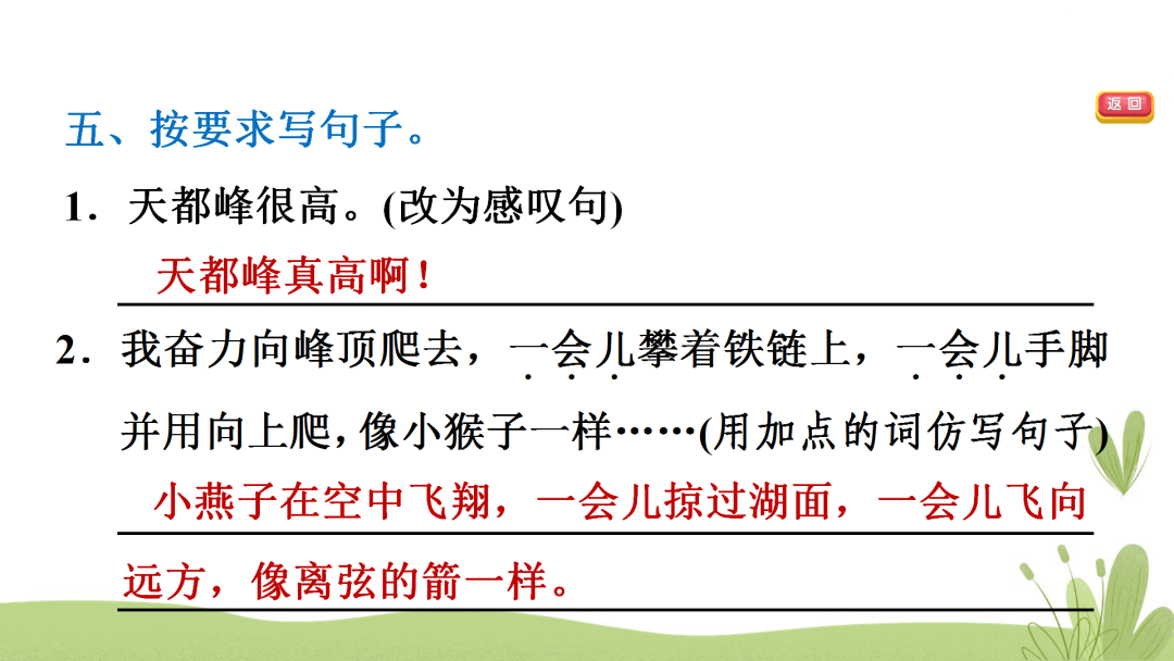 大家好!为了帮助孩子们学好统编版语文新教材,小编继续推出全新栏目——“统编版教材同步课文微课堂(上册)”(包括知识要点、课文朗读、课件解读、视频教学和同步练习)。欢迎大家分享+收藏哦~ 04 爬天都峰 课文朗读 微课视频 01 微课视频一 02 微课视频二 03 生字微课视频 课文知识点 1.会认“级、链”5个生字,认识多音字“相”,会写“哩、级”10个生字。正确读写“假日、抬头、云彩、石级”等词语。 2.有感情地分角色朗读课文,把握课文的主要内容,体会“我”和老爷爷是如何互相鼓励、坚定信心、战胜困难的。 3.体会作者是怎样把爬天都峰这件事写清楚的。 二、教材分析 这是一篇精读课文。课文讲的是在假日里,“我”和爸爸去爬天都峰,遇上一位素不相识的老大爷,“我们”互相鼓励,克服山高路陡的困难,终于一起爬上了天都峰。课文向人们揭示了在困难面前,要有战胜困难的勇气和信心;在与人相处的过程中,要善于互相学习,互相鼓励,共同进步的道理。 三、我会写组词 级:jí(石级、高级、初级) 链:liàn(铁链、表链、锁链) 颤:chàn(发颤、颤动、颤抖) 攀:pān(攀登、攀岩、攀爬) 猴:hóu(猴子、耍猴、猴急) 鲫:jì(鲫鱼、石鲫、花鲫鱼) 念:niàn(纪念、惦念、想念) 辫:biàn(辫子、小辫儿、草帽辫儿) 呵:hē(呵护、呵气、呵斥) 相:xiàng(相片、相机、相貌) 五、多音字 都:dū(首都)dōu(都是) 发:fà (白发)fā(发现) 相:xiàng(照相)xiāng(互相) 六、近义词 似乎一一好像 发颤一一发抖 鼓舞一一鼓励 居然一一竟然 汲取一一吸取 七、反义词 仰一一俯 笔陡一一平坦 鼓舞一一打击 奋力——松懈 抬头——低头 八、理解词语 笔陡:笔直陡峭。 白发苍苍:头发灰白,形容人苍老。 奋力:充分鼓起劲来。 终于:表示经过较长过程最后出现某种情况(多用于希望达到的结果)。 鼓舞:使振作起来,增强信心或勇气。 居然:表示出乎意料;竟然。造句:没想到我居然考了全班第一名。 汲取:吸取。造句:我们互相汲取力量,最终完成了艰巨的任务。 九、句子解析 1.再看看笔陡的石级,石级边上的铁链,似乎是从天上挂下来的,真叫人发颤! 一个“挂”字形象、生动地把天都峰的“陡”体现得淋漓尽致,这样的天都峰,光是看着就让人感到害怕,更别说攀登了。 2.我奋力向峰顶爬去,一会儿攀着铁链上,一会儿手脚并用向上爬,像小猴子一样…… 课文中用“奋力”“一会儿……一会儿……”“攀着铁链”“手脚并用”等词语,既突出了爬天都峰的艰难,又表现了他们不怕困难的勇气。 3.爬呀爬,我和老爷爷,还有爸爸,终于都爬上了天都峰顶。 “终于”表明我们克服重重困难爬上了天都峰顶,体现了我们奋力攀登、勇往直前的精神。 4.爸爸听了,笑着说:“你们这一老一小真有意思,都会从别人身上汲取力量!” 懂得了困难面前,要有战胜困难的勇气和信心;在与人相处的过程中,要善于互相学习、互相鼓励、共同进步的道理。 十、问题归纳 1.读课文,想一想课文写了什么? 本文写了“我”和爸爸在假日里去爬天都峰时遇到一位素不相识的老爷爷,“我”和老爷爷互相鼓励,克服山高路陡的困难,终于一起爬上天都峰的事。 天都峰视频 2.在爬天都峰的过程中,“我”的心理发生了怎样的变化? 在爬之前,望着又高又陡的天都峰,“我”缺乏自信,产生了畏惧的心理;在与老爷爷相遇并交谈后,“我”受到鼓舞,有了爬向峰顶的勇气;最后“我”克服重重困难,奋力爬上了天都峰顶,此时,“我”既兴奋又激动 3.老爷爷为什么要谢“我”?“我”为什么又要谢老爷爷? 说明有了“我”和“老爷爷”的互相鼓励,才使我们有了爬天都峰的勇气和决心,使“我”和“老爷爷”爬上了天都峰。 九、课文分段 第一段(第1自然段):写暑假里爸爸带“我”爬天都峰。 第二段(第2自然段):写天都峰的高和陡。 第三段(第3-7自然段):写“我”在一位老爷爷的带动下,爬上了天都峰。 第四段(第8-10自然段):写爬上天都峰后,“我”和老爷爷互相道谢。 十一、课文主题 本文写了在假日里,“我”和爸爸去爬天都峰,路遇一位素不相识的老爷爷,“我们”互相鼓励,克服困难,终于一起爬上了天都峰顶的事。本文向人们揭示了在困难面前,要有战胜困难的勇气和信心;在与人相处的过程中,要相互学习,相互鼓励,共同进步的道理。 十二、教材课后习题 1.这篇课文写了一件什么事,是按照什么顺序写的? 写了作者爬天都峰的事。 按照爬山前——爬山时——爬山后来写的。 2.“我”开始不敢爬,最后爬上去了。课文是怎么把“我”爬山的过程写清楚的? 爬山前,作者用了夸张的修辞手法写出了山的“高”和“陡”,运用了心理描写,写出了“我”的胆怯,“我”和老爷爷互相鼓励,运用了语言描写。爬山时,抓住“我”的动作和样子来写,“奋力”“手脚并用”表现出“我”爬山的艰难和奋力攀登、勇往直前的精神;“一会儿……一会儿……”将奋力攀登天都峰的“我”比作“小猴子”,写出了“我”爬天都峰时的样子。爬山后,运用了语言描写,写出了“我”和老爷爷互相感谢。 同步课件 同步练习 01 同步练习一 参考答案 02 同步练习二 END