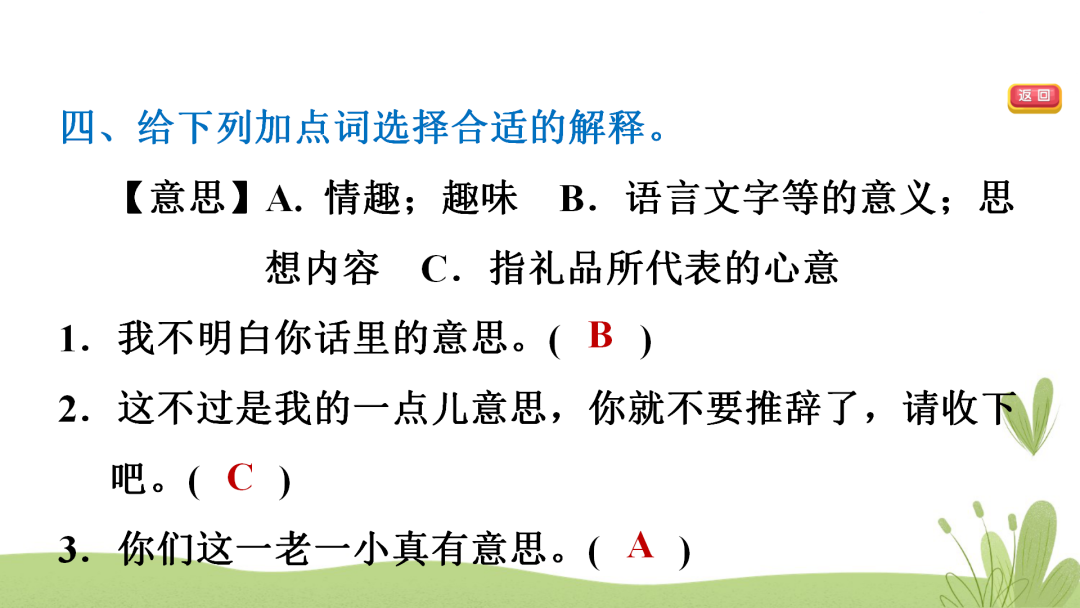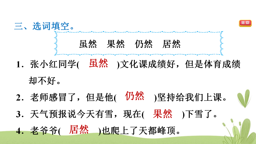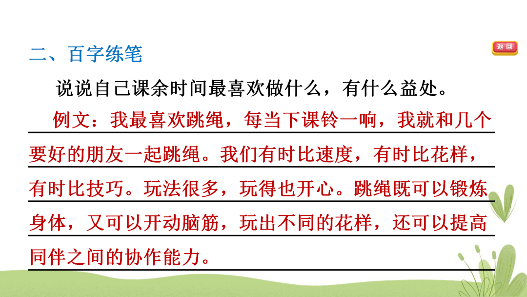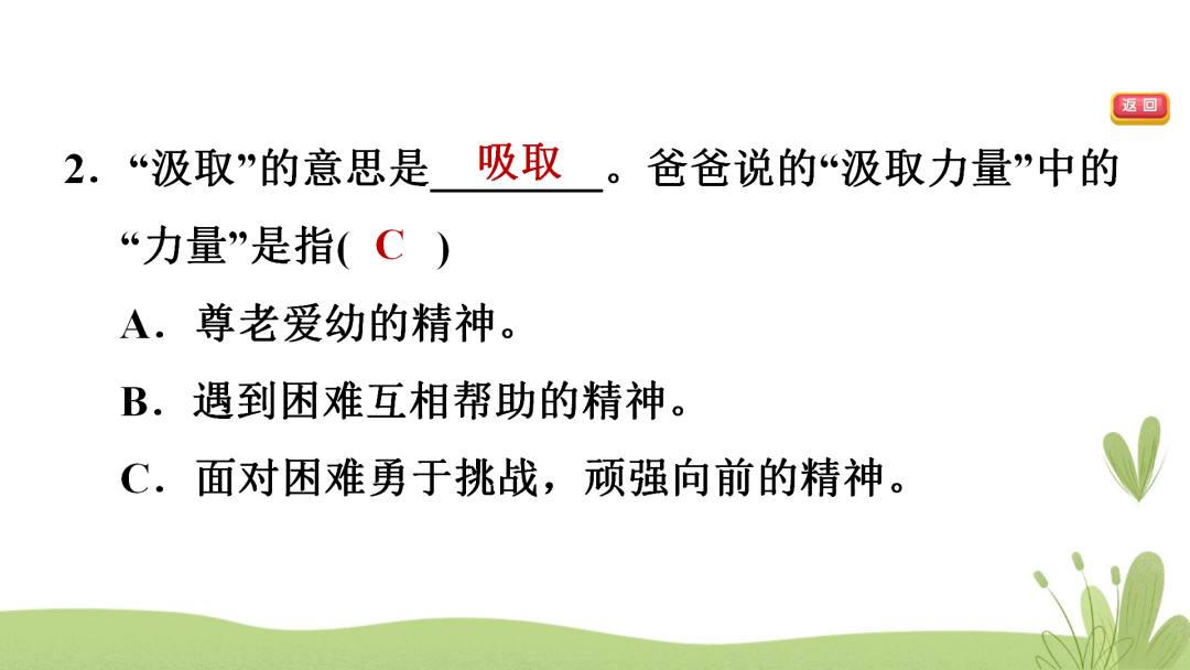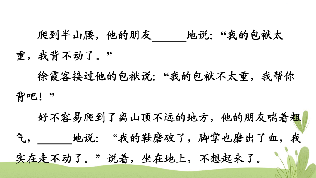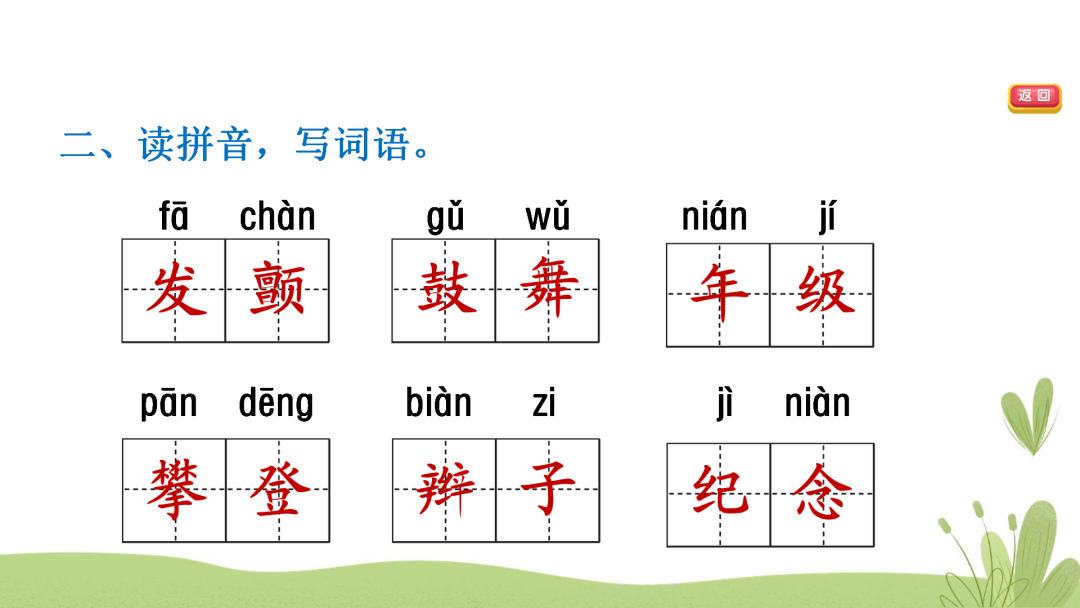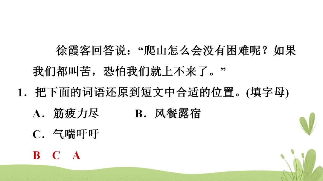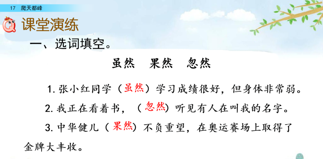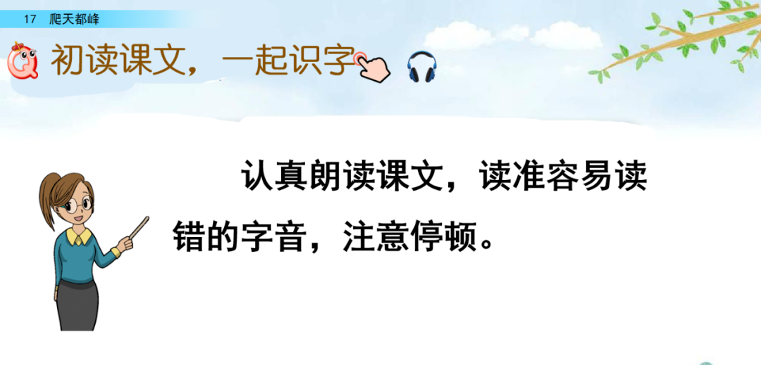 大家好!为了帮助孩子们学好统编版语文新教材,小编继续推出全新栏目——“统编版教材同步课文微课堂(上册)”(包括知识要点、课文朗读、课件解读、视频教学和同步练习)。欢迎大家分享+收藏哦~ 04 爬天都峰 课文朗读 微课视频 01 微课视频一 02 微课视频二 03 生字微课视频 课文知识点 1.会认“级、链”5个生字,认识多音字“相”,会写“哩、级”10个生字。正确读写“假日、抬头、云彩、石级”等词语。 2.有感情地分角色朗读课文,把握课文的主要内容,体会“我”和老爷爷是如何互相鼓励、坚定信心、战胜困难的。 3.体会作者是怎样把爬天都峰这件事写清楚的。 二、教材分析 这是一篇精读课文。课文讲的是在假日里,“我”和爸爸去爬天都峰,遇上一位素不相识的老大爷,“我们”互相鼓励,克服山高路陡的困难,终于一起爬上了天都峰。课文向人们揭示了在困难面前,要有战胜困难的勇气和信心;在与人相处的过程中,要善于互相学习,互相鼓励,共同进步的道理。 三、我会写组词 级:jí(石级、高级、初级) 链:liàn(铁链、表链、锁链) 颤:chàn(发颤、颤动、颤抖) 攀:pān(攀登、攀岩、攀爬) 猴:hóu(猴子、耍猴、猴急) 鲫:jì(鲫鱼、石鲫、花鲫鱼) 念:niàn(纪念、惦念、想念) 辫:biàn(辫子、小辫儿、草帽辫儿) 呵:hē(呵护、呵气、呵斥) 相:xiàng(相片、相机、相貌) 五、多音字 都:dū(首都)dōu(都是) 发:fà (白发)fā(发现) 相:xiàng(照相)xiāng(互相) 六、近义词 似乎一一好像 发颤一一发抖 鼓舞一一鼓励 居然一一竟然 汲取一一吸取 七、反义词 仰一一俯 笔陡一一平坦 鼓舞一一打击 奋力——松懈 抬头——低头 八、理解词语 笔陡:笔直陡峭。 白发苍苍:头发灰白,形容人苍老。 奋力:充分鼓起劲来。 终于:表示经过较长过程最后出现某种情况(多用于希望达到的结果)。 鼓舞:使振作起来,增强信心或勇气。 居然:表示出乎意料;竟然。造句:没想到我居然考了全班第一名。 汲取:吸取。造句:我们互相汲取力量,最终完成了艰巨的任务。 九、句子解析 1.再看看笔陡的石级,石级边上的铁链,似乎是从天上挂下来的,真叫人发颤! 一个“挂”字形象、生动地把天都峰的“陡”体现得淋漓尽致,这样的天都峰,光是看着就让人感到害怕,更别说攀登了。 2.我奋力向峰顶爬去,一会儿攀着铁链上,一会儿手脚并用向上爬,像小猴子一样…… 课文中用“奋力”“一会儿……一会儿……”“攀着铁链”“手脚并用”等词语,既突出了爬天都峰的艰难,又表现了他们不怕困难的勇气。 3.爬呀爬,我和老爷爷,还有爸爸,终于都爬上了天都峰顶。 “终于”表明我们克服重重困难爬上了天都峰顶,体现了我们奋力攀登、勇往直前的精神。 4.爸爸听了,笑着说:“你们这一老一小真有意思,都会从别人身上汲取力量!” 懂得了困难面前,要有战胜困难的勇气和信心;在与人相处的过程中,要善于互相学习、互相鼓励、共同进步的道理。 十、问题归纳 1.读课文,想一想课文写了什么? 本文写了“我”和爸爸在假日里去爬天都峰时遇到一位素不相识的老爷爷,“我”和老爷爷互相鼓励,克服山高路陡的困难,终于一起爬上天都峰的事。 天都峰视频 2.在爬天都峰的过程中,“我”的心理发生了怎样的变化? 在爬之前,望着又高又陡的天都峰,“我”缺乏自信,产生了畏惧的心理;在与老爷爷相遇并交谈后,“我”受到鼓舞,有了爬向峰顶的勇气;最后“我”克服重重困难,奋力爬上了天都峰顶,此时,“我”既兴奋又激动 3.老爷爷为什么要谢“我”?“我”为什么又要谢老爷爷? 说明有了“我”和“老爷爷”的互相鼓励,才使我们有了爬天都峰的勇气和决心,使“我”和“老爷爷”爬上了天都峰。 九、课文分段 第一段(第1自然段):写暑假里爸爸带“我”爬天都峰。 第二段(第2自然段):写天都峰的高和陡。 第三段(第3-7自然段):写“我”在一位老爷爷的带动下,爬上了天都峰。 第四段(第8-10自然段):写爬上天都峰后,“我”和老爷爷互相道谢。 十一、课文主题 本文写了在假日里,“我”和爸爸去爬天都峰,路遇一位素不相识的老爷爷,“我们”互相鼓励,克服困难,终于一起爬上了天都峰顶的事。本文向人们揭示了在困难面前,要有战胜困难的勇气和信心;在与人相处的过程中,要相互学习,相互鼓励,共同进步的道理。 十二、教材课后习题 1.这篇课文写了一件什么事,是按照什么顺序写的? 写了作者爬天都峰的事。 按照爬山前——爬山时——爬山后来写的。 2.“我”开始不敢爬,最后爬上去了。课文是怎么把“我”爬山的过程写清楚的? 爬山前,作者用了夸张的修辞手法写出了山的“高”和“陡”,运用了心理描写,写出了“我”的胆怯,“我”和老爷爷互相鼓励,运用了语言描写。爬山时,抓住“我”的动作和样子来写,“奋力”“手脚并用”表现出“我”爬山的艰难和奋力攀登、勇往直前的精神;“一会儿……一会儿……”将奋力攀登天都峰的“我”比作“小猴子”,写出了“我”爬天都峰时的样子。爬山后,运用了语言描写,写出了“我”和老爷爷互相感谢。 同步课件 同步练习 01 同步练习一 参考答案 02 同步练习二 END