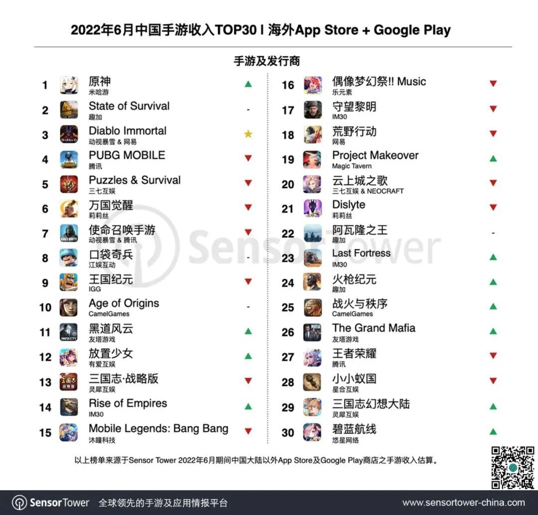 2022 年 6 月成功出海中国手游:《原神》重回收入冠军宝座,《暗黑破坏神:不朽》空降收入榜第三