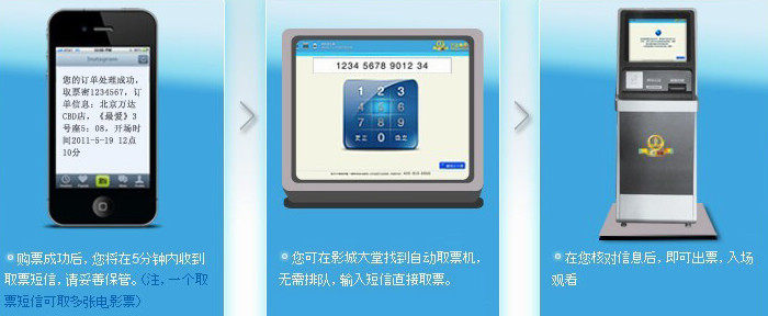 2、在线订座,凭短信密码到影城自助机取票,不排队、不加钱,方便快捷