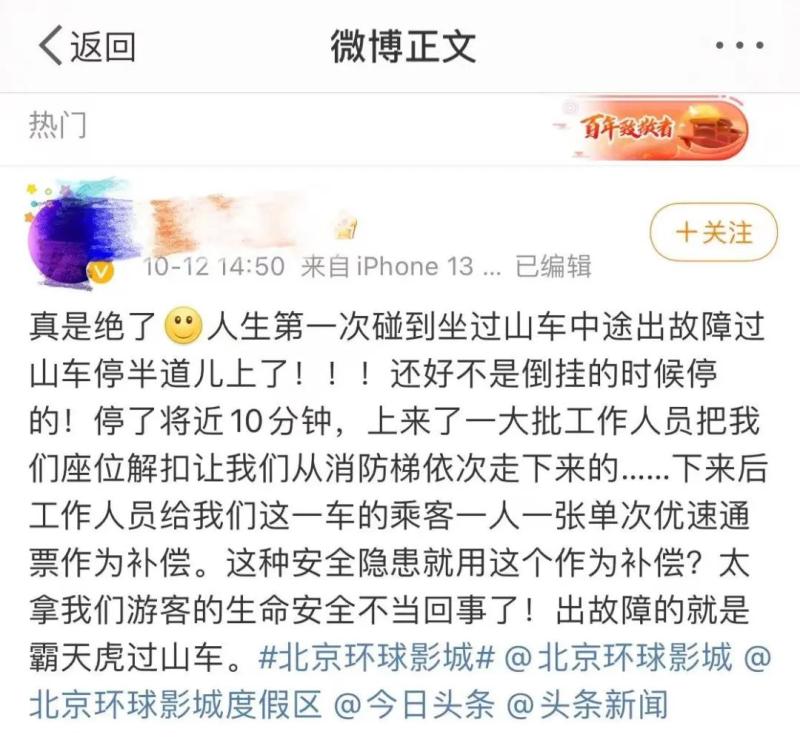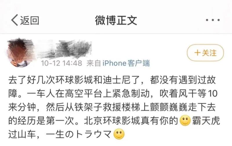 据媒体报道,10月12日下午2点多,北京环球度假区霸天虎过山车在运行中发生故障,列车在轨道上停靠了10分钟后,最终在工作人员的带领下,游客们陆续从轨道旁的维修梯撤离。