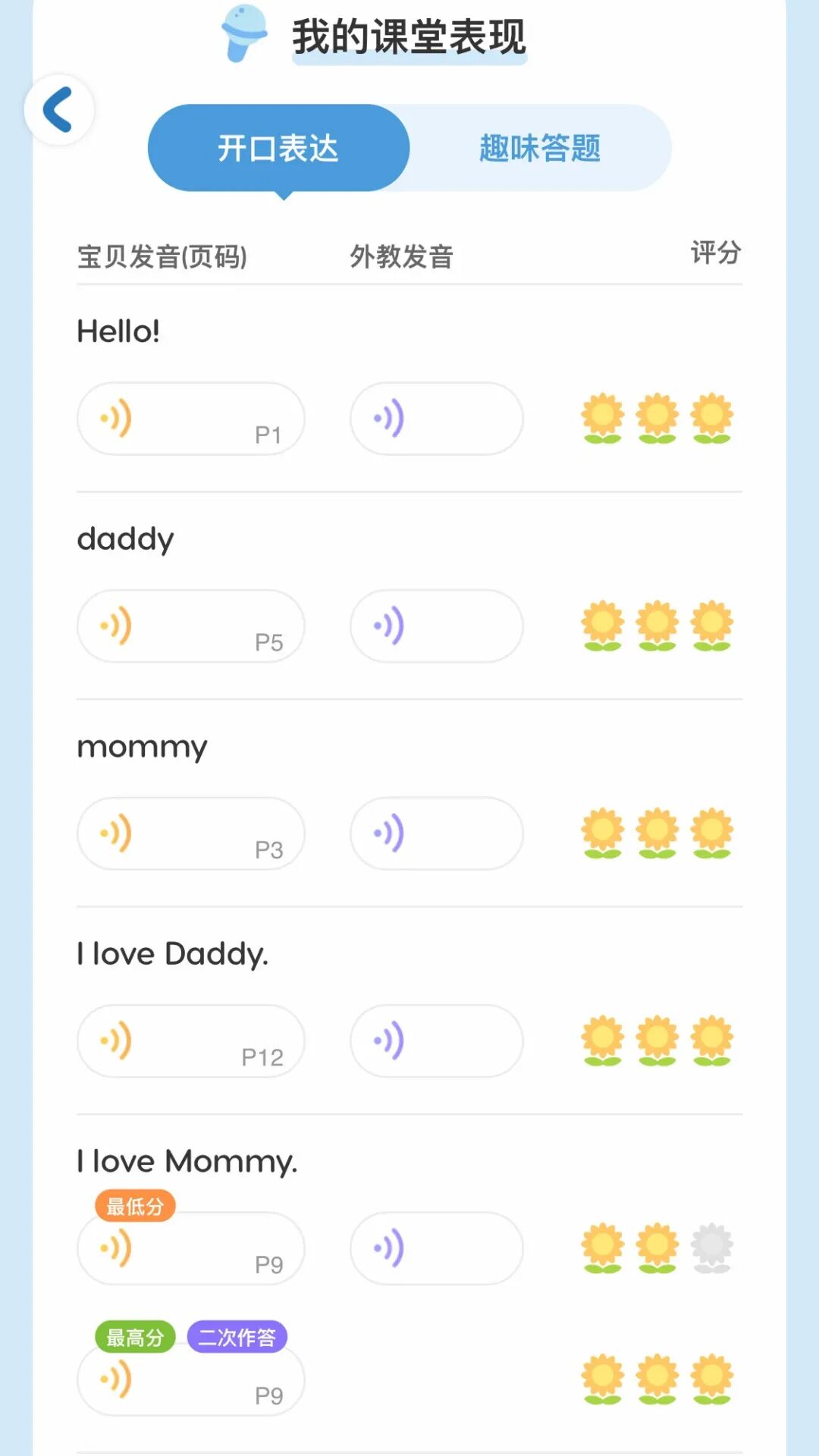 葡萄的AI互动做的比较好,游戏的方式我测评几个软件里最丰富的。反正人家是搜狗的技术团队出身,没毛病。可以在一个课程中有不同的小游戏。而且跟读之后会有一个对比回放。这个还是很不错的。再加上最后的课程报告里也会有回放,会提示哪个单词读的不够好。