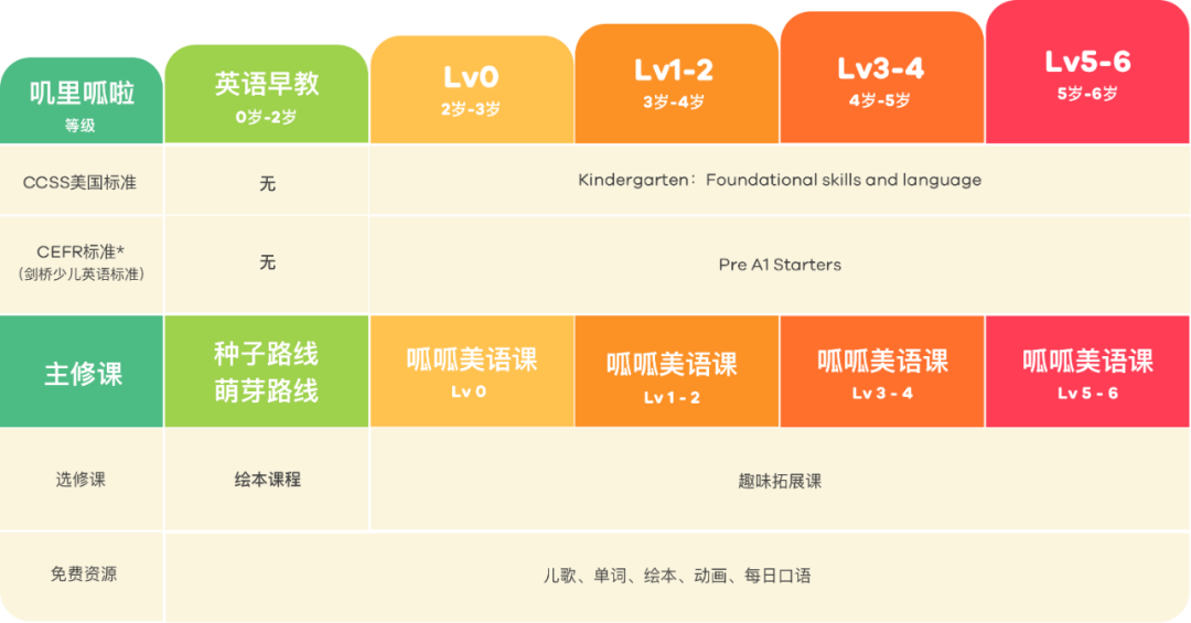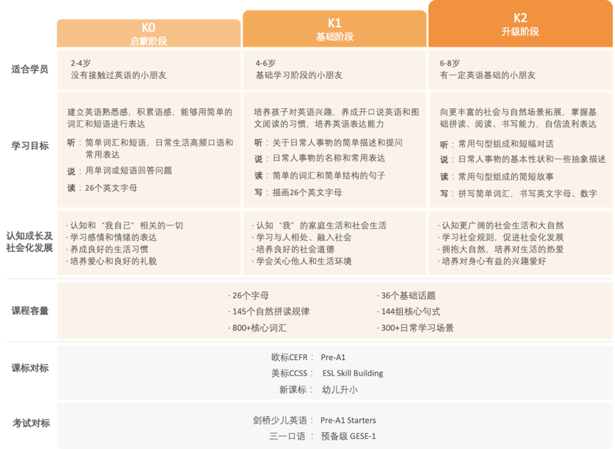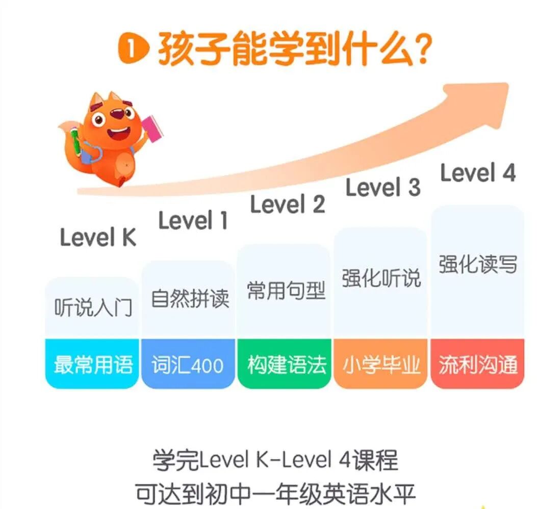 从2岁开始正式进入英语学习课程,从0级别到5-6级别。每天10分钟,每周4次课,一个级别共23周,学完一个级别可以进入下一个级别。号称是学完所有级别可以达到小学毕业水平的90%。这个我没上过,没有啥发言权。