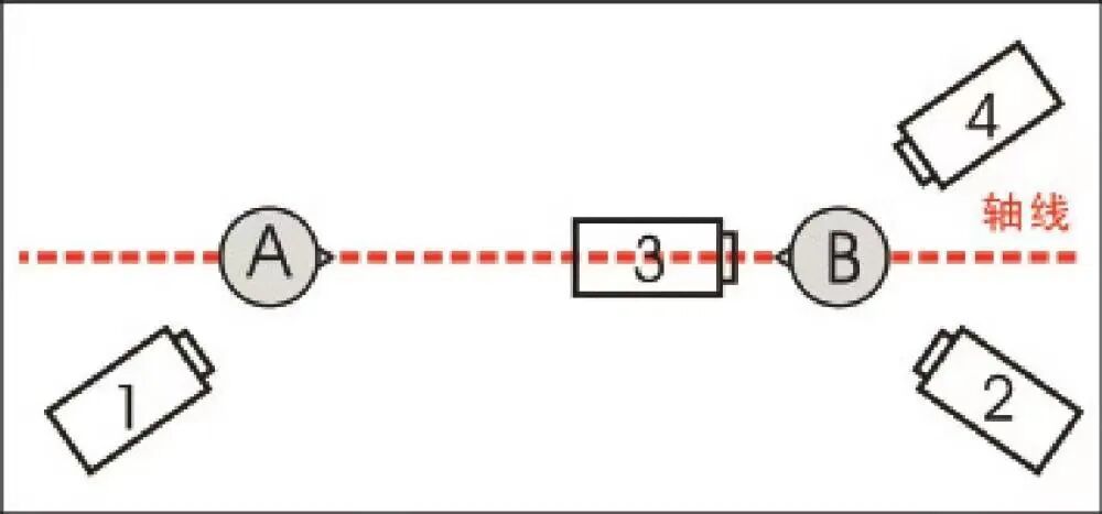 跳轴图1 中性镜头越轴示意图,其中第1、第2个镜头为对应的过肩镜头,第3个镜头是中性镜头,第4个镜头为越过轴线的镜头