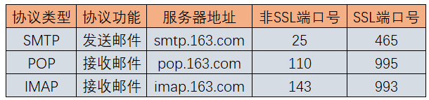 3.163邮箱163邮箱 服务器地址 非SSL SSL IMAP 143 993 POP 110 995 SMTP 25 465/994 qq邮箱 服务器地址 非SSL SSL IMAP 143 993 POP 110 995 SMTP 25 465/587