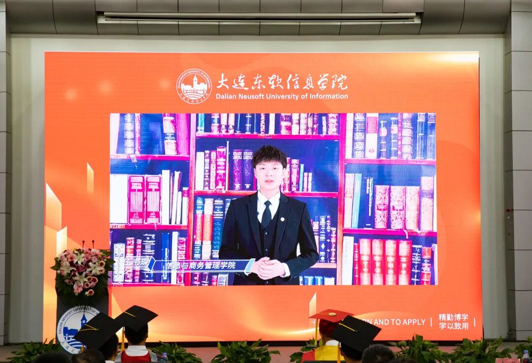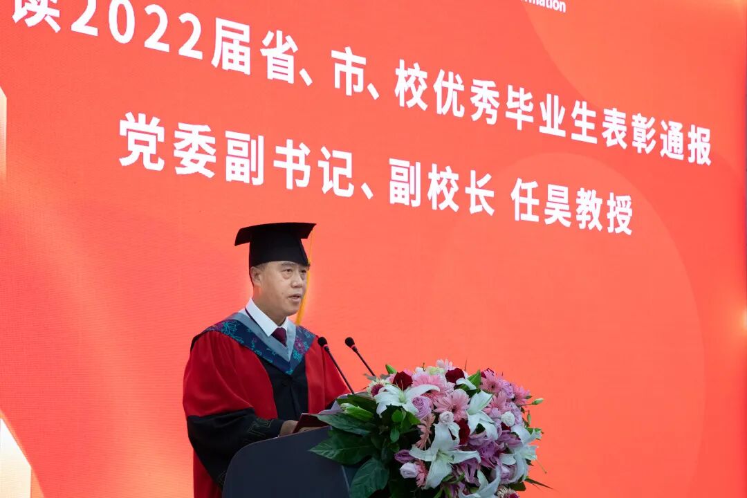 党委副书记、副校长任昊教授宣读学校2022届辽宁省、大连市、学校优秀毕业生表彰通报。信息与商务管理学院毕业生王书琛代表2022届毕业生发言。他首先代表全体毕业生向母校的培养表示感谢。在讲话过程中,他分享了自己的大学经历和成长感悟,并表示将会把母校授予的专业知识和技能投入到祖国的现代化建设中去,为实现中华民族伟大复兴不断奋斗,充分彰显大东软青年的责任担当。