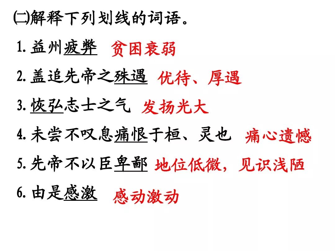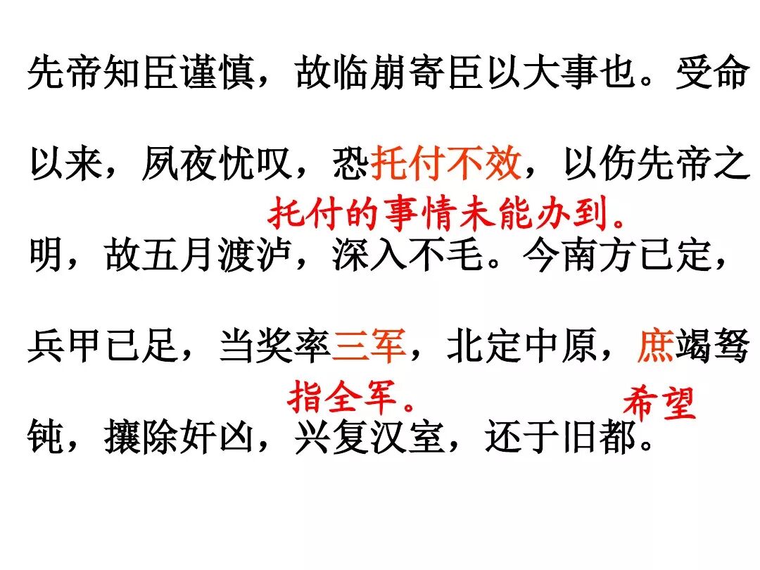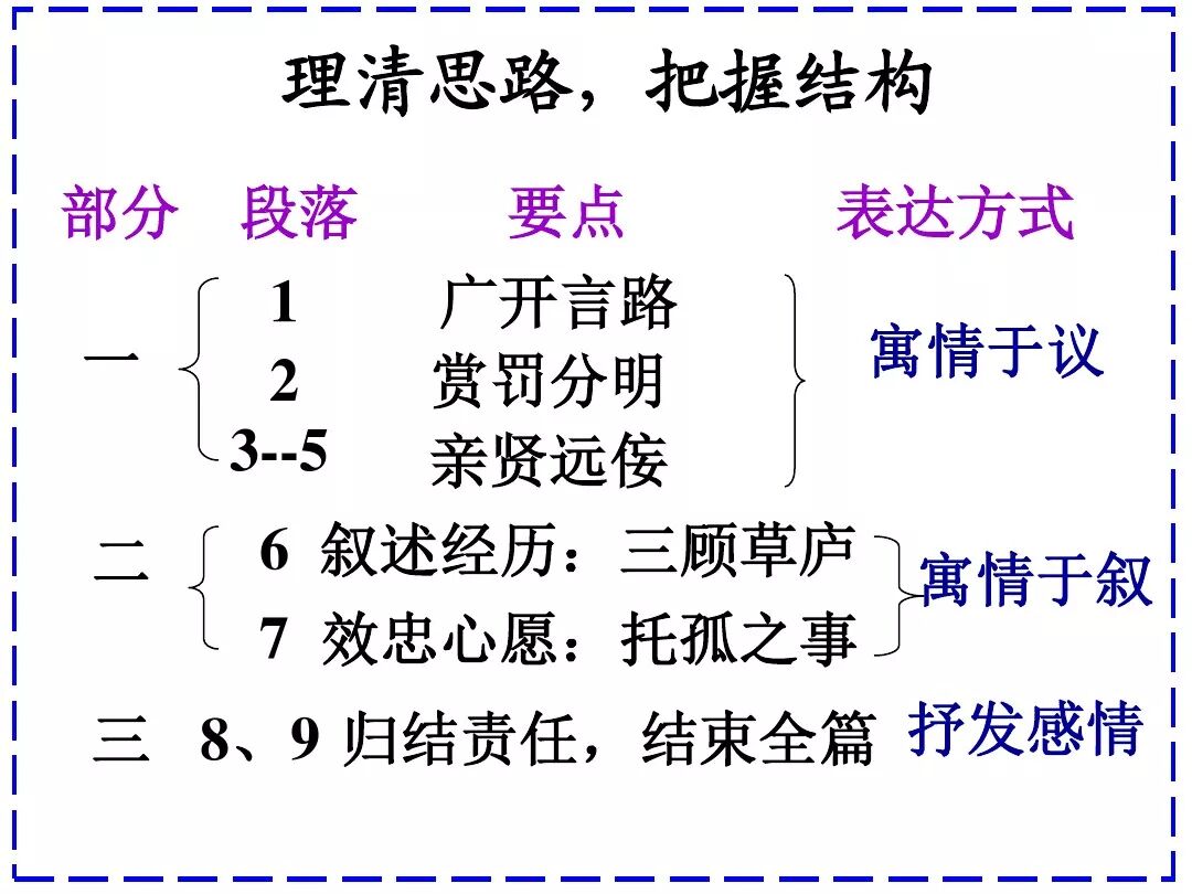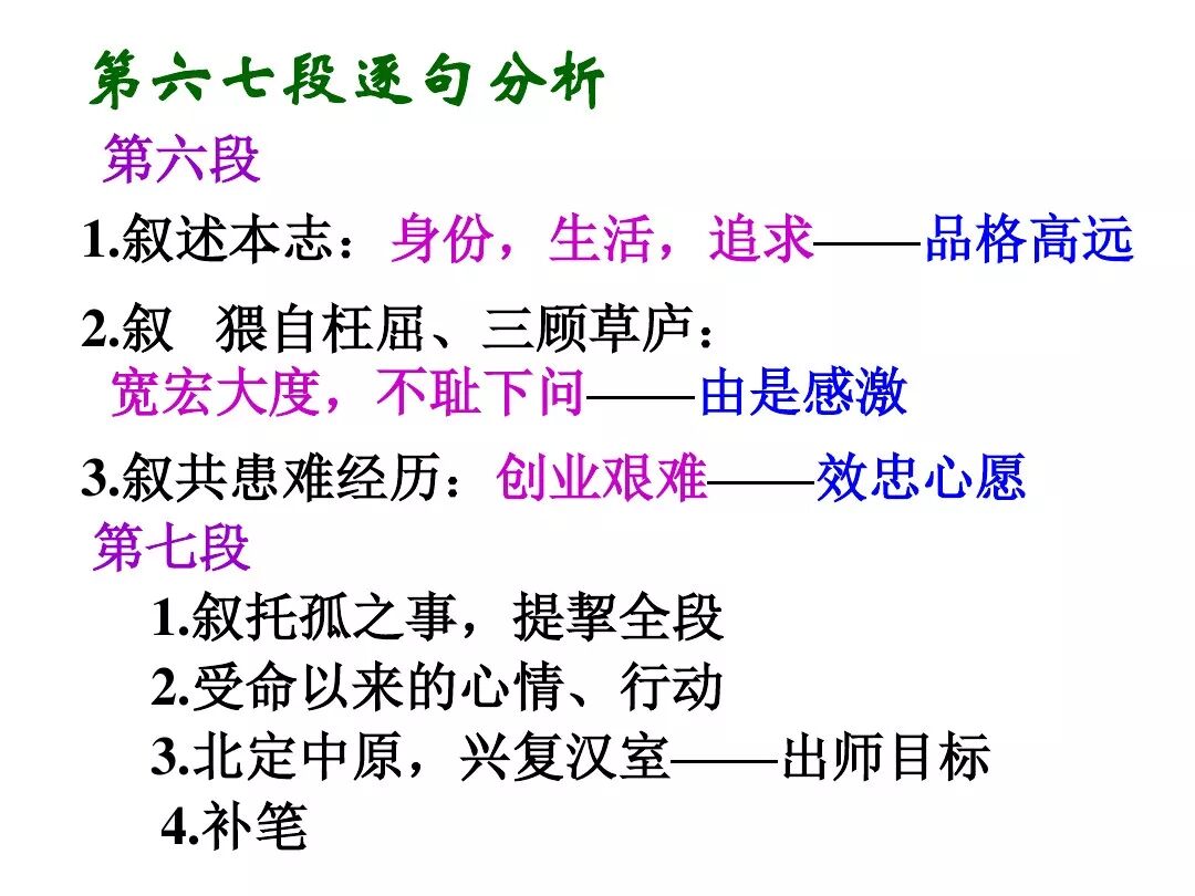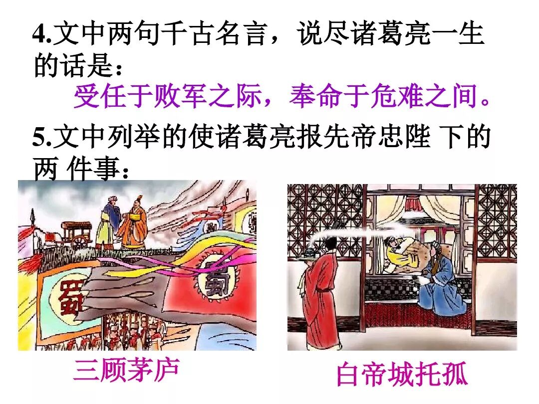 3、文中回顾了三顾茅庐和临崩托孤两件事,表达了受恩感激之情。