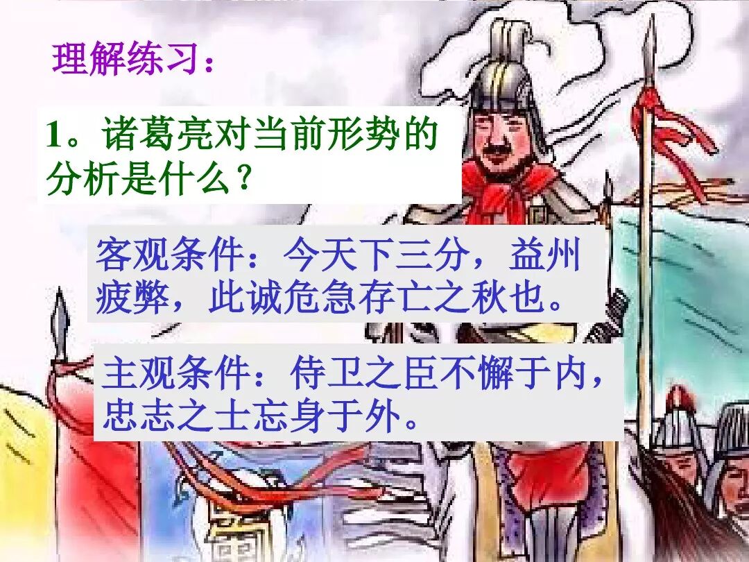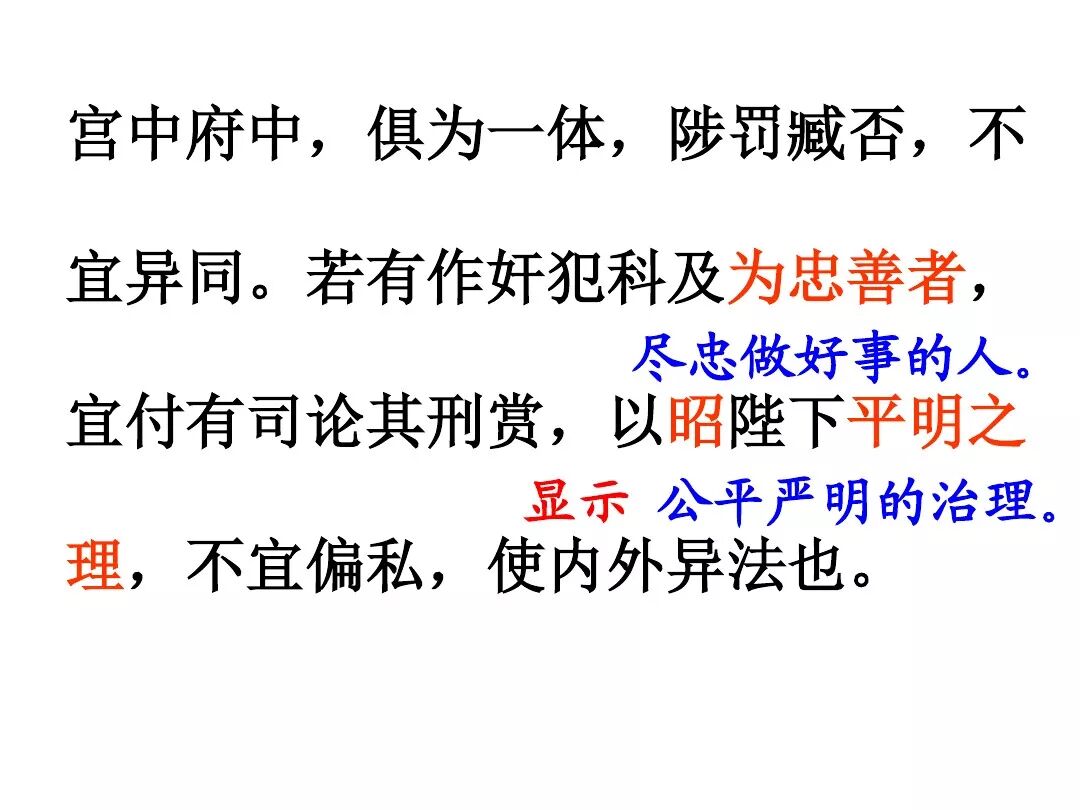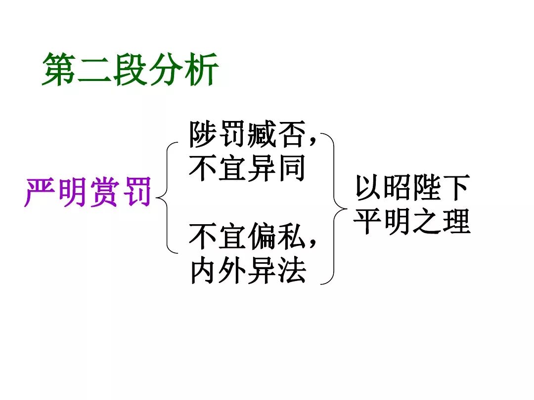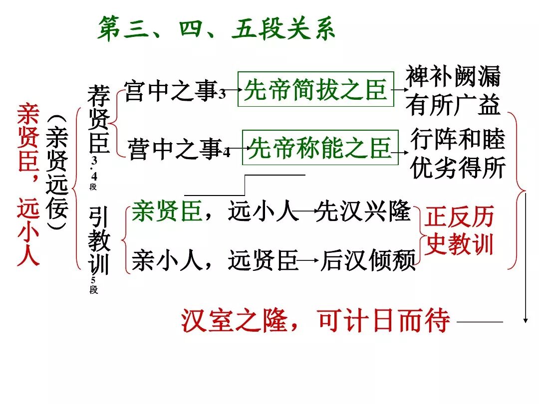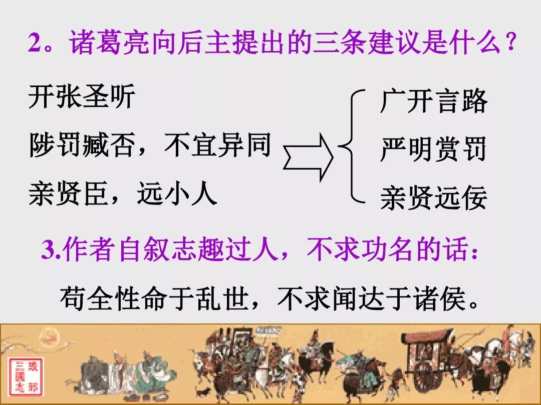 4、诸葛亮文中向后主刘禅提出了三条建议:①广开言路(开张圣听);②严明赏罚(陟罚臧否,不宜异同);③亲贤远佞(亲贤臣远小人)。其中最主要的一条是:亲贤远佞(亲贤臣,远小人)。这是关系到国家存亡的根本,是三项建议的核心。
