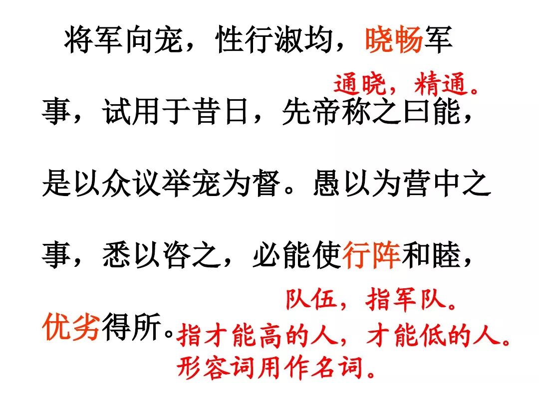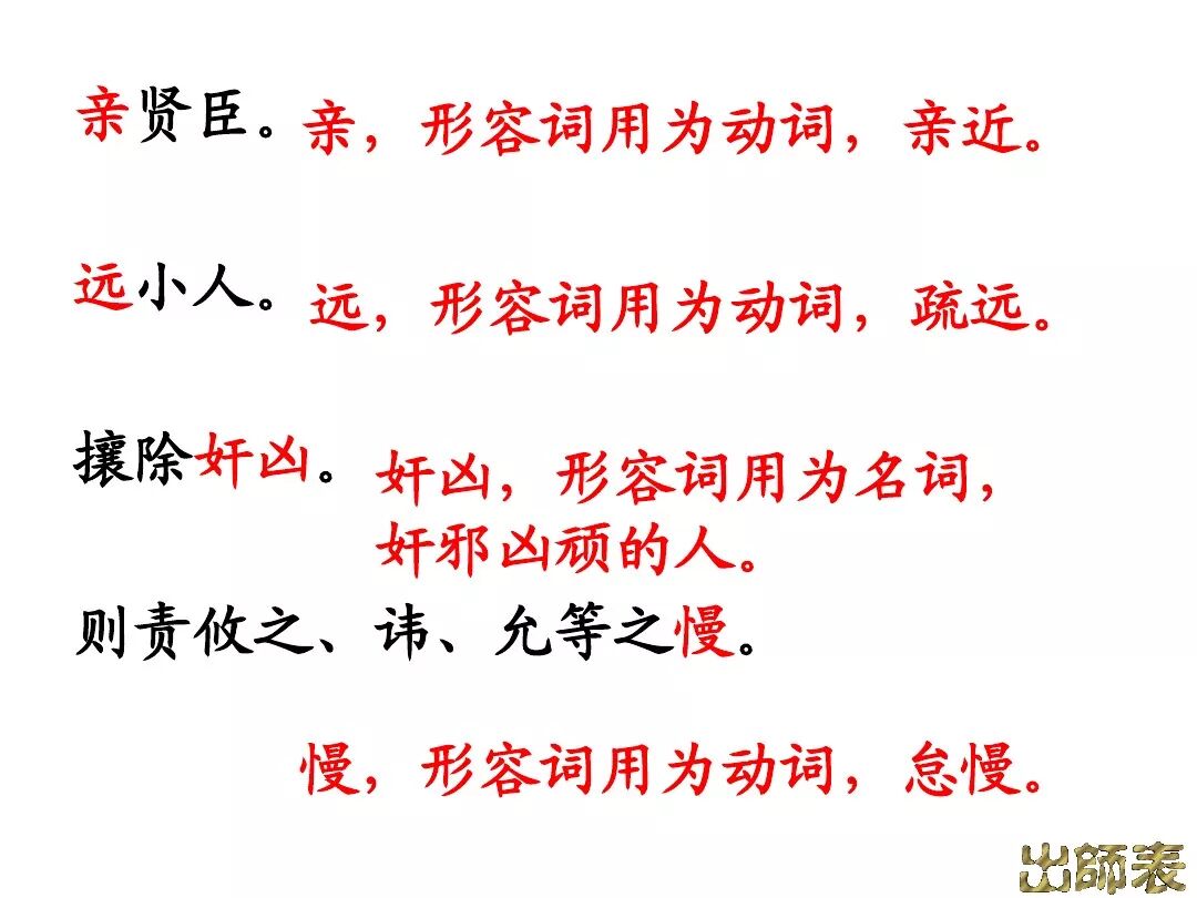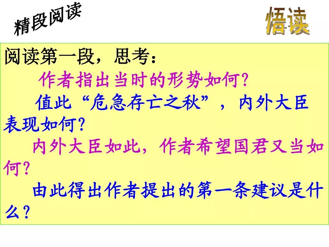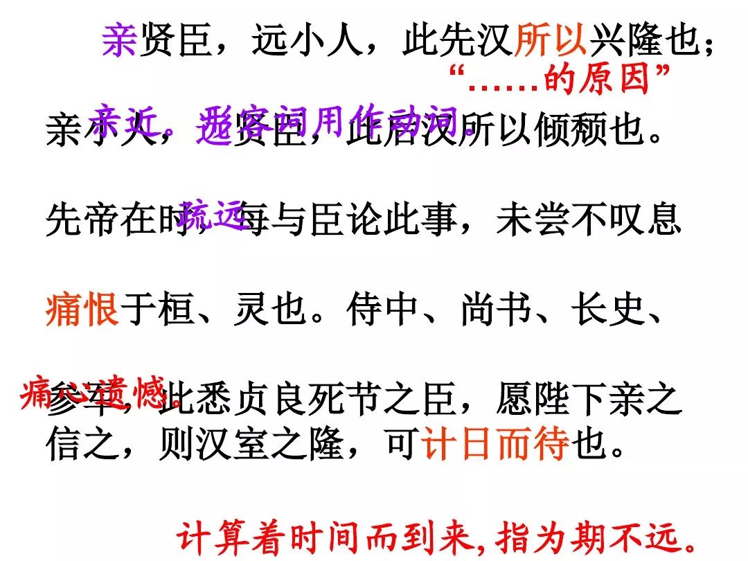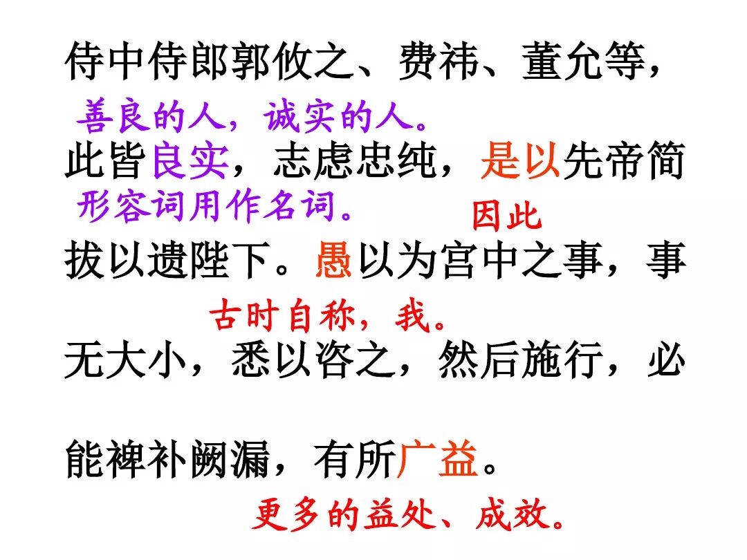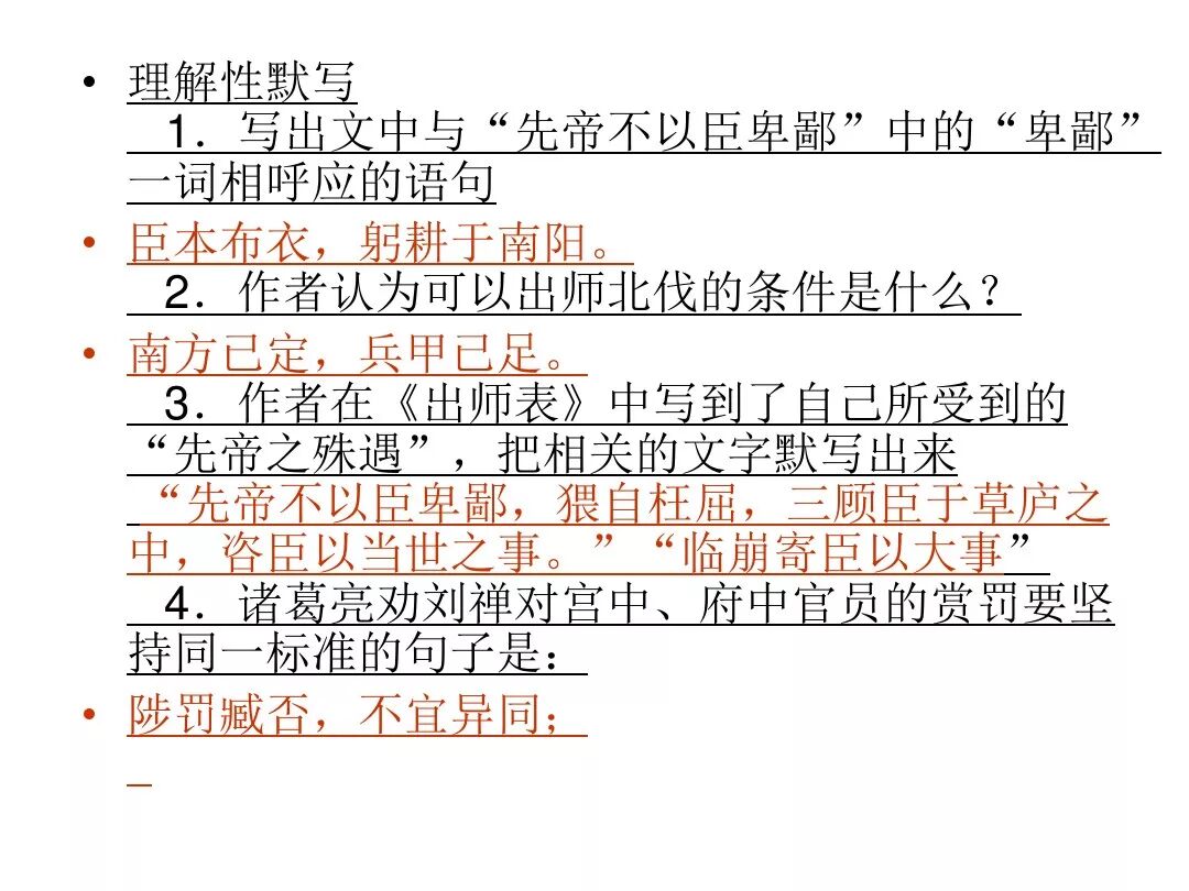 4、诸葛亮文中向后主刘禅提出了三条建议:①广开言路(开张圣听);②严明赏罚(陟罚臧否,不宜异同);③亲贤远佞(亲贤臣远小人)。其中最主要的一条是:亲贤远佞(亲贤臣,远小人)。这是关系到国家存亡的根本,是三项建议的核心。